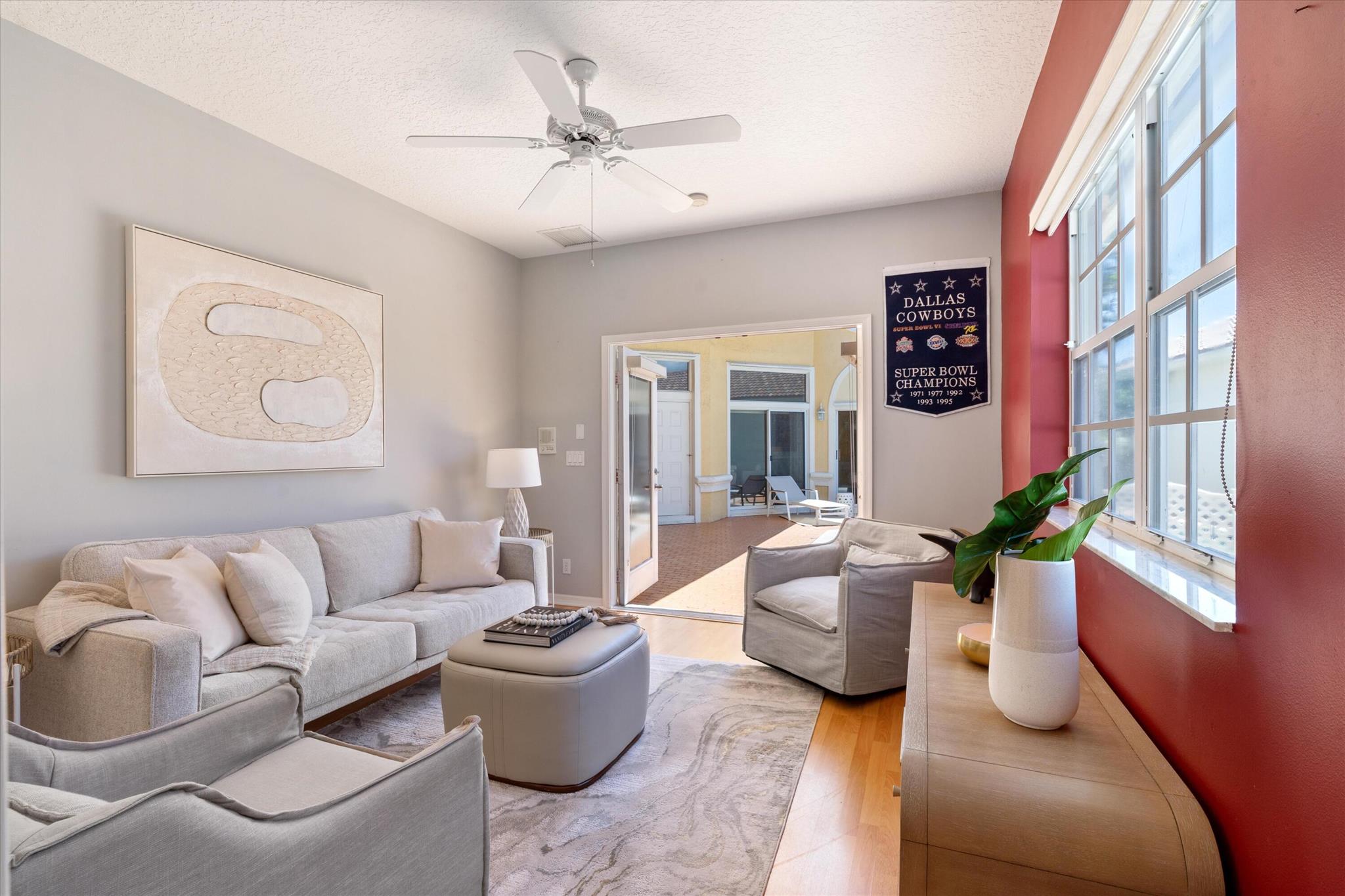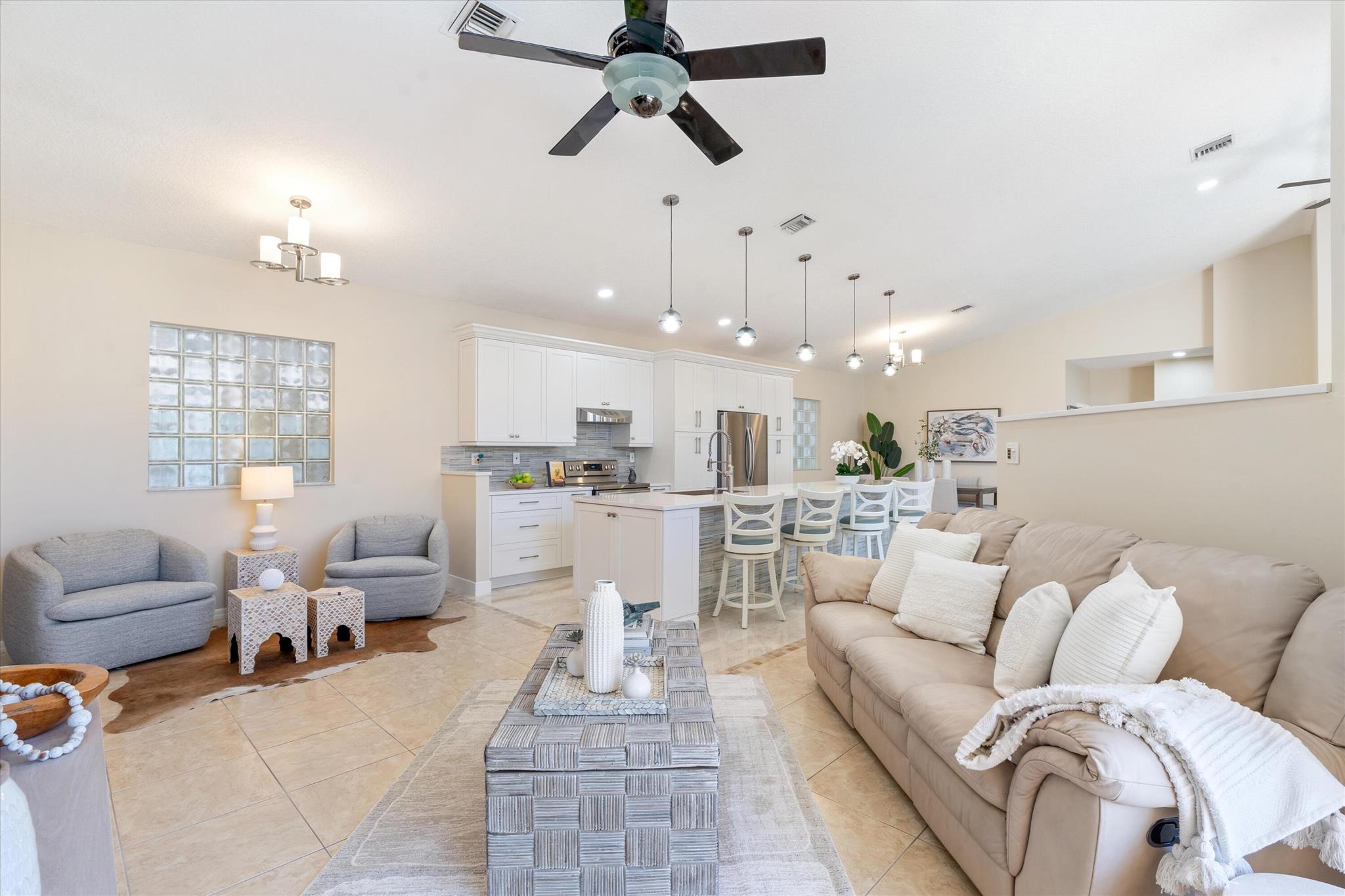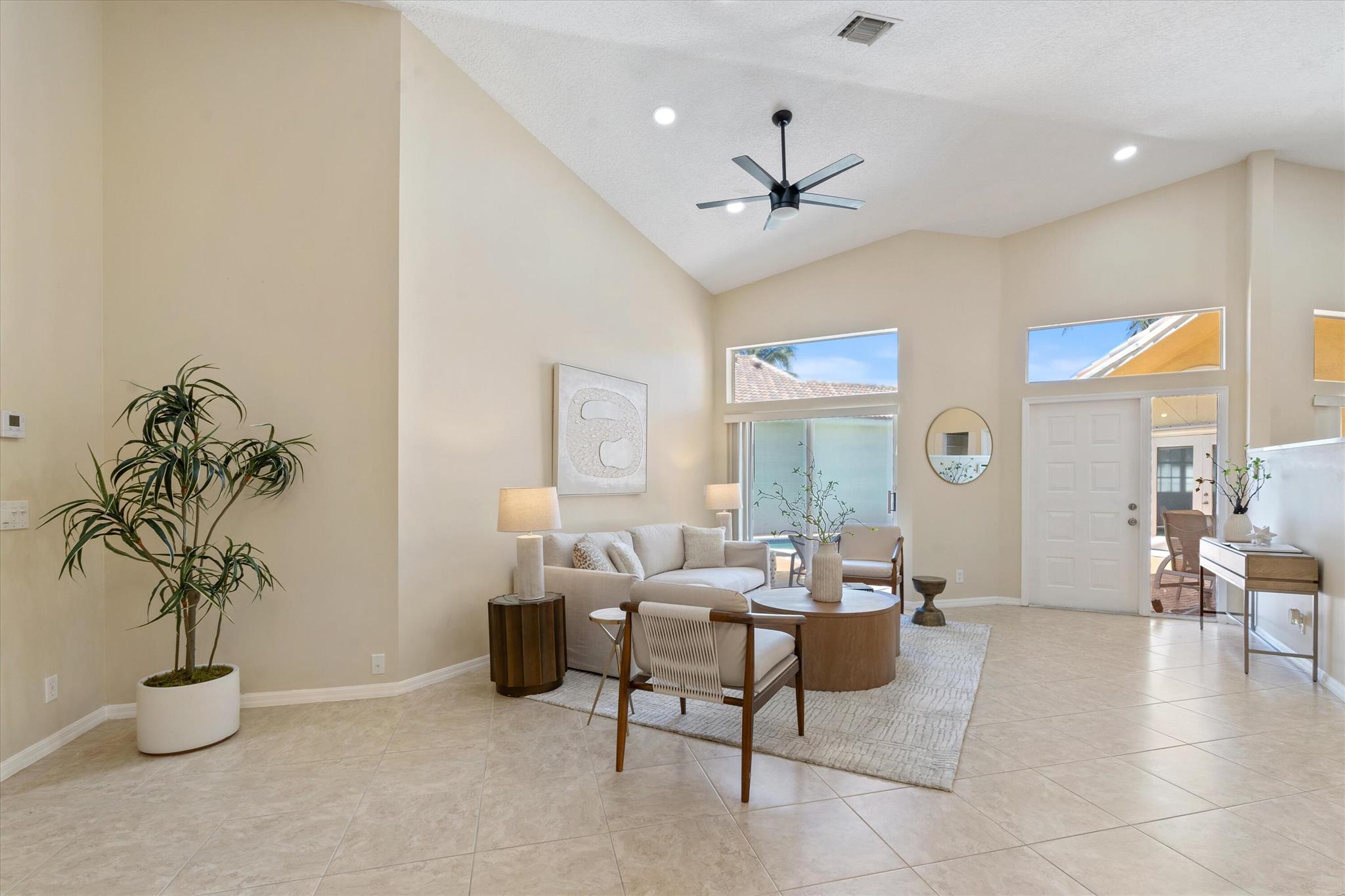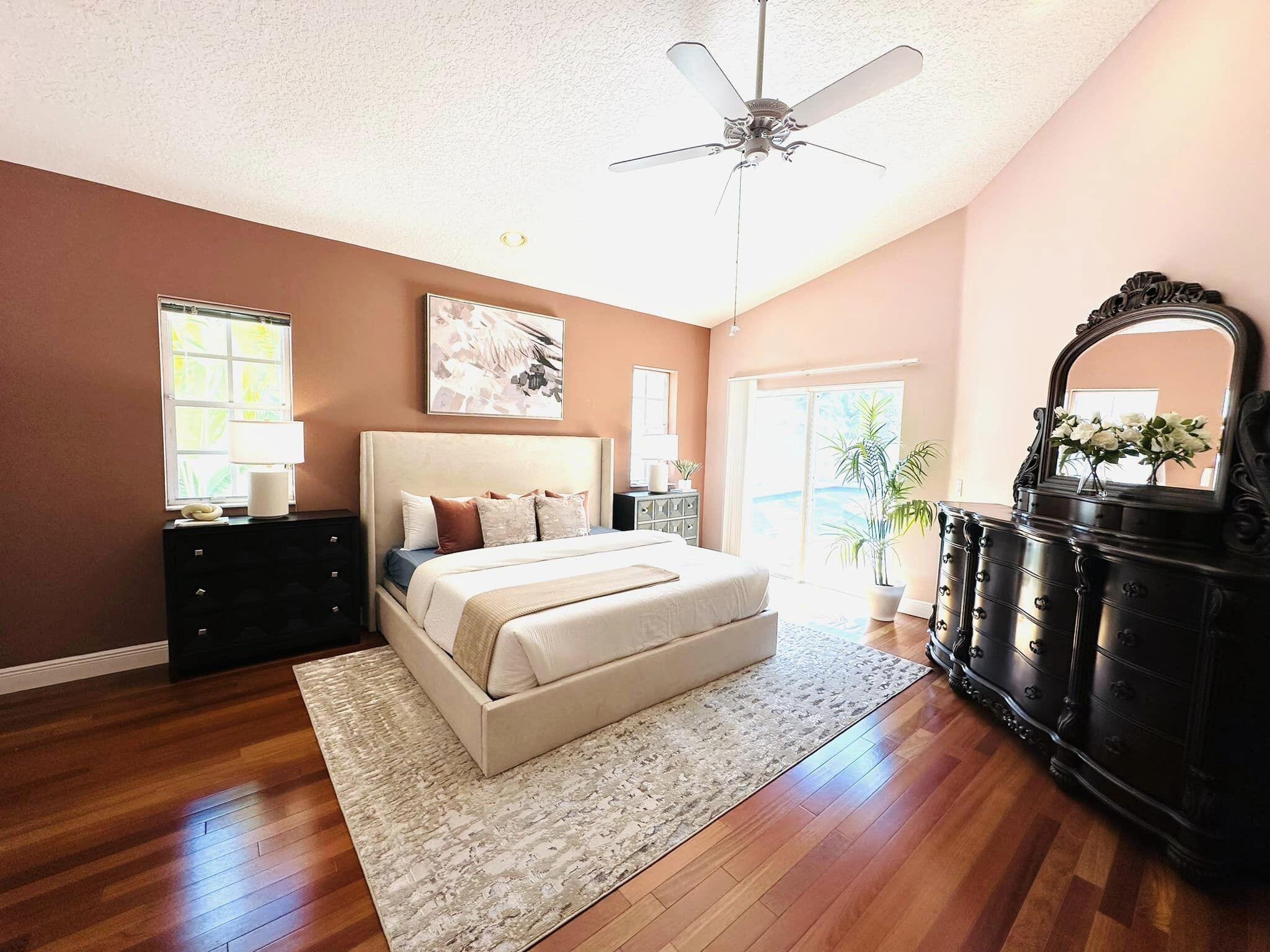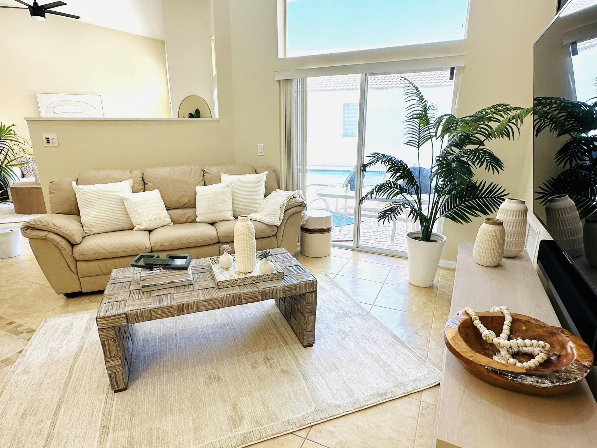 3 bedroom 3 bath courtyard pool home includes a mother in law suite. NEW roof May 2024, updated kitchen, and bathrooms within the last 4 years. Single-story home, gated community of only 41 homes, saltwater lap pool and low HOA dues. Newer AC and a newer hot water heater. Surrounded by a privacy fence, and offers a tranquil outdoor space. Inside, the open concept floor plan coupled with vaulted ceilings and Brazilian hardwood, tile, and laminate flooring that enhance the spacious living area. The sale includes the three TVs and additional surround sound speaker located in the dining room area.