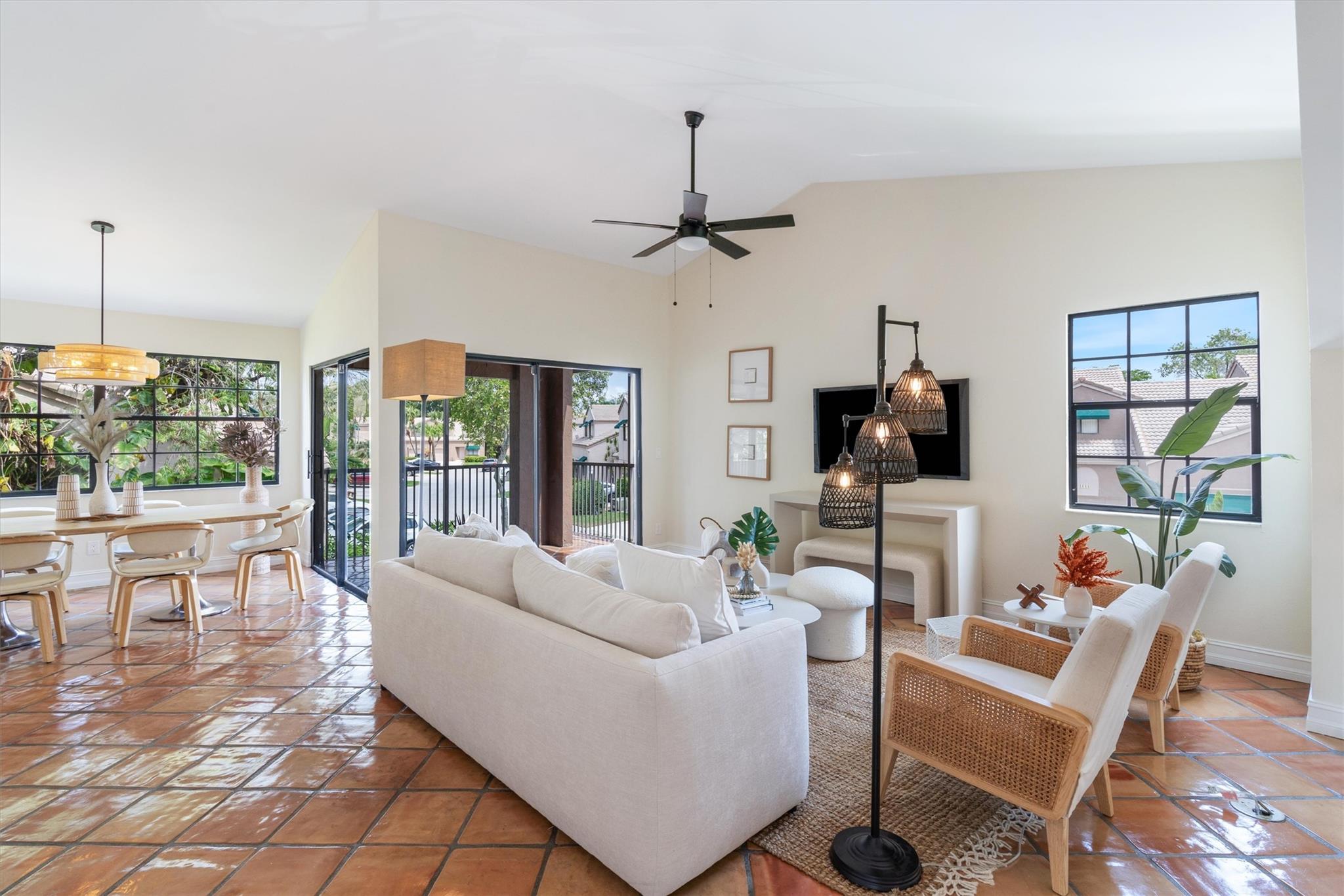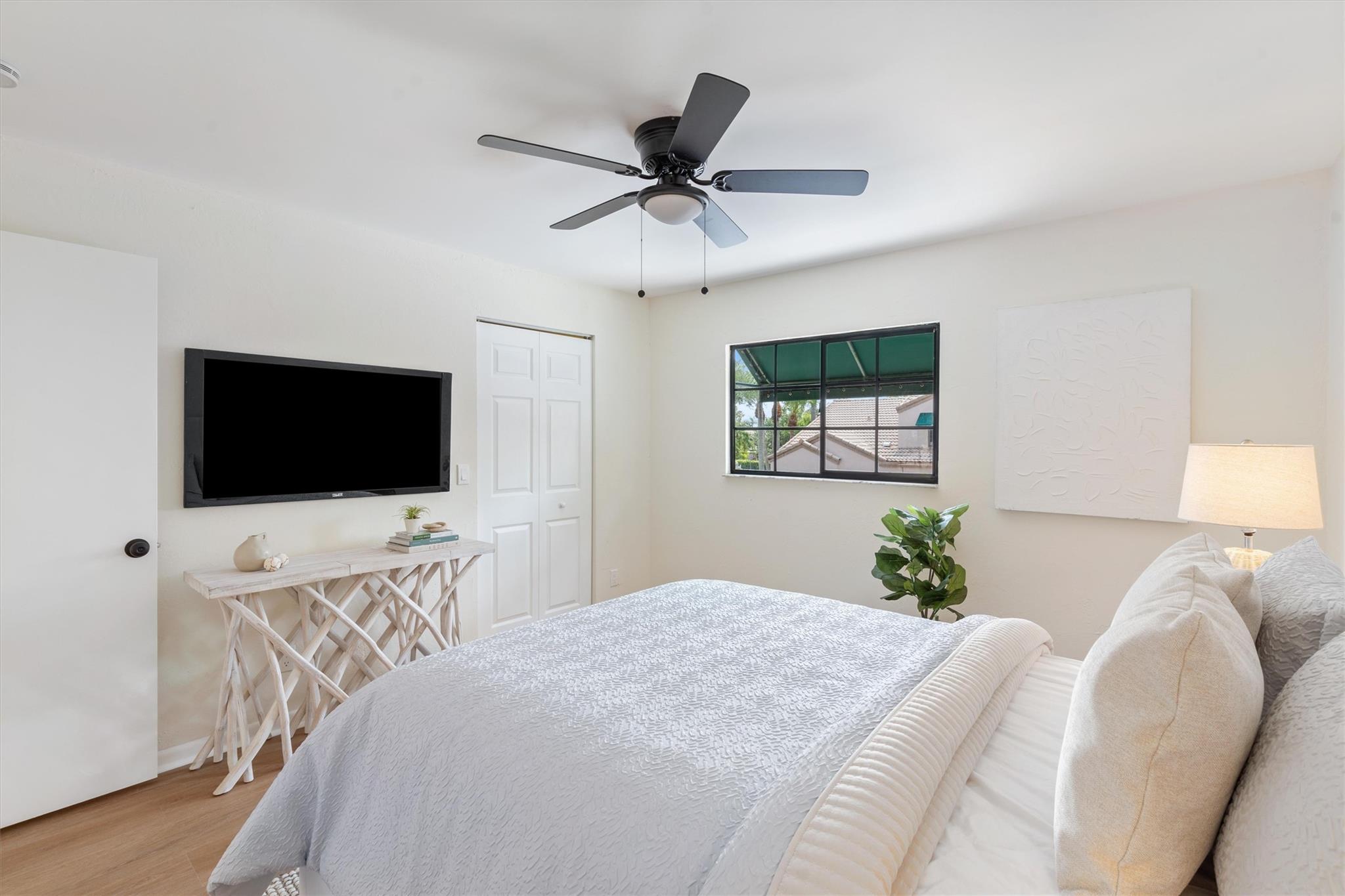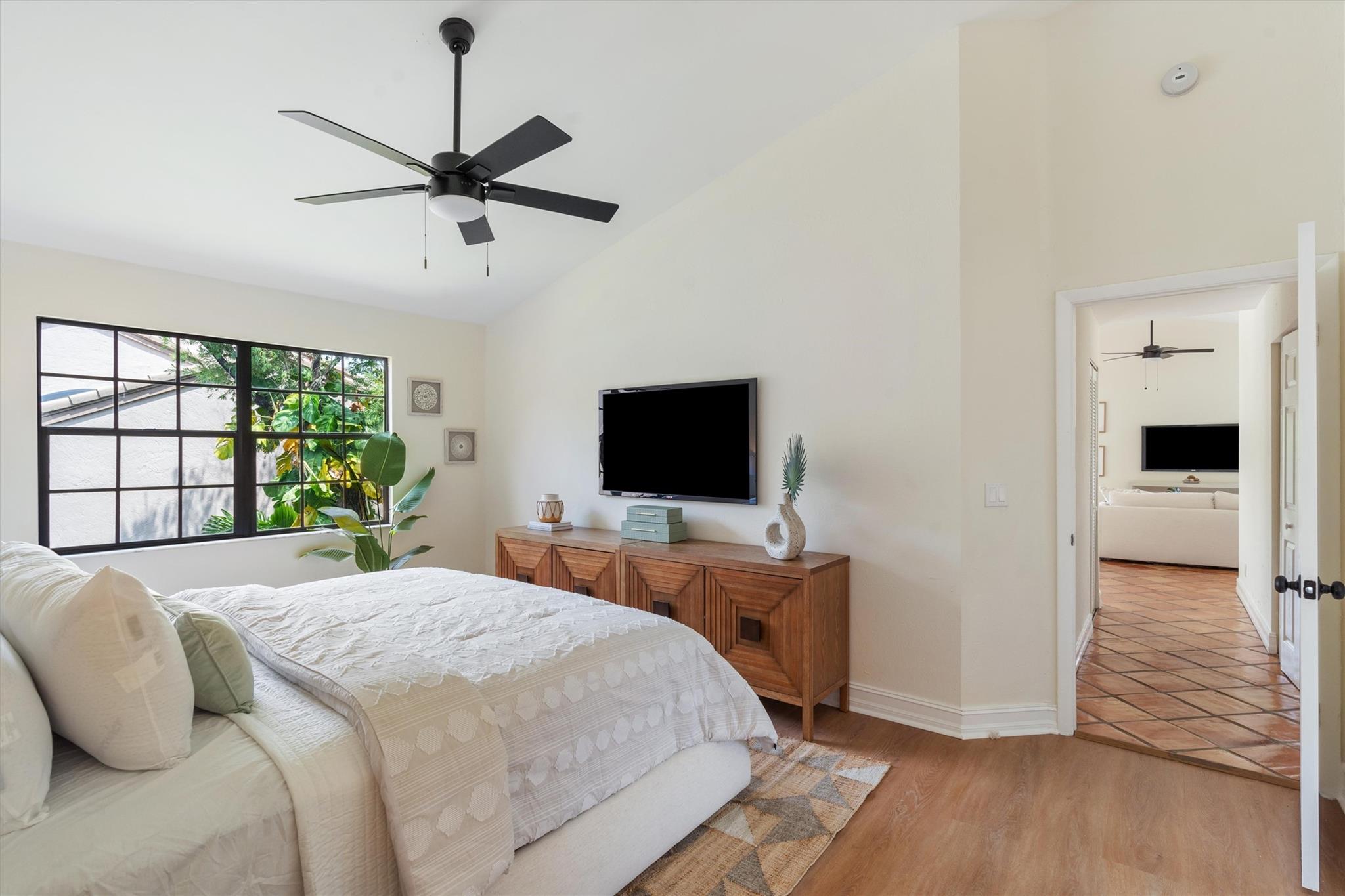 This captivating home exudes charm and tranquility. Newly renovated corner townhouse is warm and inviting. Boasting fresh paint, waterproof wood flooring in bedrooms and baths, and timeless clay tile in the living space. New kitchen features solid wood shaker cabinetry, quartz counters, high-end stainless appliances, and a spacious pantry. New designer lighting, fans, mirrors, showers, toilets, vanities and stunning double master vanity. Luxurious touches include an oversized shower with a new glass enclosure. Enjoy the newer high-efficiency A/C system and spacious layout with vaulted ceilings, walk-in closets, and a large master suite. Large covered lanai for outdoor entertainment. Even the garage is freshly painted. One year association dues paid by seller with full price offer!