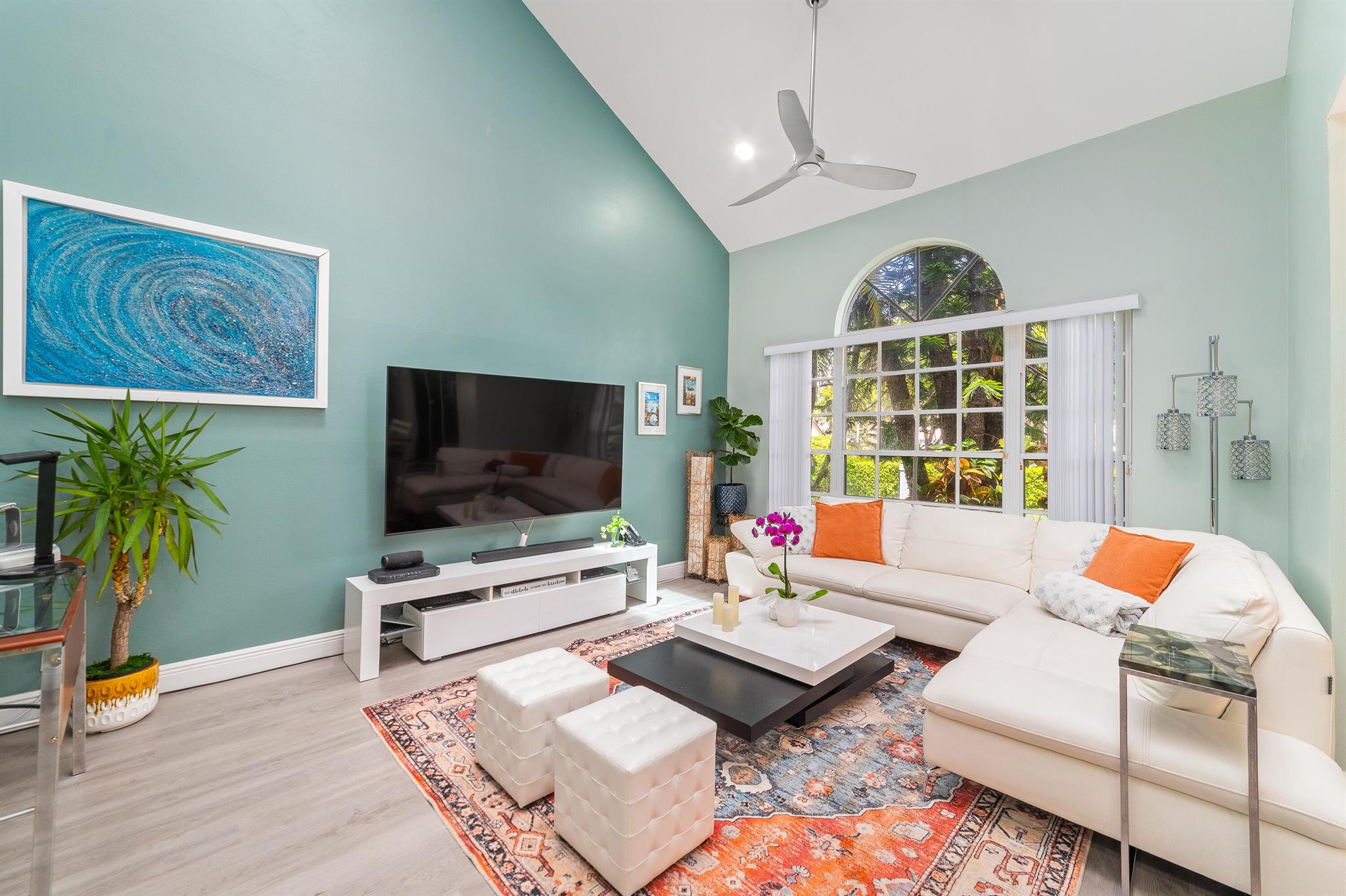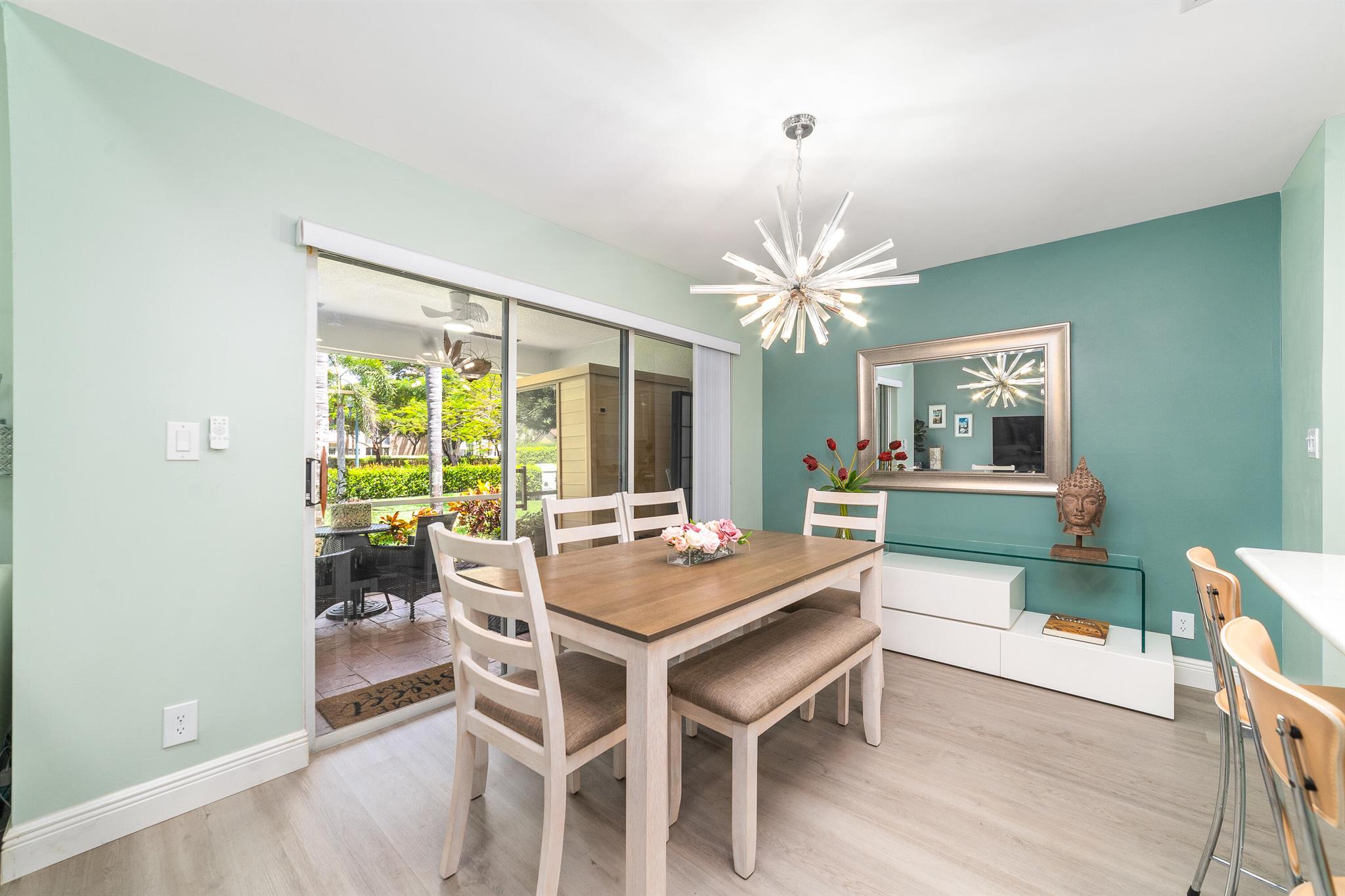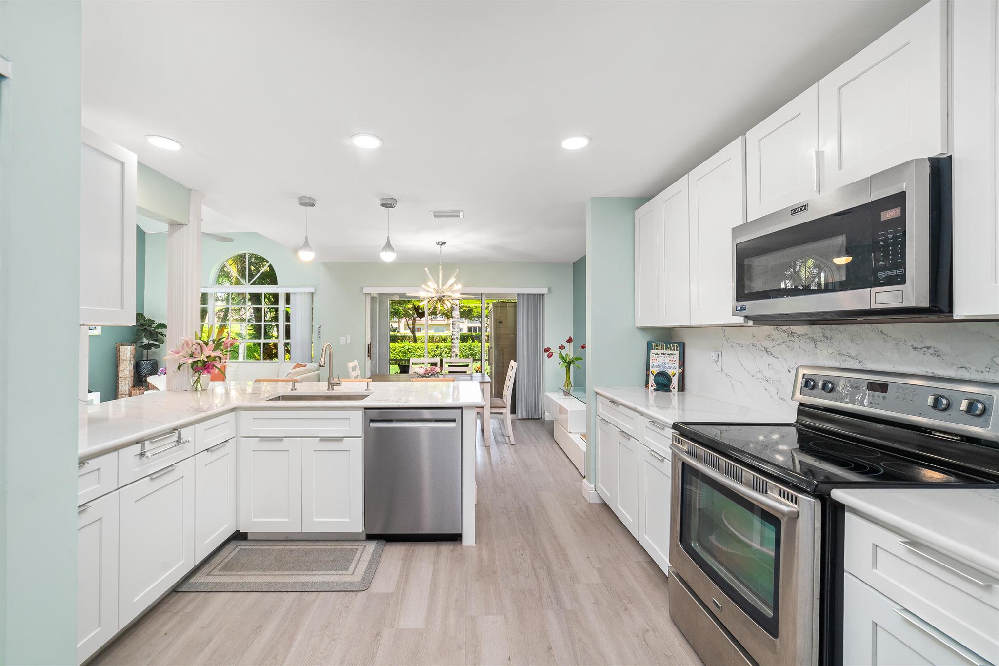 Presenting a stunning and charming 3-bedroom, 2 1/2 bathroom townhome nestled in the prestigious Greens subdivision of Boca Golf & Tennis Club. This meticulously renovated residence exudes sophistication and elegance, boasting upgraded quartz countertops, new cabinets, and stainless-steel appliances in the kitchen, which seamlessly opens to the dining area flooded with natural light. The airy and luminous interior features high vaulted ceilings and expansive windows that create a welcoming ambiance throughout. Recent upgrades include a new roof, new engineered hardwood flooring throughout the entire home, and all bathrooms are completely and tastefully remodeled. Enjoy outdoor living in the screened lanai accessible through sliding glass doors from the kitchen. The laundry area, equipped