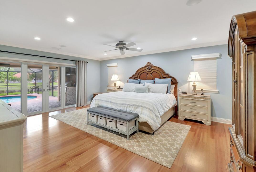 LOCATION, LOCATION, LOCATION, 4/3 single-level waterfront pool home in Woodfield Hunt Club. Open split floor plan living with wide lake views. House has all impact glass windows, sky lights and French doors, solid-core doors, oversized laundry room, custom gourmet kitchen, wireless alarm, custom closets, 2-zone AC, fireplace. newer roof, fenced yard, lush landscaping with fruit trees, oversized circular driveway for 9 cars and a large screened lanai with summer kitchen, pool and spa. Family neighborhood has 2 attended-entry gates, 24-hour security, 2 playgrounds, 6 tennis courts, basketball courts, clubhouse and fitness center. Convenient to I-95 and Turnpike, Spanish River High, Omni Middle and St. Andrews School.