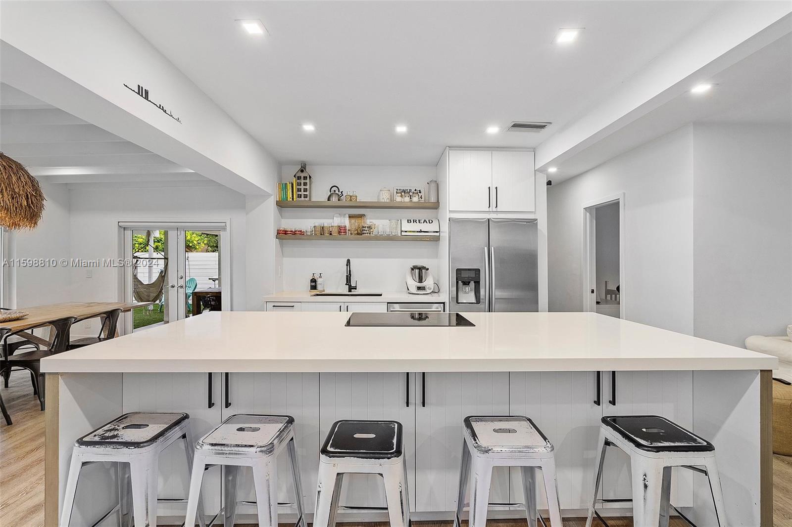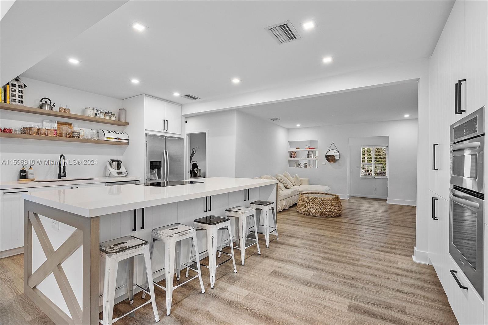 Ready to move in. Charming fully remodeled 5-Bedroom Key Biscayne mackle home This beautiful 5-bedrooms and 3.5 bathrooms residence in the exclusive and prestigious island of Key Biscayne has recently undergone a complete transformation, resulting in a cozy and inviting home. It has over 2,000 sqft of living space with a well-designed open floor layout that seamlessly blends comfort and coastal decoration. Key Features: Spacious Layout: the open floor plan ensures a seamless flow throughout the house, creating an inviting atmosphere for family gatherings and entertaining. Heart of the Home: a white modern kitchen, centrally located, is a true highlight. It has been meticulously designed with a big island in the middle and ample storage.