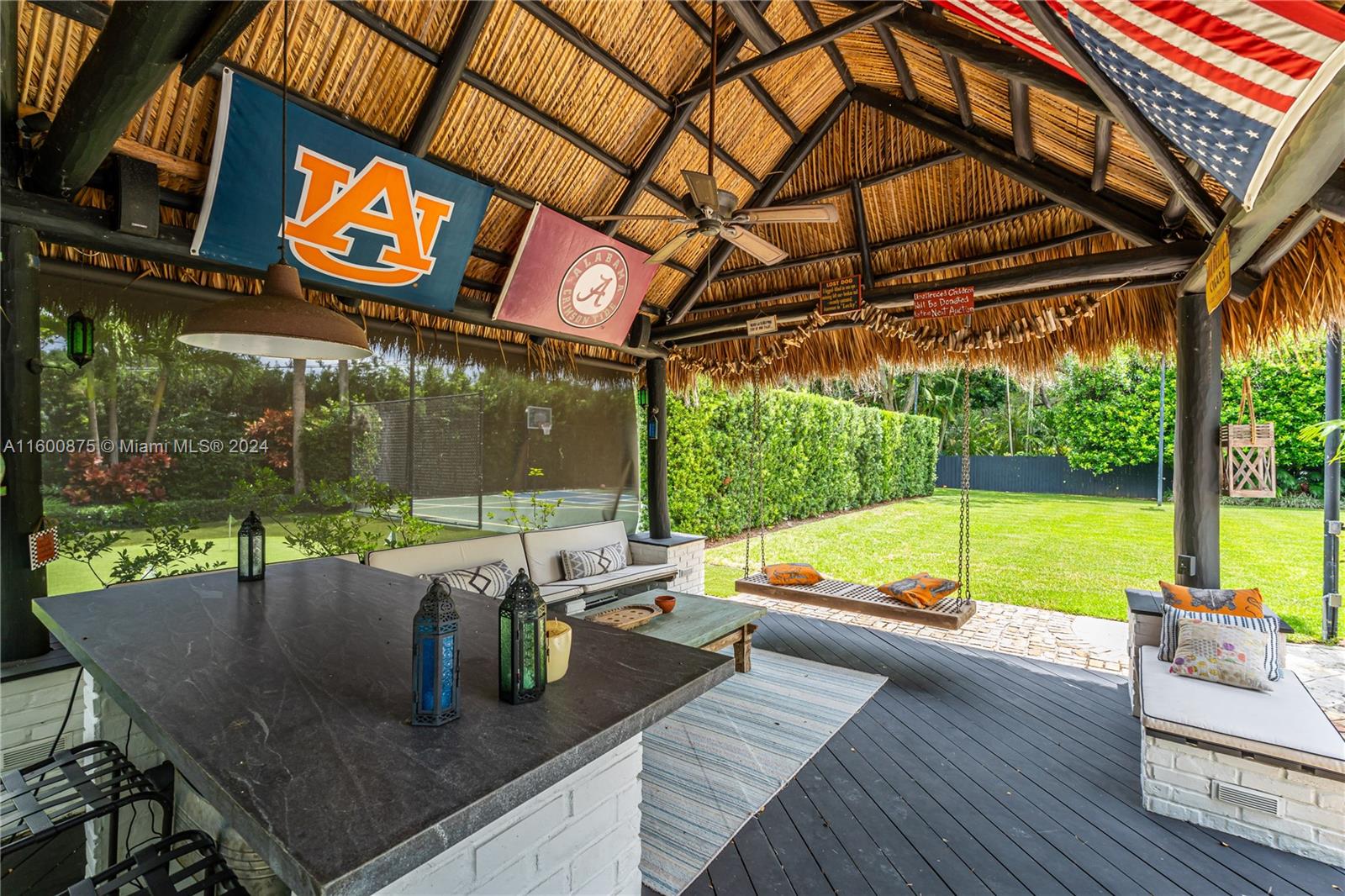 Located on a tranquil, tree-lined street in Pinecrest, this impressive gated home features 8 bedrooms and 6 bathrooms on a 40,336 square foot lot. The welcoming entry leads to a spacious 10,694 square foot interior with soaring ceilings. The eat-in kitchen, with top-of-the-line appliances and a large island, flows into the family room. The formal dining room includes a custom temperature-controlled 2,000-bottle wine cellar. The primary bedroom offers walk-in closets and a private balcony with stunning backyard views. Outdoor amenities include a pool, outdoor kitchen, gazebo , basketball court, and putting green. Other Highlights are metal roof, guest quarters, a generator, and a 2-car garage. Don't miss out on this amazing property.