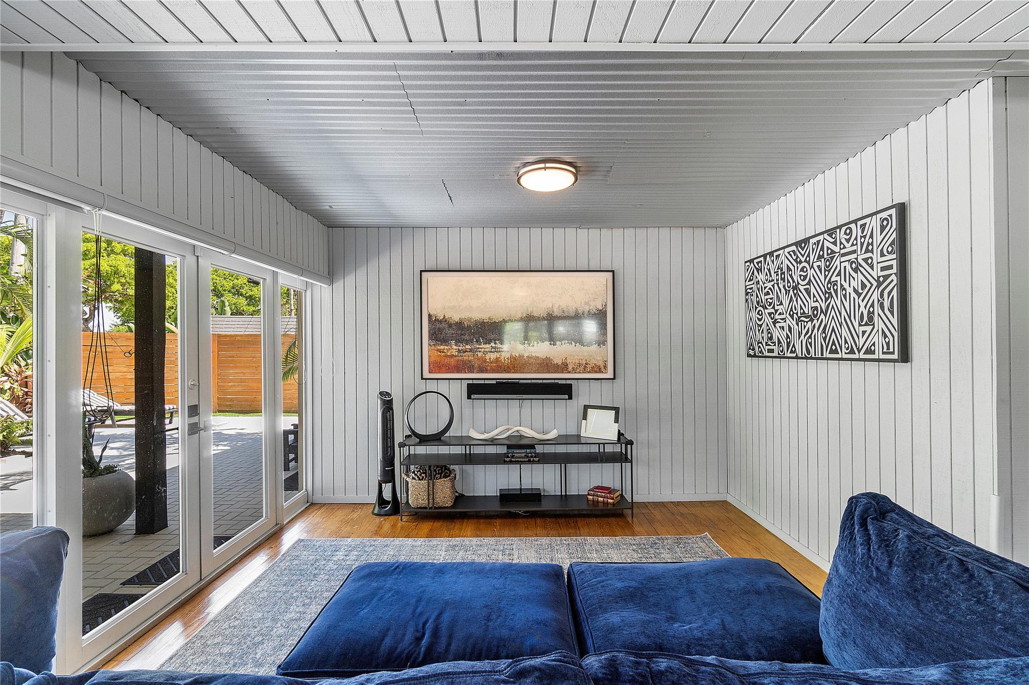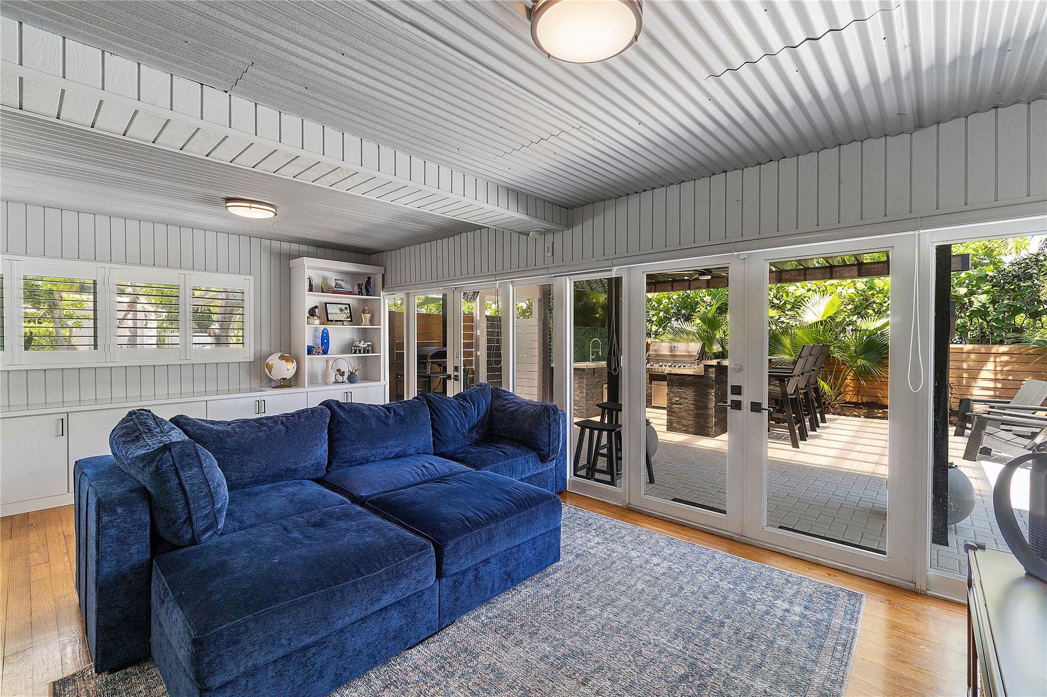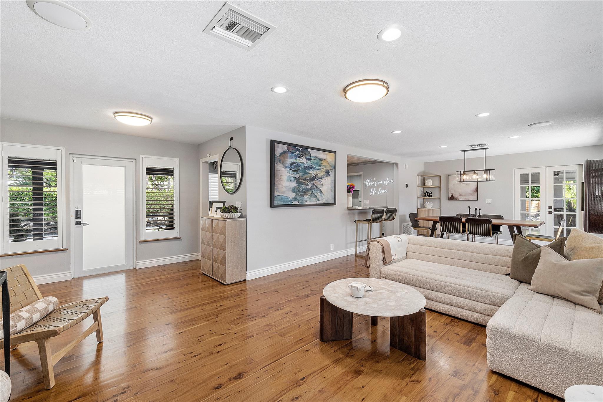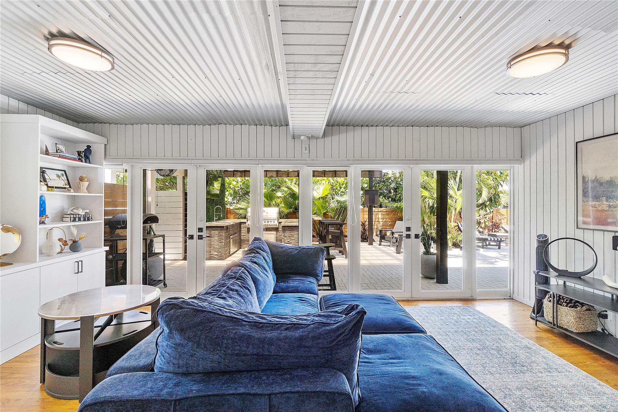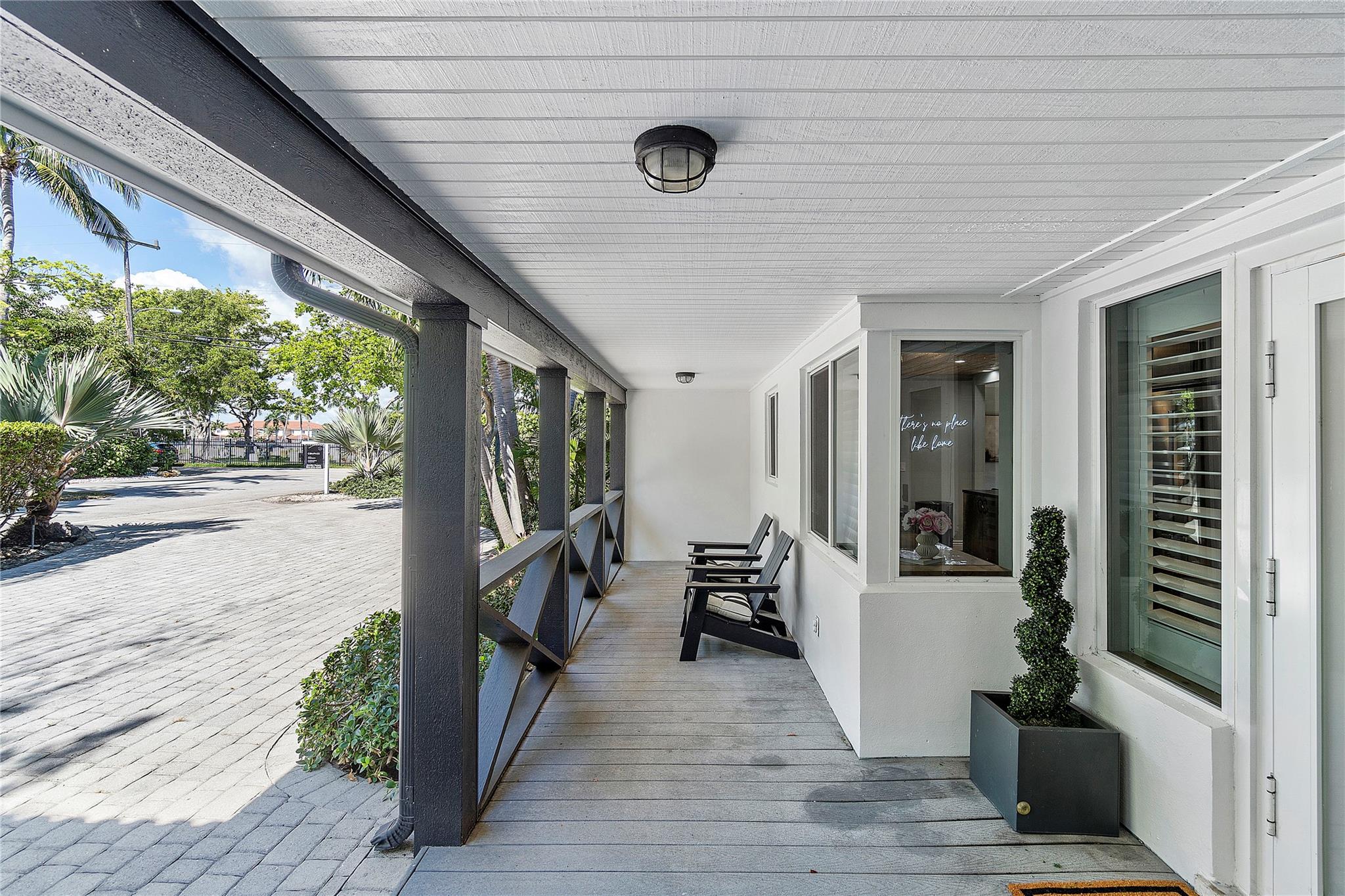 Step into this breathtaking, coastal-style home with modern updates nestled on a spacious, corner lot just 1 mile to the beach! This 3/3 home has superb curb appeal and plenty of parking with a large open front porch. Newly re-designed backyard includes: custom pergola with color changing lights, TV, kitchen with built-in Napoleon grill, granite counters, over 2,000 sf of pavers, fresh turf, fence & landscaping. All bathrooms have been remodeled. Two additional rooms include an office plus a den that can serve as MIL suite. Additional features include a new flat roof installed 2024, indoor laundry room, Australian Cypress flooring, plantation shutters, new water heater and 22kW generator connected to natural gas. Prime location home on quiet street close to beaches, restaurants & shopping.