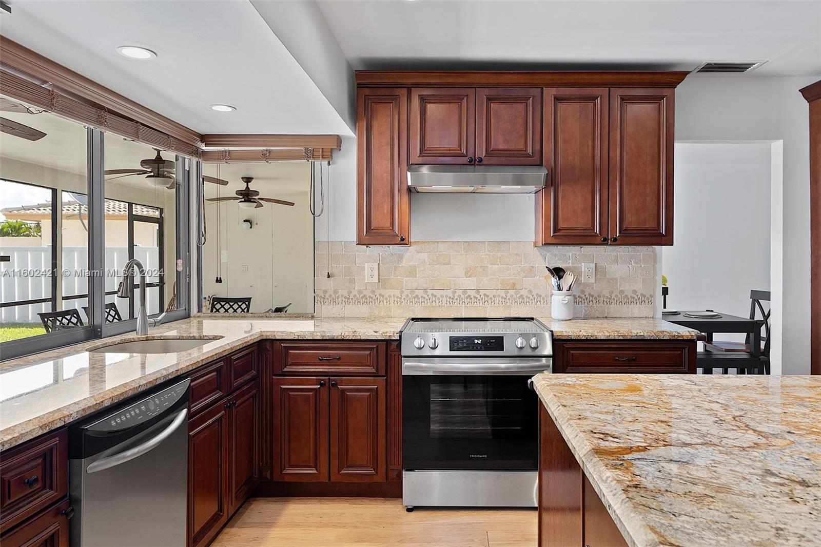 Buyer financing fell through. Welcome to this beautiful, spacious, well maintained home waiting for new family that will enjoy this spacious, inviting ambiance. Spanish Tiles & laminate floors, split bedrooms, NO HOA, large lot with waterfall pool, cabana bathroom well maintained screen covered patio for pool parties, Outdoor Shower with hot/cold water, storage for pool equipment, connections to customized your own outdoor kitchen. Interior Features includes Remodeled Kitchen with wood cabinets, granite Countertops, wine cooler, S Steel Appliances, Eat in Island, Master suite with step down shower, double sinks in bathrooms, 1/2 bathroom. Private front patio, large laundry room/tub. Pool/Garden view from all areas. Security cameras convey without DVR. Drapes & curtains do not convey