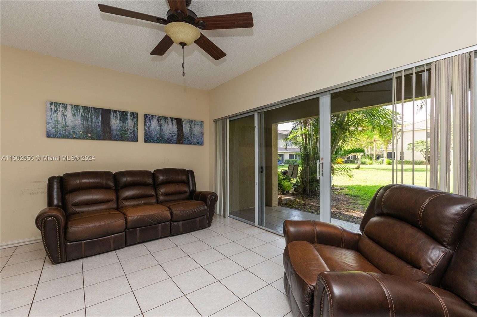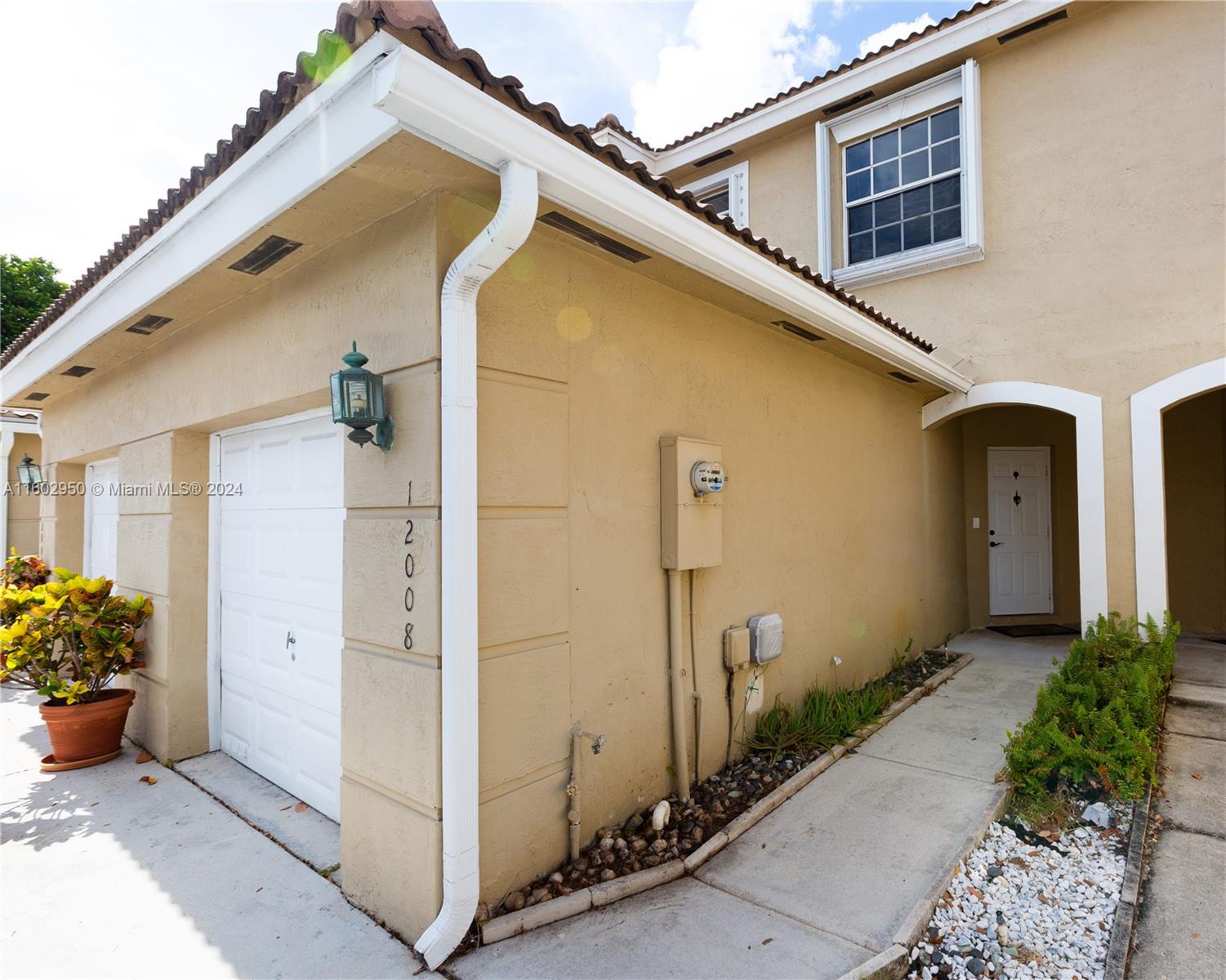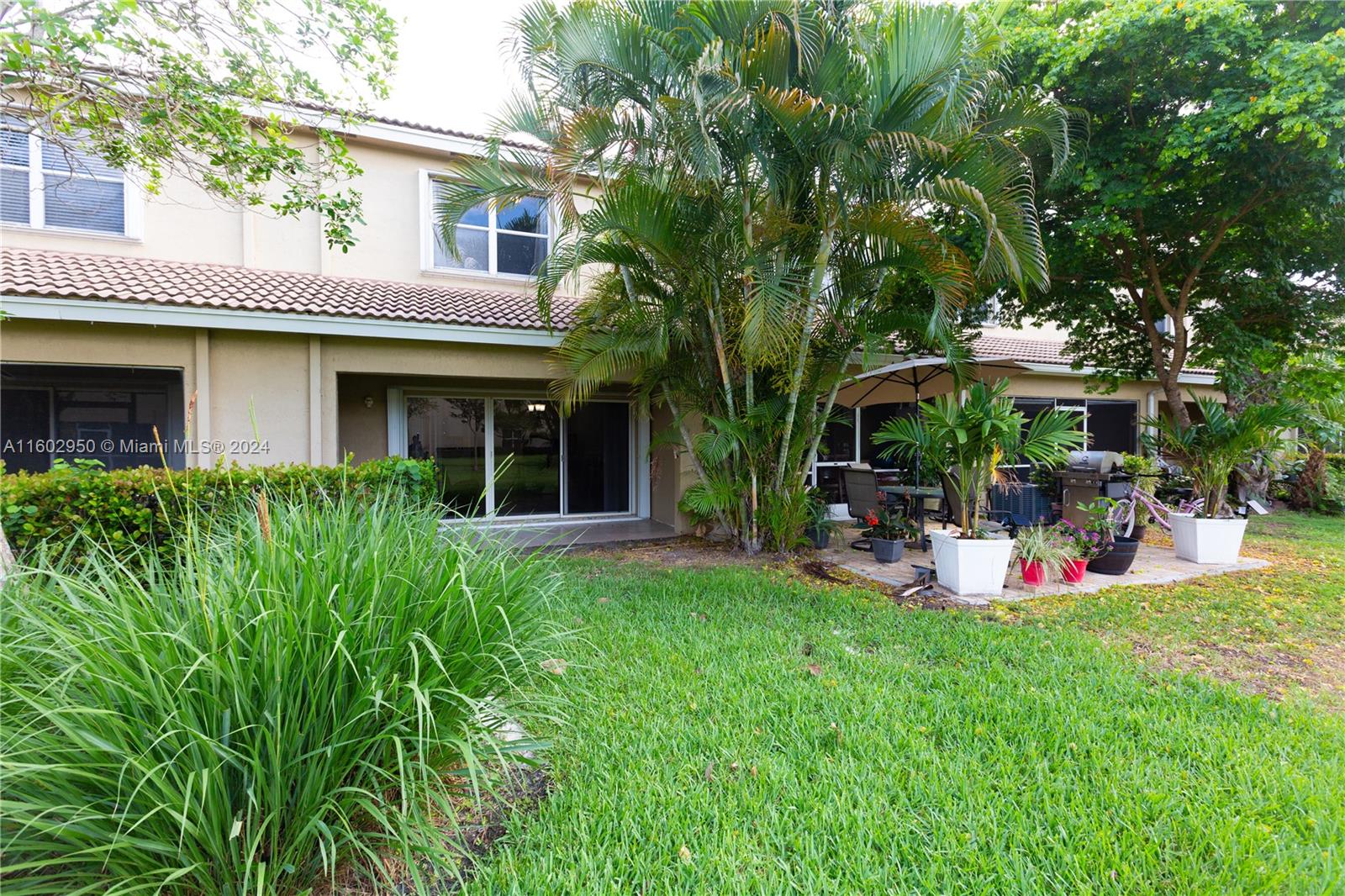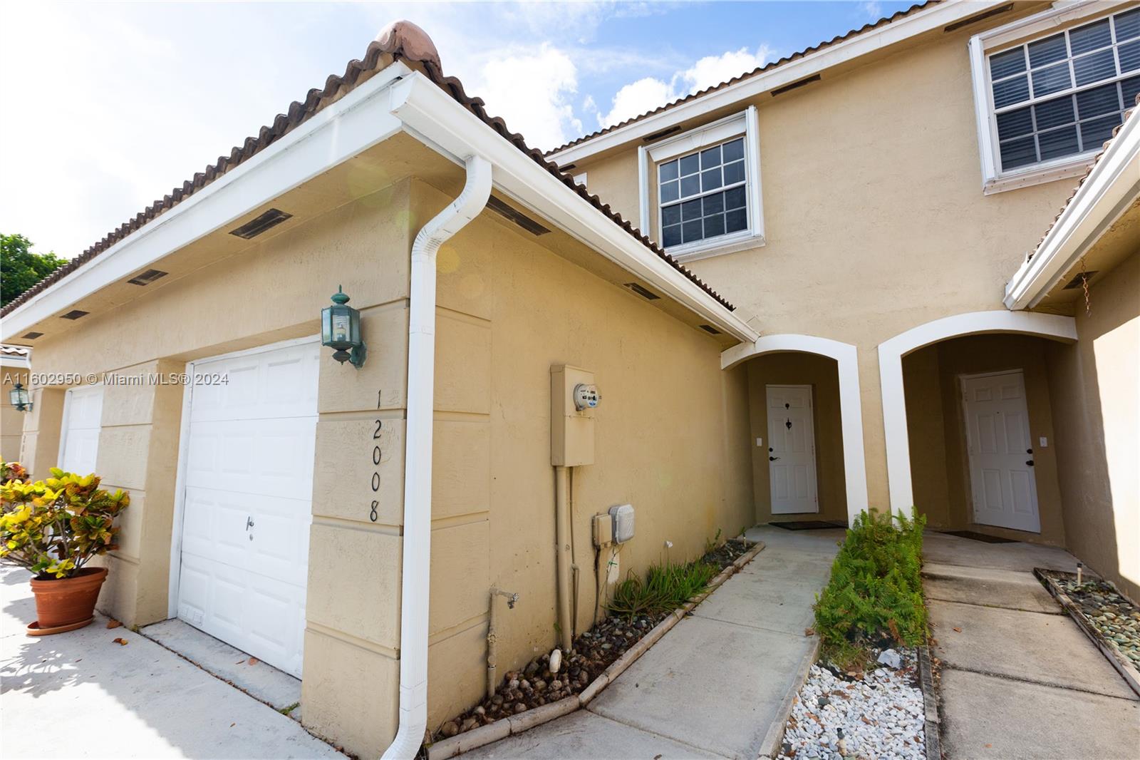 This home features an open floor plan living dining area. This home features a patio overlooking open garden spaces. The interior tile throughout the living area and laminate wood upstairs. Both bedrooms feature large walk-in closets. The home has shutters and also features a new AC unit . The community features a clubhouse area and is located near multiple restaurants and shopping centers. Do not miss the opportunity to own this amazing property. 2 parking spaces, garage and open yard space .
