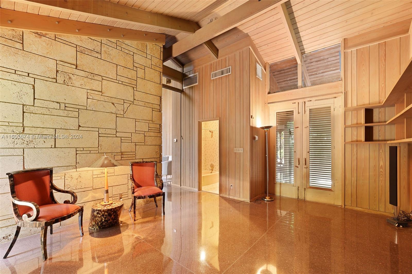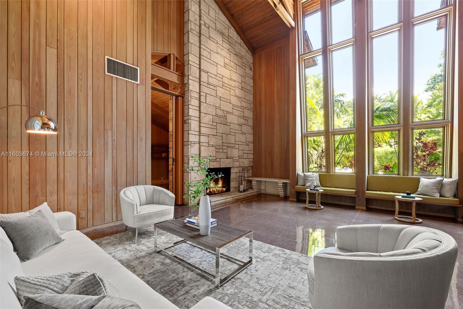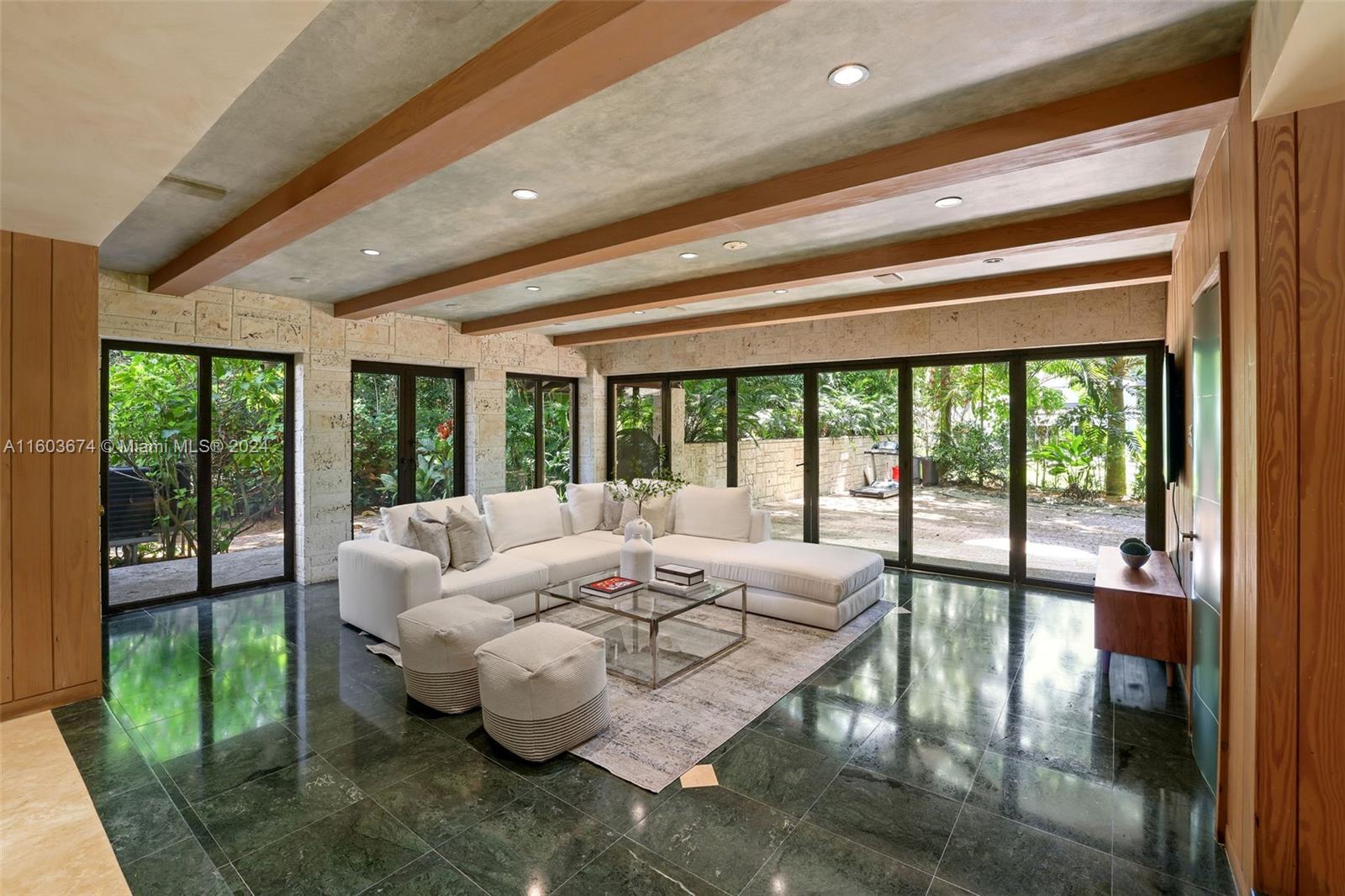 Bask in majestic and peaceful nature where home is a function of its natural surroundings. Located in the guard gated neighborhood of Hammock Lakes, this stunning home was designed by Alfred Browning Parker, legendary architect known for incorporating natural materials, such as the hardwood Florida Cedar and coral rock found here. Walk through a foyer entry and be enveloped into a grand living area covered by an angelic wood beamed cathedral ceiling. There are 2 additional family rooms. All bedrooms have ensuite bathrooms. In 2003, additions were made, with a new stand-alone primary suite upstairs, and an additional family room open to an industrial kitchen. This almost 1 acre property is spectacular with winding paths and valuable plants and trees. It can be your private tropical oasis.