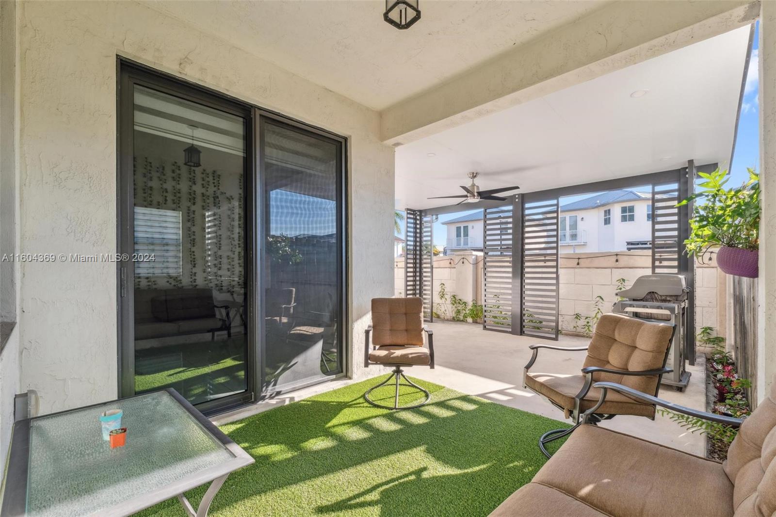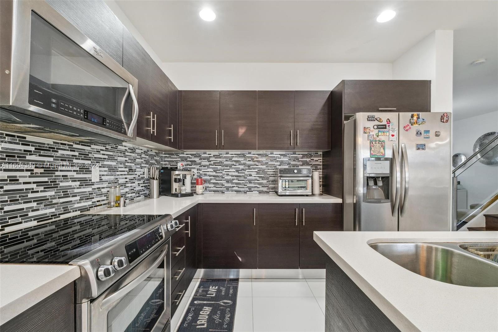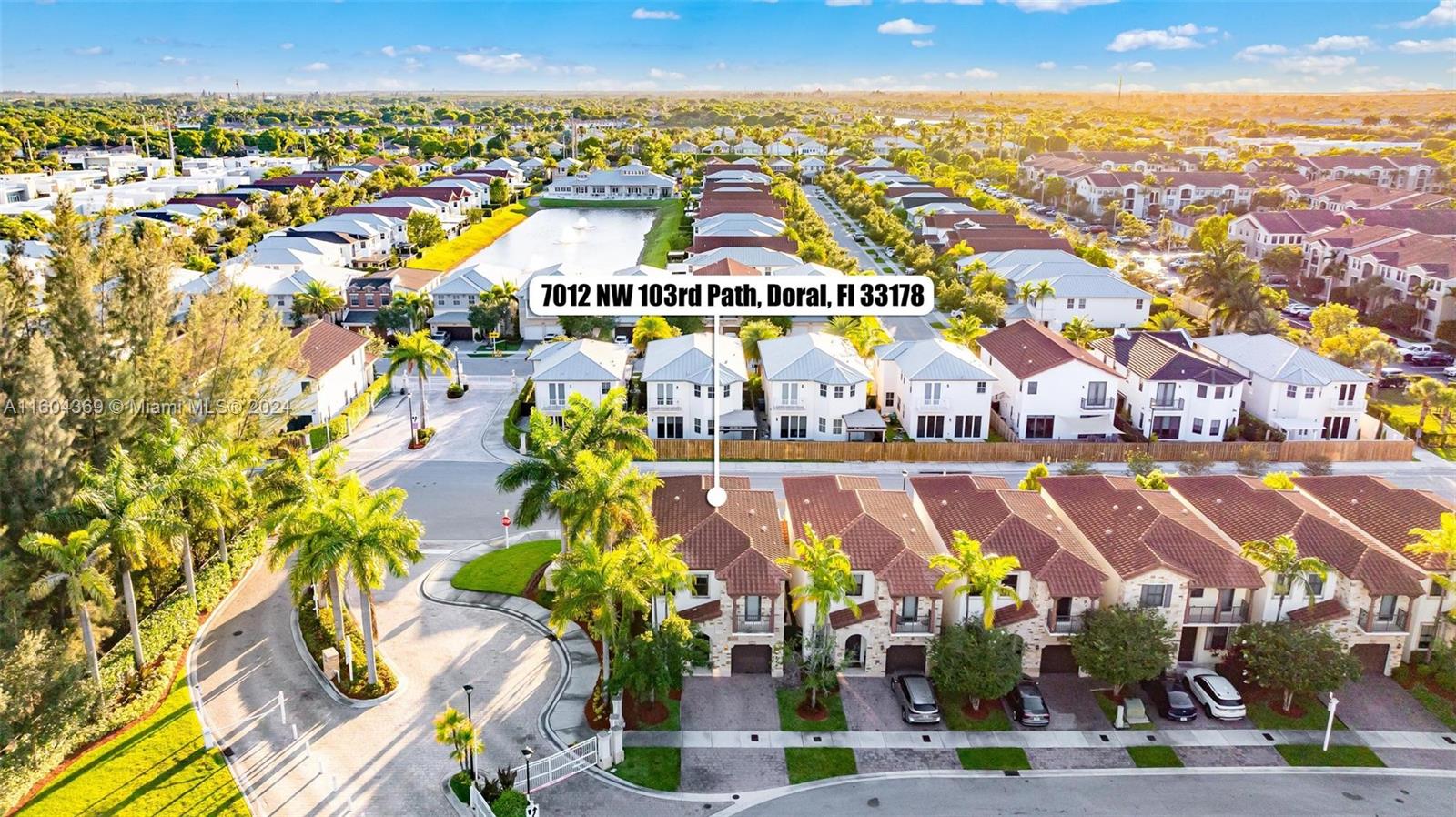 Beautiful remodeled 4 bedroom/3.5 bathroom 2 story home in the private & prestigious gated community of Vintage Place in the city of Doral. This home offers an excellent distribution with TWO suites. Modern open concept kitchen, quartz countertops, ceramic floor all throughout 1st floor, stainless steel glass stairs, impact windows, ZEBRA blinds, beautiful & large backyard w/ a custom aluminum pergola, perfect for having friends & family over. NEW A/C (replaced in 2022). There is a 1 garage & a driveway for 3 cars. The HOA fee includes cable, alarm, high-speed internet/fiber optics & a Clubhouse with pool, gym, sauna, game room, playground, & new BBQ area overlooking the lake. Excellent & quiet community. Near shopping centers, highways and excellent schools. Call for a private tour!