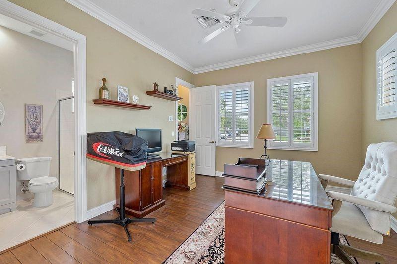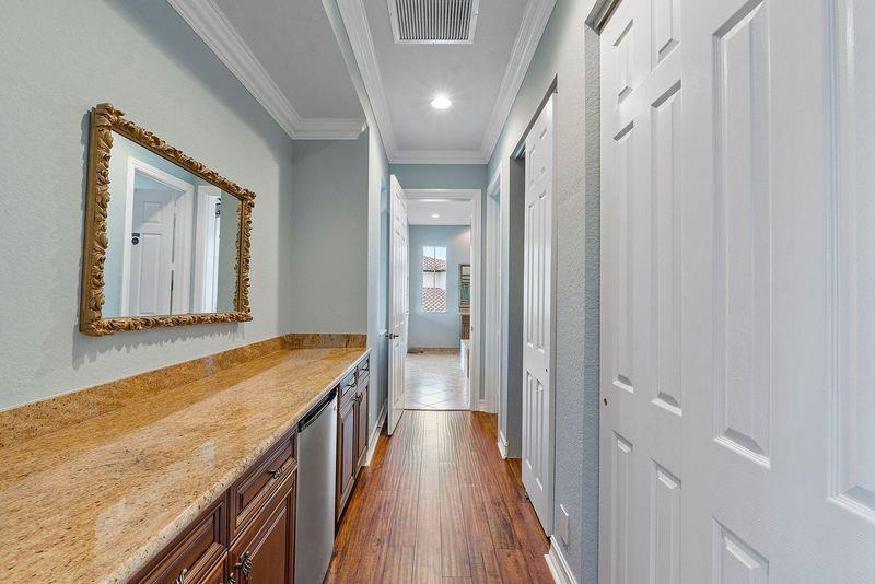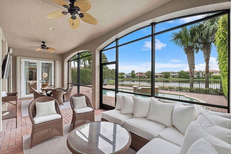 Incredible opportunity to own a 5 bedroom 4 bathroom lakefront pool/spa home on an oversized pie-shaped lot with a detached in-law suite boasting over 4,000sf of living area. This home has been freshly painted inside and out and has lush and pristine landscaping. Other features are: impact windows and doors in most areas and accordion shutters on the others, 3 new air conditioning units, upgraded kitchen with high-end wood cabinets, granite countertops and s/s appliances, custom closets throughout, an incredible 250 bottle wine closet and a wet bar in the living area, built-in dry bar in the master, an office/den on the first floor, Tile flooring downstairs and vinyl wood upstairs, screened lanai, garage fridge, exterior storage, child-gate for pool with a fully fenced yard plus much more.