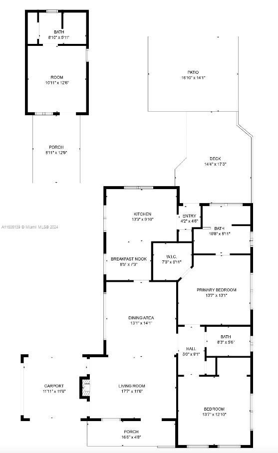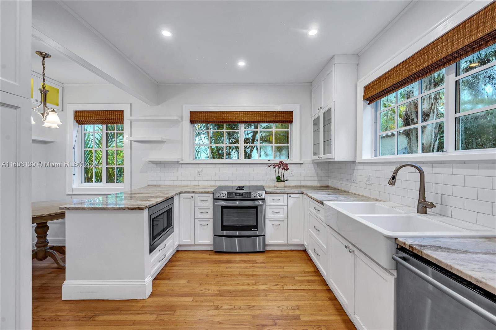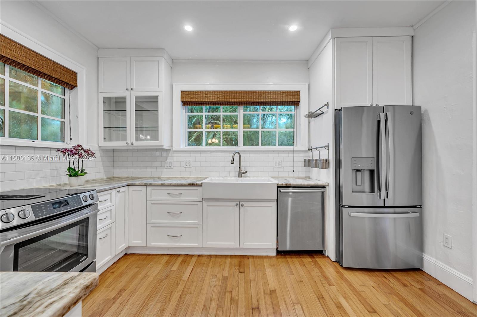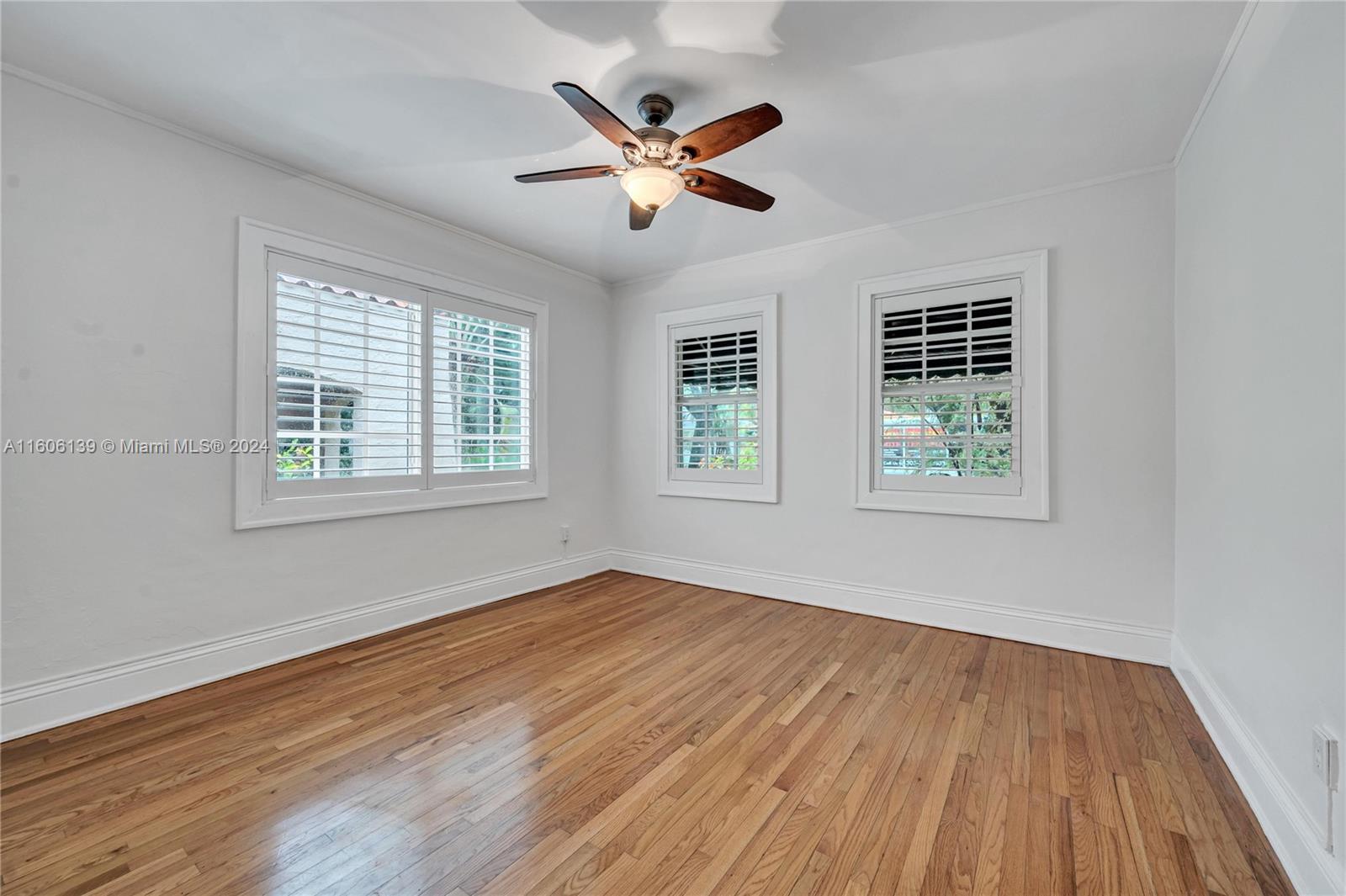 Welcome to this quintessential 1925 Old Spanish gem nestled on a tree-lined street in Coral Gables. This beautiful home seamlessly blends timeless charm w/ modern updates. Full of character w/ an original fireplace, hardwood floors & abundant natural light. The main house offers 2 spacious bedrooms & 2 full baths. Detached 1/1 cottage serves as perfect home office or guest quarters. Enjoy a renovated kitchen w/ ample storage & breakfast nook. Primary suite w/ walk-in closet & large bathroom. Tropical backyard oasis w/ deck, private patio & lush landscaping, ideal for relaxation & entertaining. Upgrades include impact windows, recessed lighting & new water heater. A carport ensures convenient parking. Ideal location just 2 blocks from Granada Golf Course & walking distance to Miracle Mile.