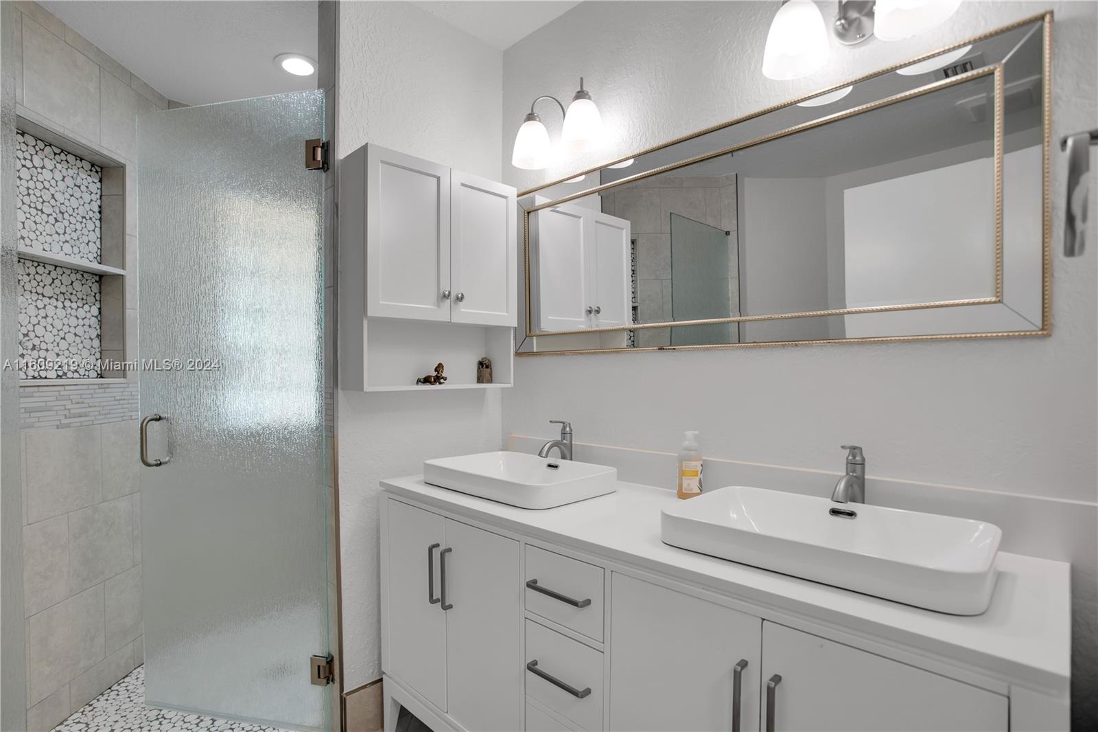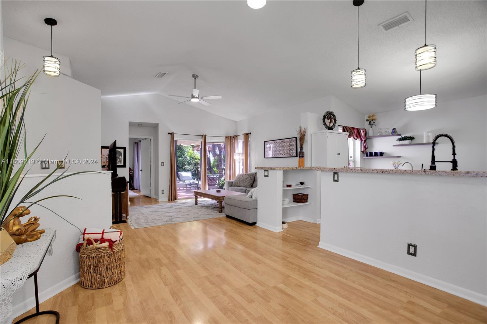 Discover the charm of this single-story residence in Misty Bay at Silver Lakes. This pristine home features 3BD/2BA, and a 1-car garage with vaulted ceilings and abundant natural light. Immaculate with laminate flooring, hurricane shutters, and an impact front door, it boasts new lighting, fans, stainless steel kitchen appliances, garage door, hot water heater and new landscaping. Renovated master bath with dual sinks adds style. Open kitchen and living area offer a spacious feel, complemented by luxury upgrades throughout. Sliding doors lead to a private, fenced backyard for entertaining. Top-rated schools, community amenities like clubhouse, pool, playground, and proximity to highways, shopping, and dining make this home a must-see!