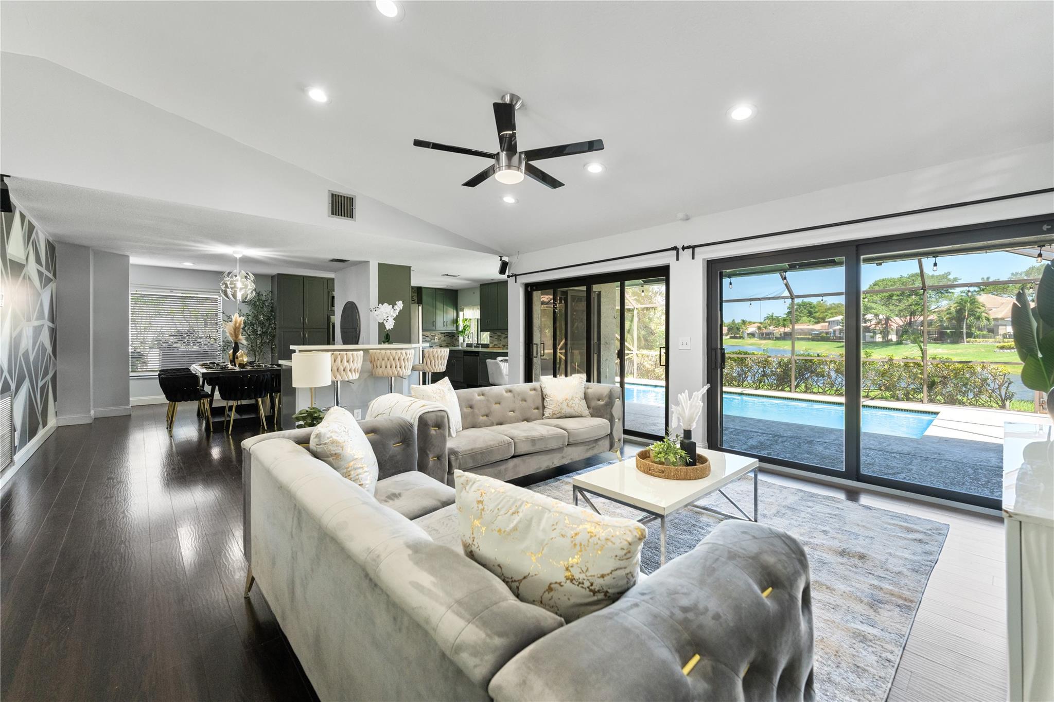 Welcome to Butler Farms, Newly remodeled 4 bedroom, 2 bath, 2 car garage home with a screened in patio & pool overlooking lake. Impact Windows and Doors! Renovated kitchen with granite counter top, wine cooler, bar and stainless steel appliances. Open floorplan with vaulted ceilings and large master suite. Private, secluded yard and Circular driveway. Located in a quiet residential neighborhood in Coral Springs. Close to Sawgrass Expressway, Schools, Parks & Shops!