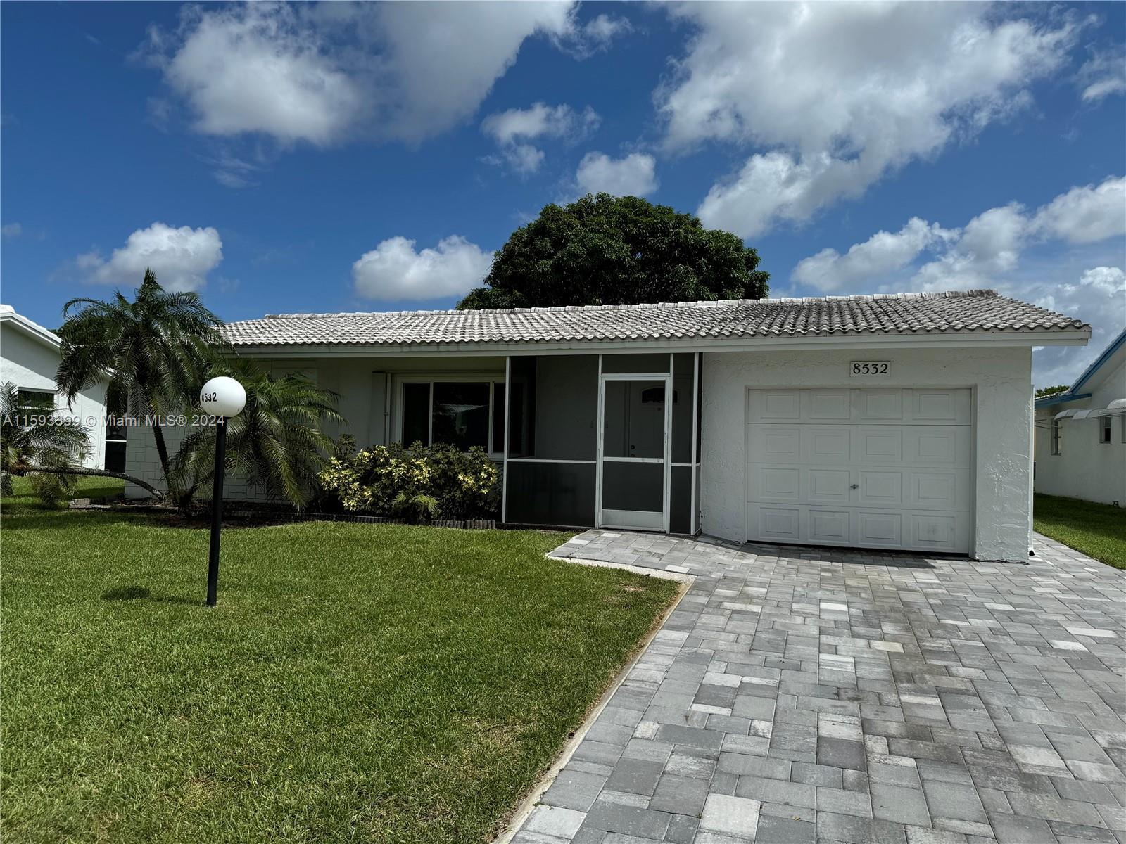 Lauderdale West home with peaceful lake view. Sought-after “Lakeview” model. Split 2 bed, 2 bath plan.1 car garage with new paver driveway for 2 cars. Two living areas plus large screen porch & patio for entertaining. Updated kitchen with bar seating, stainless-steel appliances & recessed lighting. Walk-in closets. Full set of accordian hurricane shutters. Mango tree. Very short distance to clubhouse. HOA responsible for roof - will be replaced soon. A/C 2021, Driveway & Water Heater 2023. Prestigious 55+ community. Monthly maintenance includes cable & WiFi, repair/replace roof, lawn service, exterior painting, courtesy bus, fitness center, tennis, 2 pools, sauna, ping pong, billards & much more. Located near medical centers, shopping, restaurants, 20 min to beaches, airport, cruise ships.