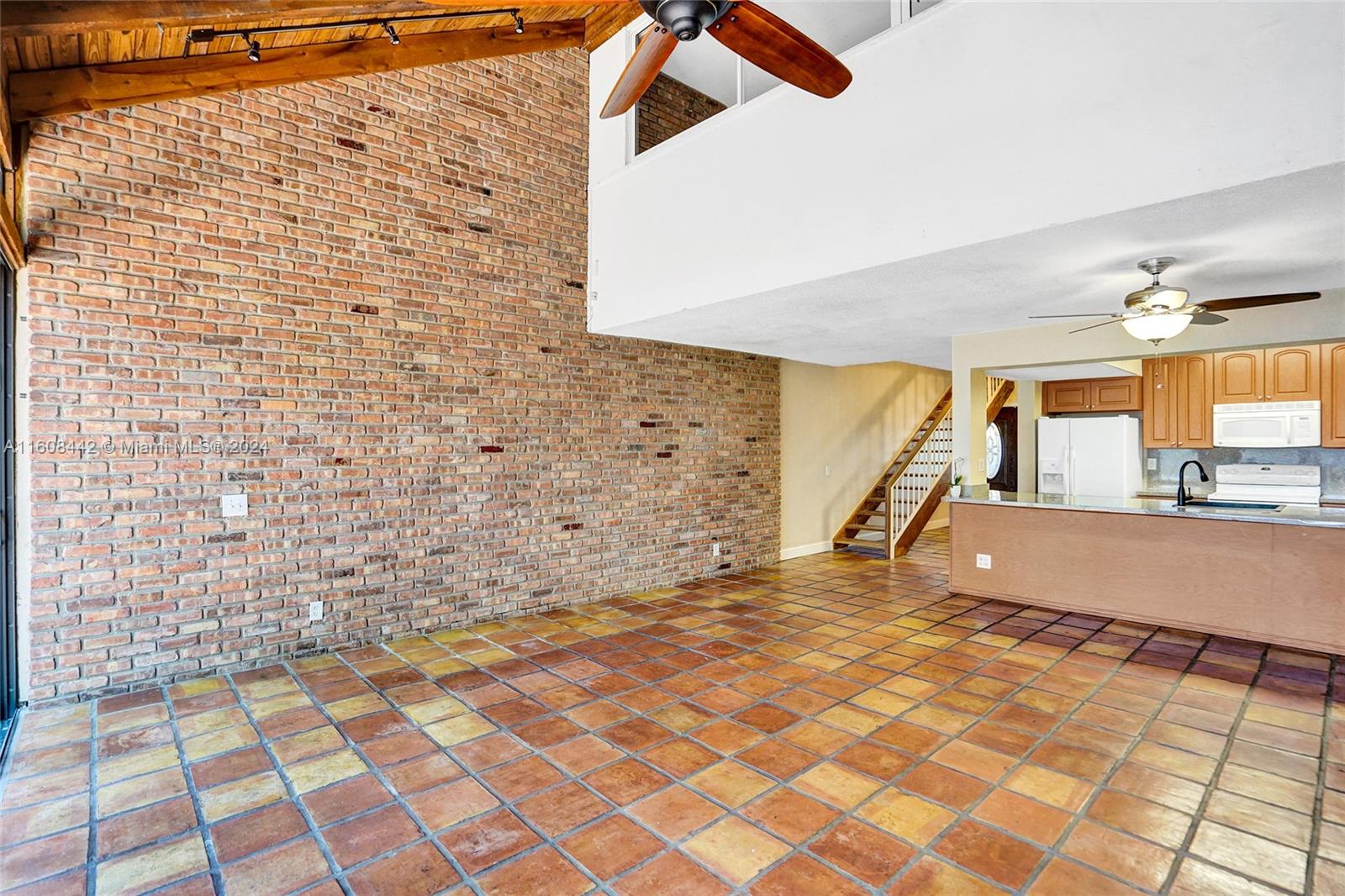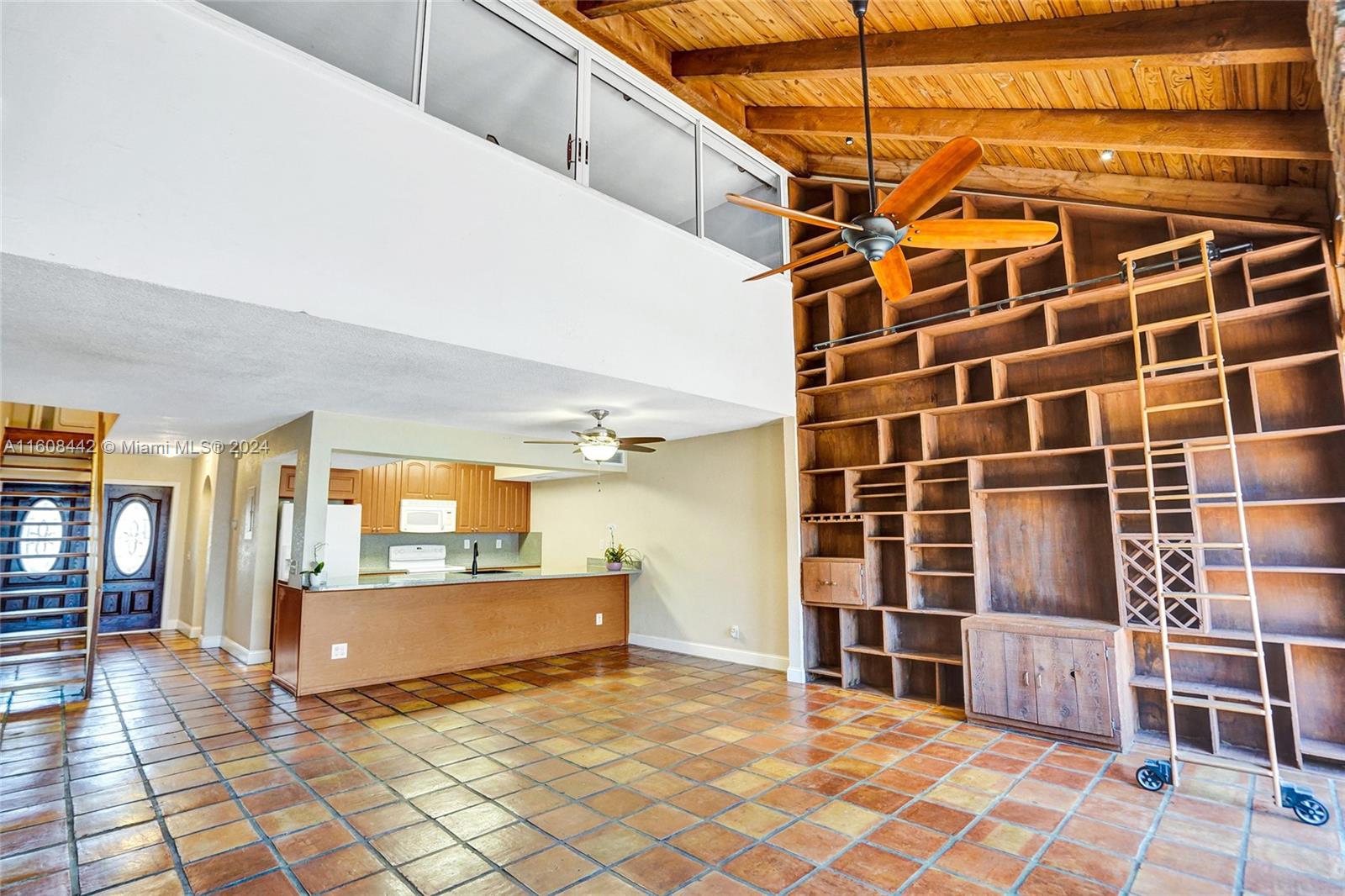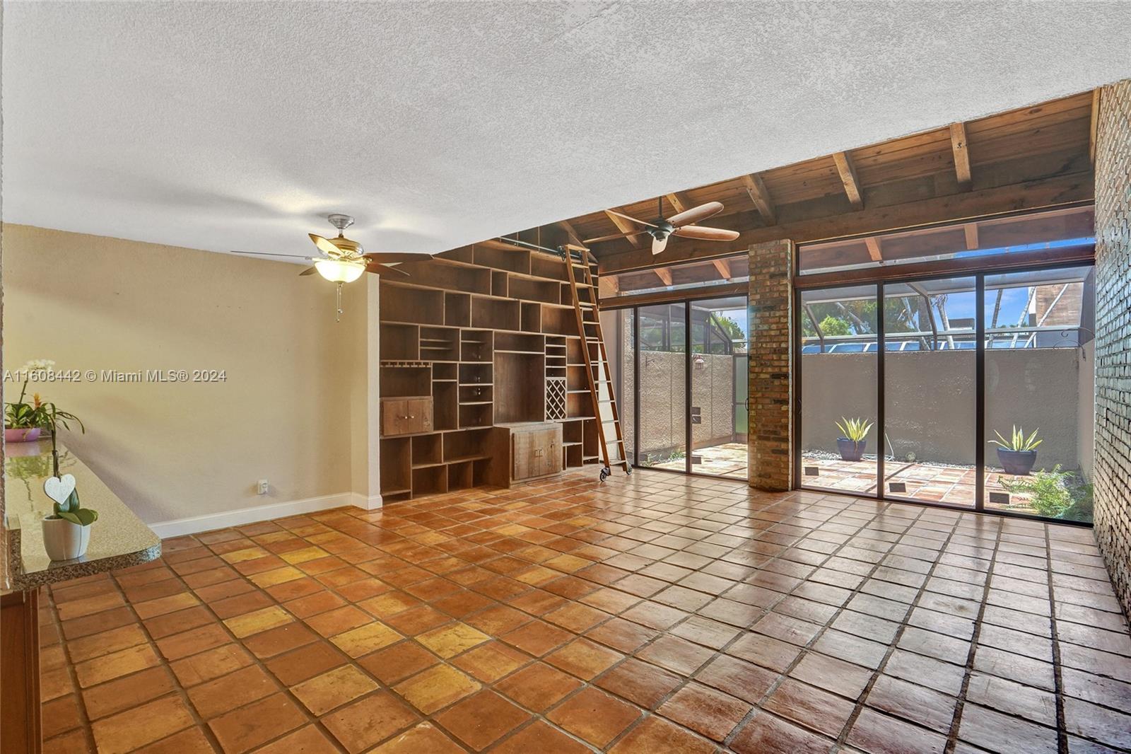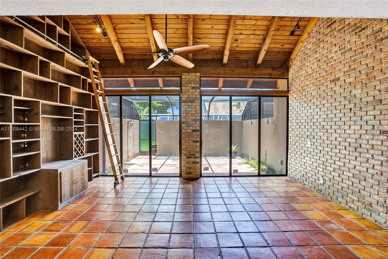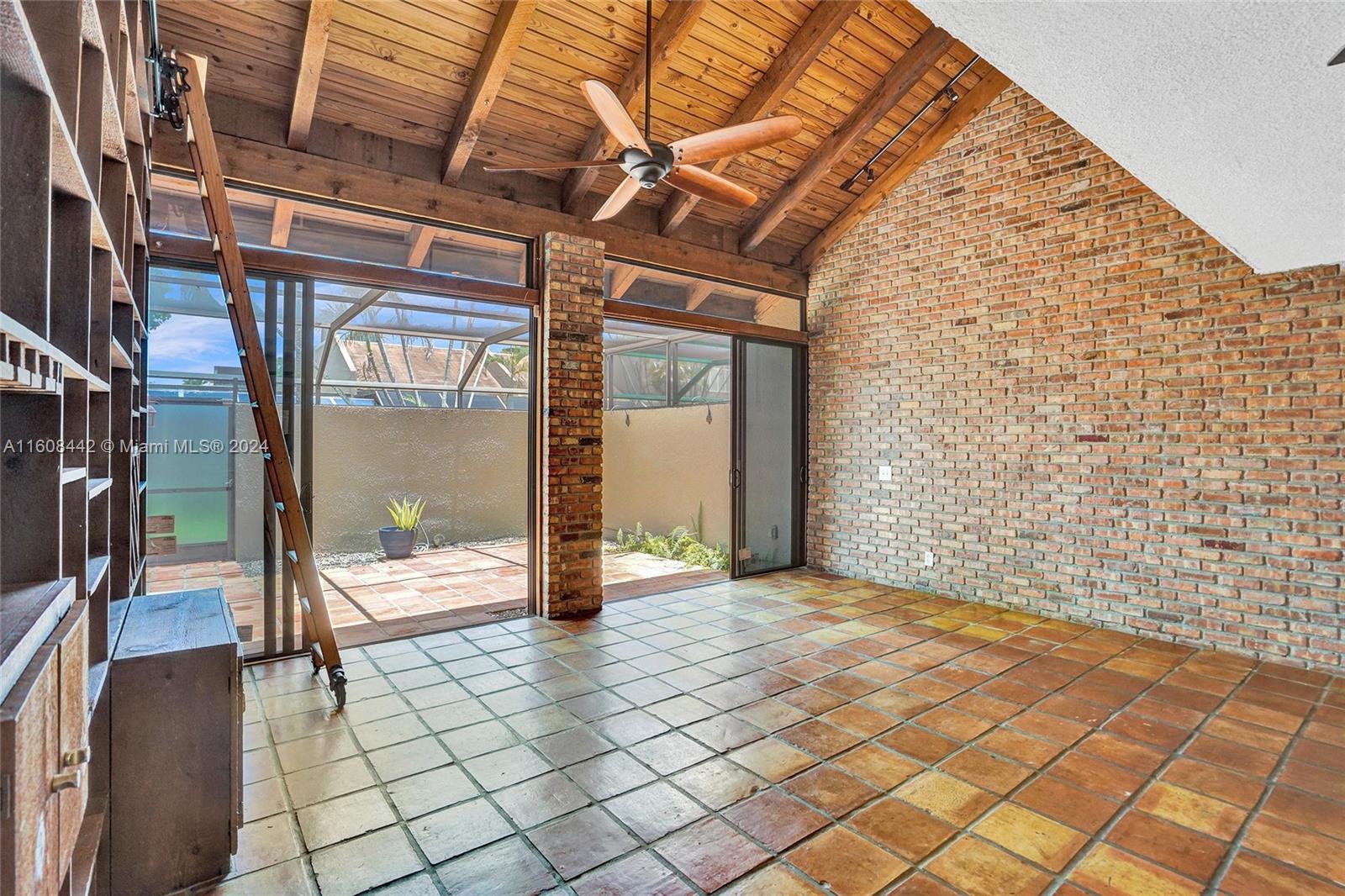 Welcome home to this spacious 3 bedroom 2 bath townhouse located in the desirable community of Villas West. Updated kitchen and baths. Open floor plan with high vaulted ceilings with wood beams. Library shelves from floor to ceiling with a sliding library ladder and a Chicago brick wall. Large master with walk-in closet. Brand new hurricane windows and doors throughout. Sliding glass doors across the entire back of the townhouse that open to your private secluded patio. Low maintenance, amenities which include pool, playground, and tennis courts. Bring your FHA buyers .