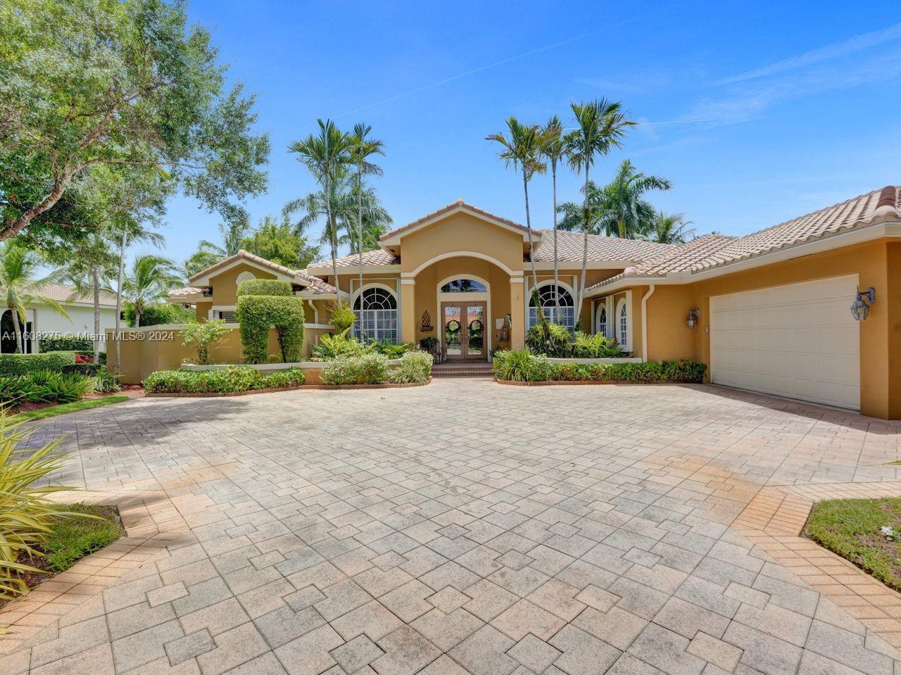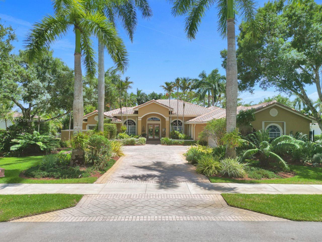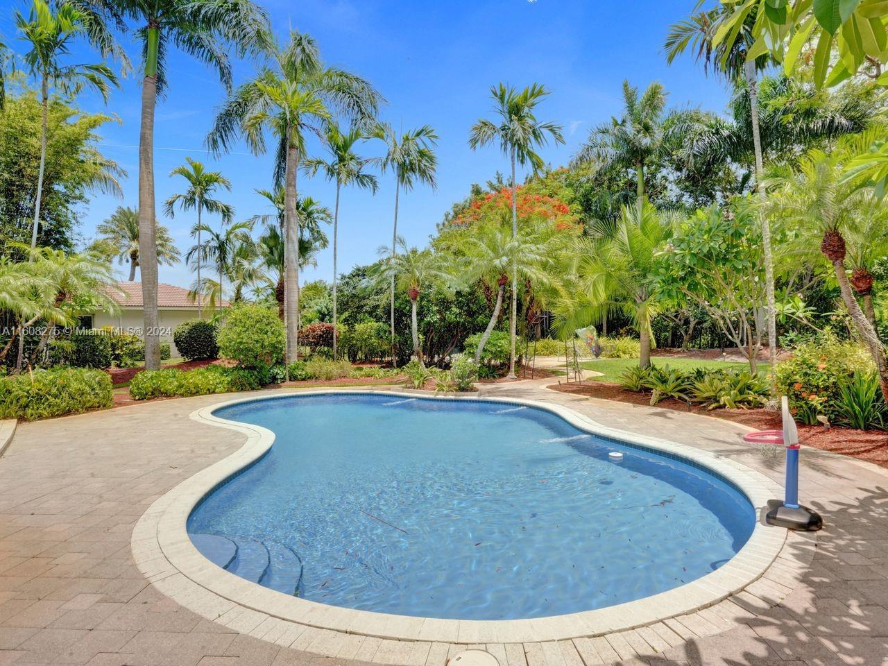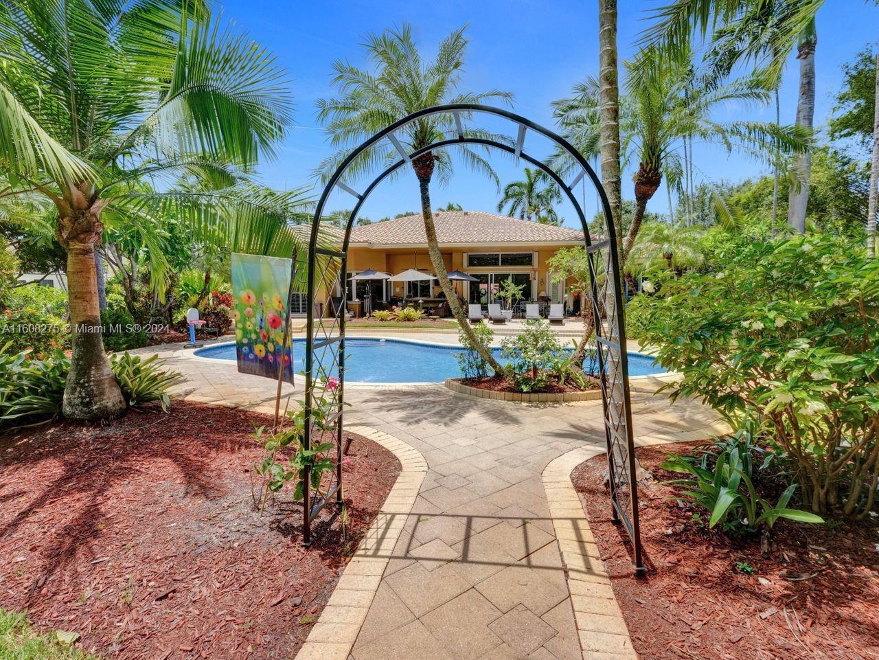Private oasis in Davie's exclusive gated community of Westridge. Stunning ranch-style, pool home, 3,571SF 5BR/4BA, 3-car garage estate home. Nestled on builder's acre lush w/queen palms, fruit trees, creates serene, picturesque feel. Open kitchen w/baker's rack over center cooking island, many pantries, GE Profile appliances, a farmhouse sink, wood cabinets & white quartz counters. Perfect backyard for entertaining & relaxation. Freeform pool, covered patio, 1/2 court basketball (convert to tennis or pickleball) & lots of green space. Retreat to primary BR-opens to patio, walk-in closets, vanity area, step-up jacuzzi, twin sinks, water closet w/toilet & bidet. Generator & accordion shutters. 5th BR used as den. Only 98 homes. This Davie dream home ensures a tranquil & exclusive lifestyle.