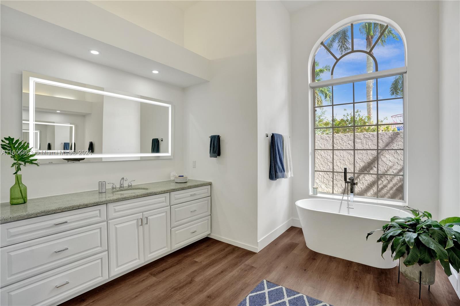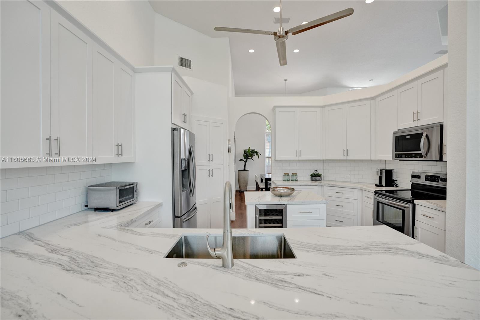 Unparalleled elegance awaits in this prime Weston Hills Country Club home with mesmerizing golf course vistas and breathtaking sunsets.This modern luxury residence features 5 beds,3 baths, versatile office.Recent updates include a 2022 roof, newer water heater,and A/C.The heart of the home is a brand-new 2024 chef's kitchen with quartz countertops and stunning views.The master suite offers an expansive walk-in closet and an ensuite bathroom with a new free-standing tub and sauna.The second bathroom is beautifully renovated, and new 2024 waterproof floors flow throughout, including the laundryroom with custom cabinets.Outside, enjoy a newly refinished pool and sealed pavers,perfect for gatherings or tranquil evenings.Experience sophistication and comfort in this Weston Hills masterpiece.