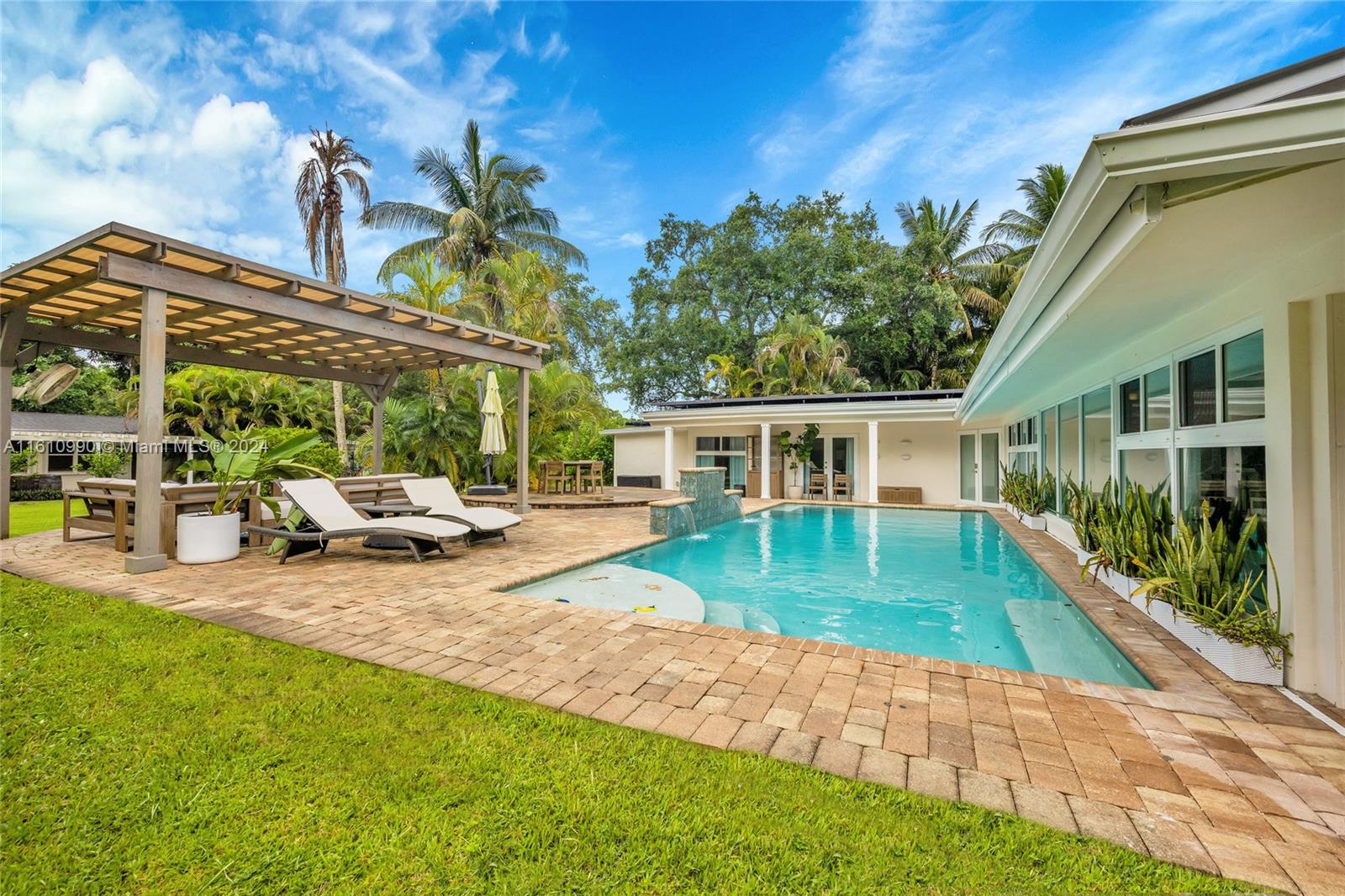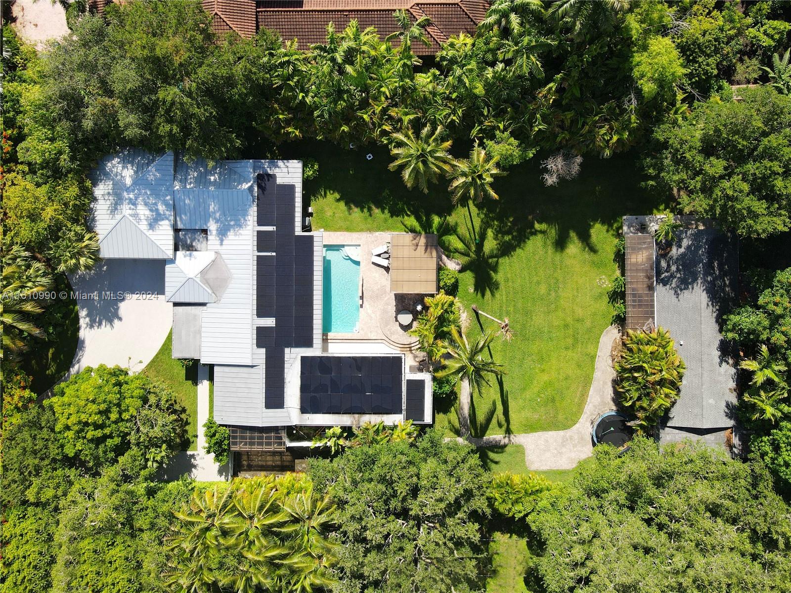 Located in beautiful Pinecrest, this estate property consists of a main house & guest house on a near acre of land sharing a pool and expansive lawn. Ideal for a big extended family, the main house features 5 bedrooms, a central playroom, large kitchen with upgraded appliances, bar and large living room leading out to the pool patio with covered trellis overlooking the expansive back yard. The guest house features a gym, media room, safe room, full kitchen and bedroom suite. The property is storm ready with a 30kw solar panel array with IQ8 battery backup system for 100% off the grid power supply. The large 2 car garage features oversized doors for a boat on trailer. Fully fenced w/ double entry auto gates & concrete driveways. No trees in bldg footprint for those looking to build anew.