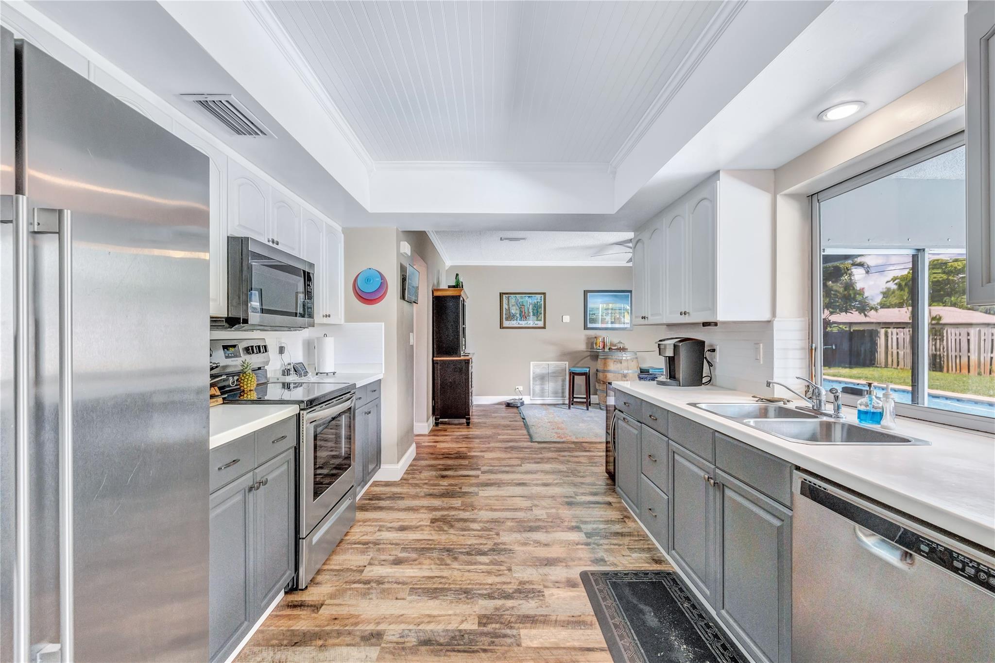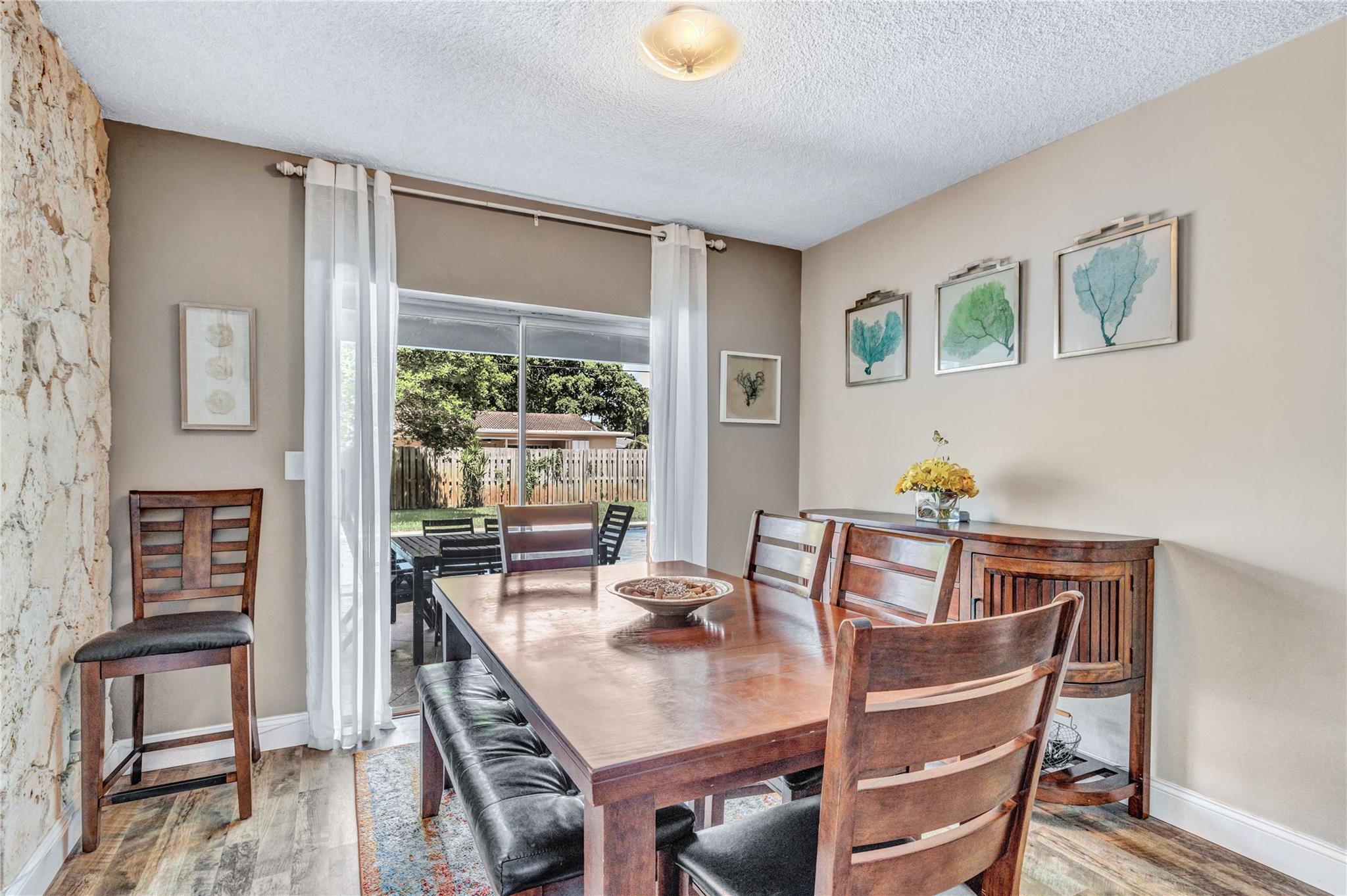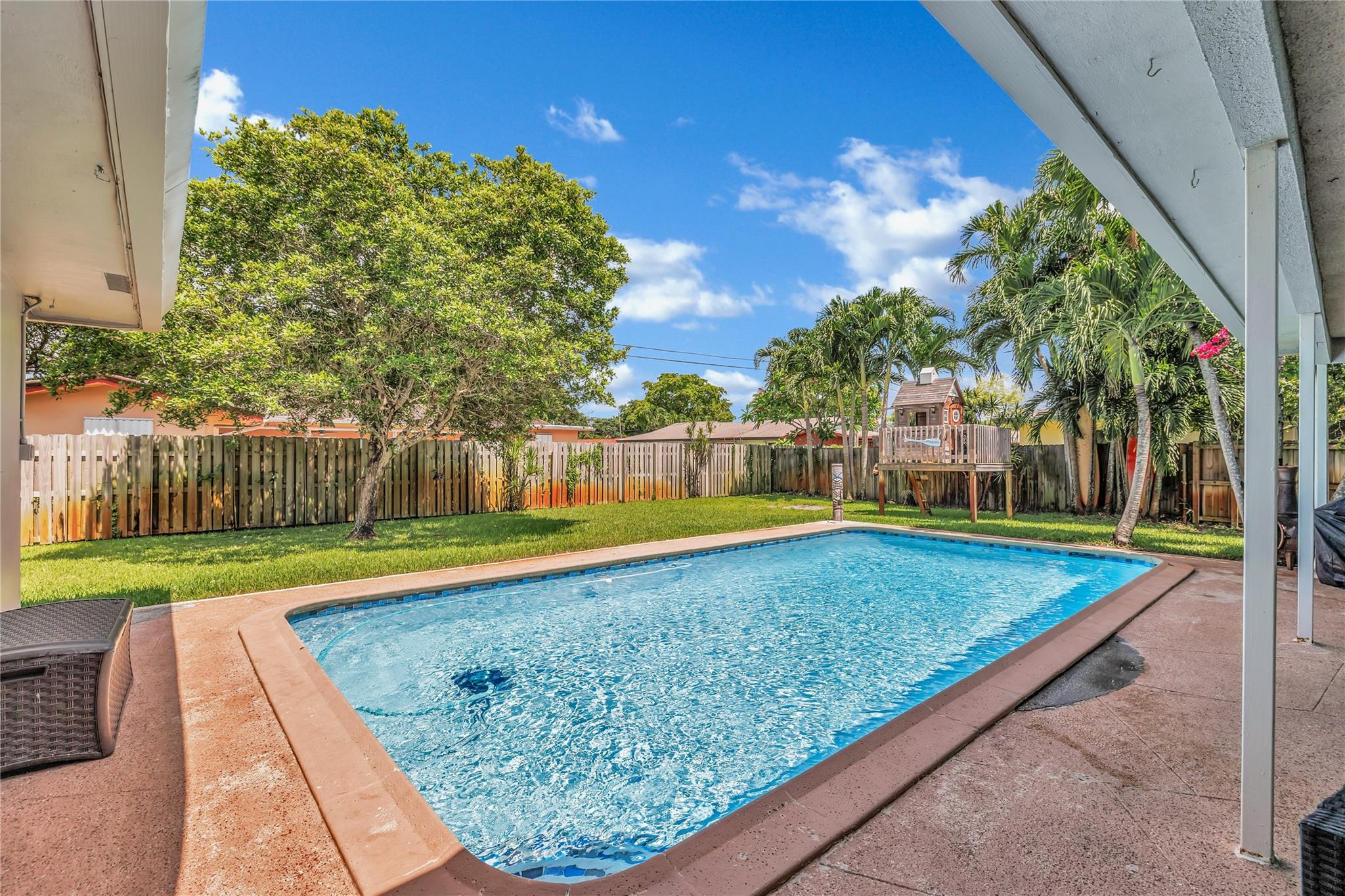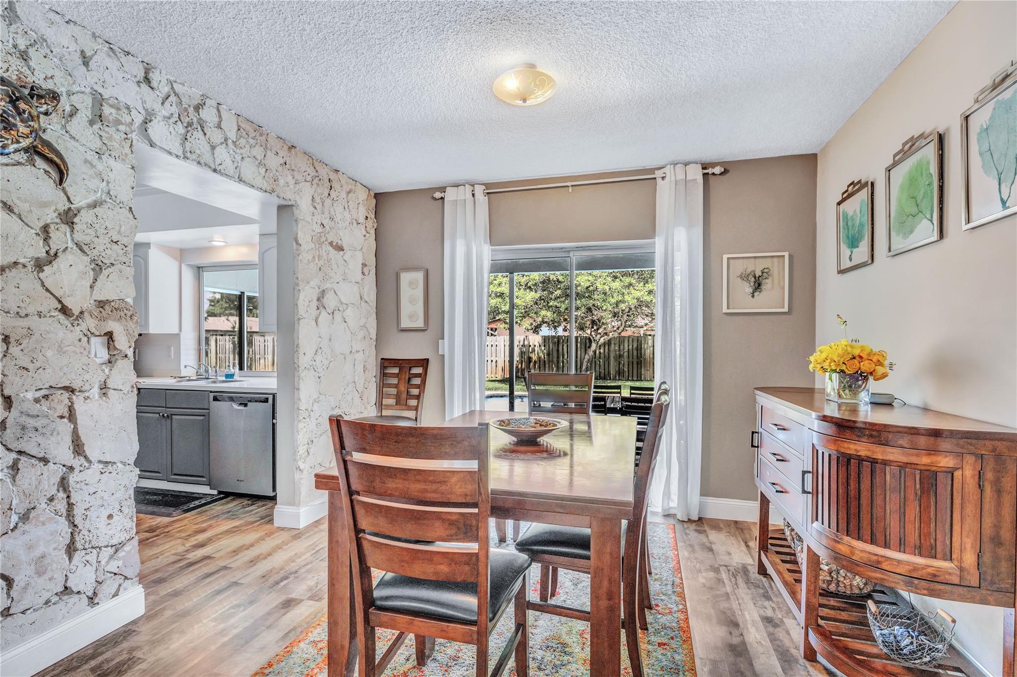 Located in a vibrant town full of opportunities, this beautiful home is just minutes from the Broward Mall and Sawgrass Mills Mall, with easy access to major highways. This sought-after Capri floor plan 4/2 in a true split layout, with the primary bedroom on the right and secondary bedrooms on the left. The kitchen features contrasting cabinets, stainless steel appliances, & a wonderful view, perfect for keeping an eye on the kids while cooking. Adjacent to the kitchen are spacious living, family, & dining rooms, providing ample space for family & guests. The covered patio and large saltwater pool—recently updated with new marcite, tiles, light, pool pump, pipes, and jets—are ideal for entertaining. A wrap-around fence ensures privacy and safety for kids and pets. Stay Friendly!