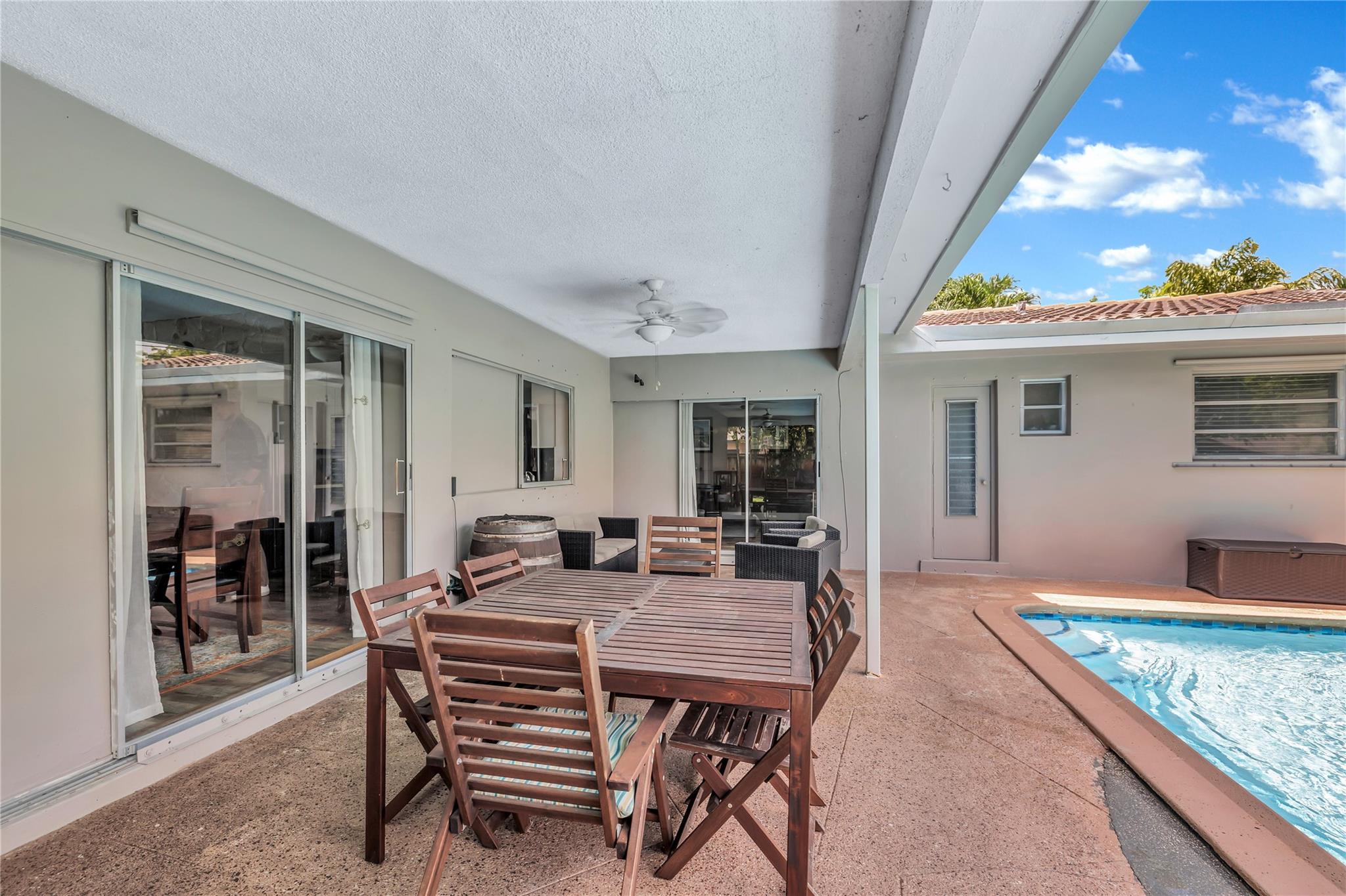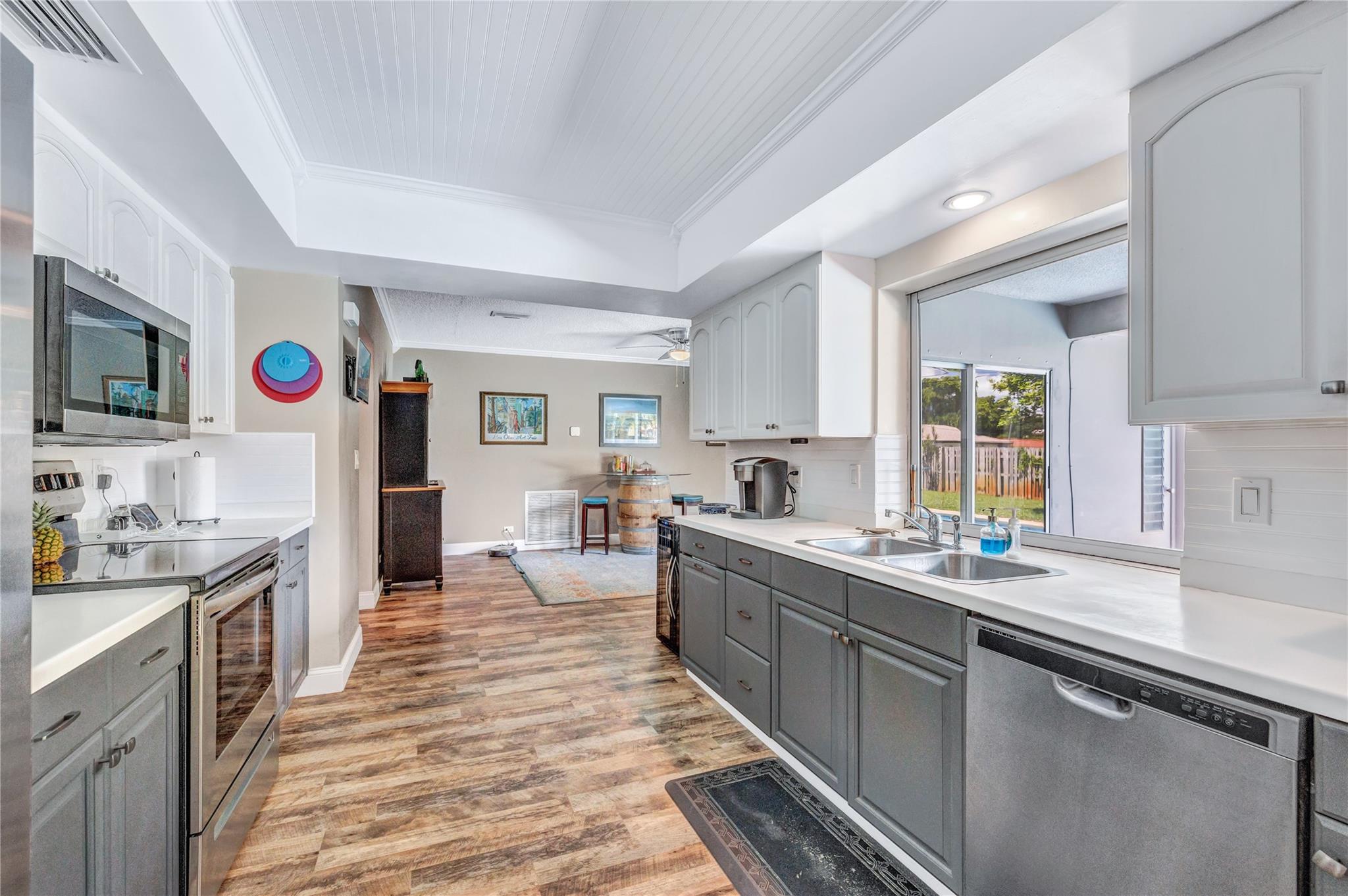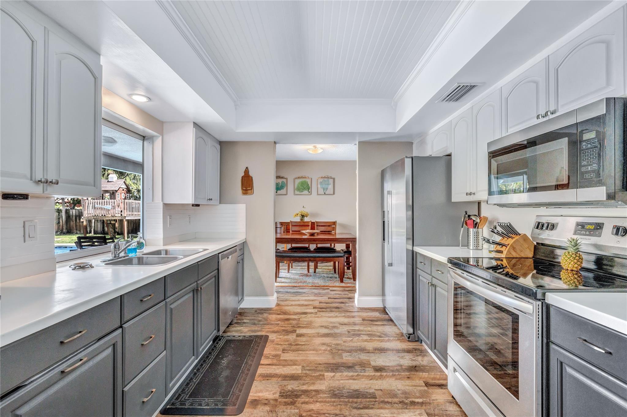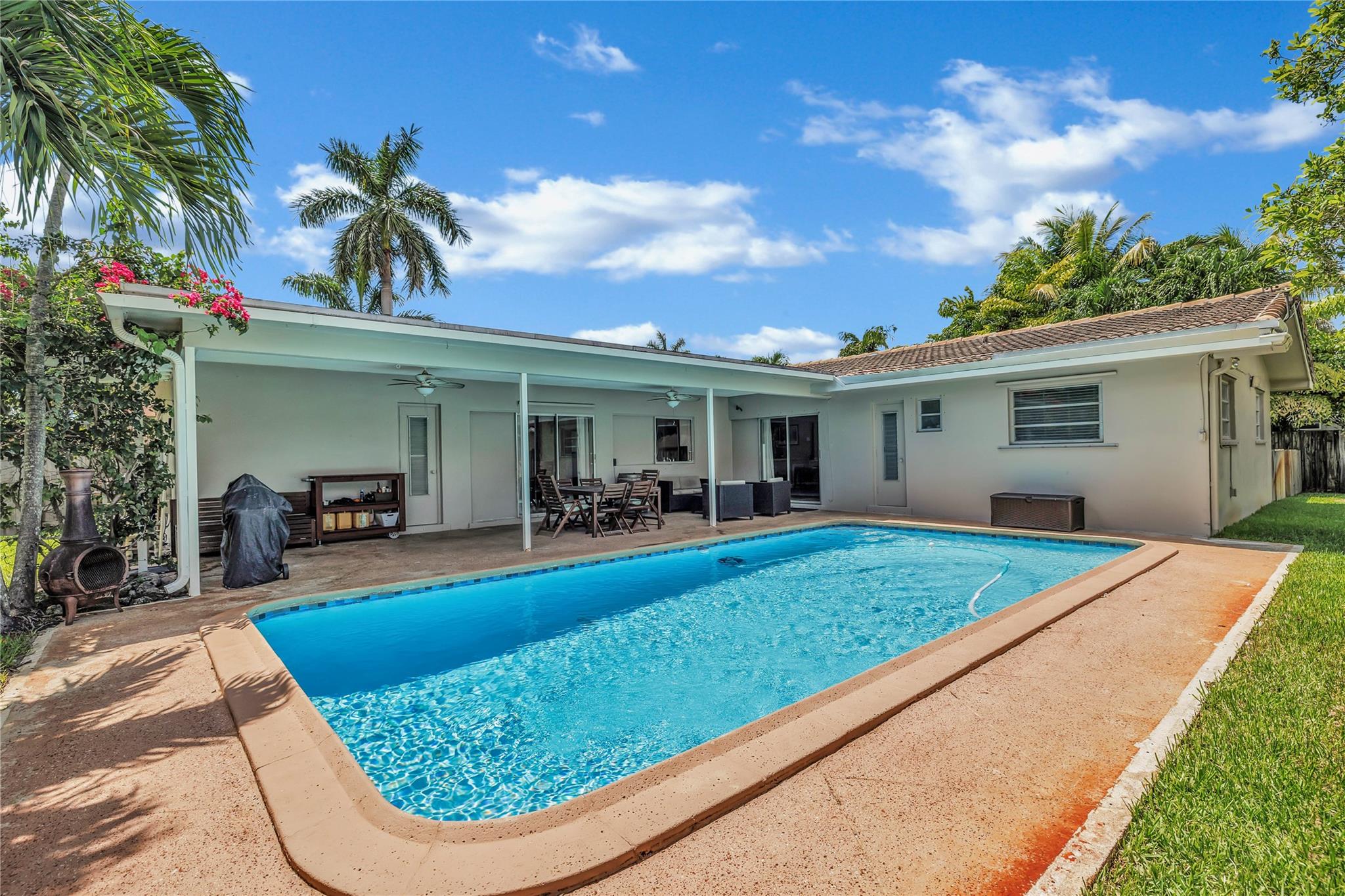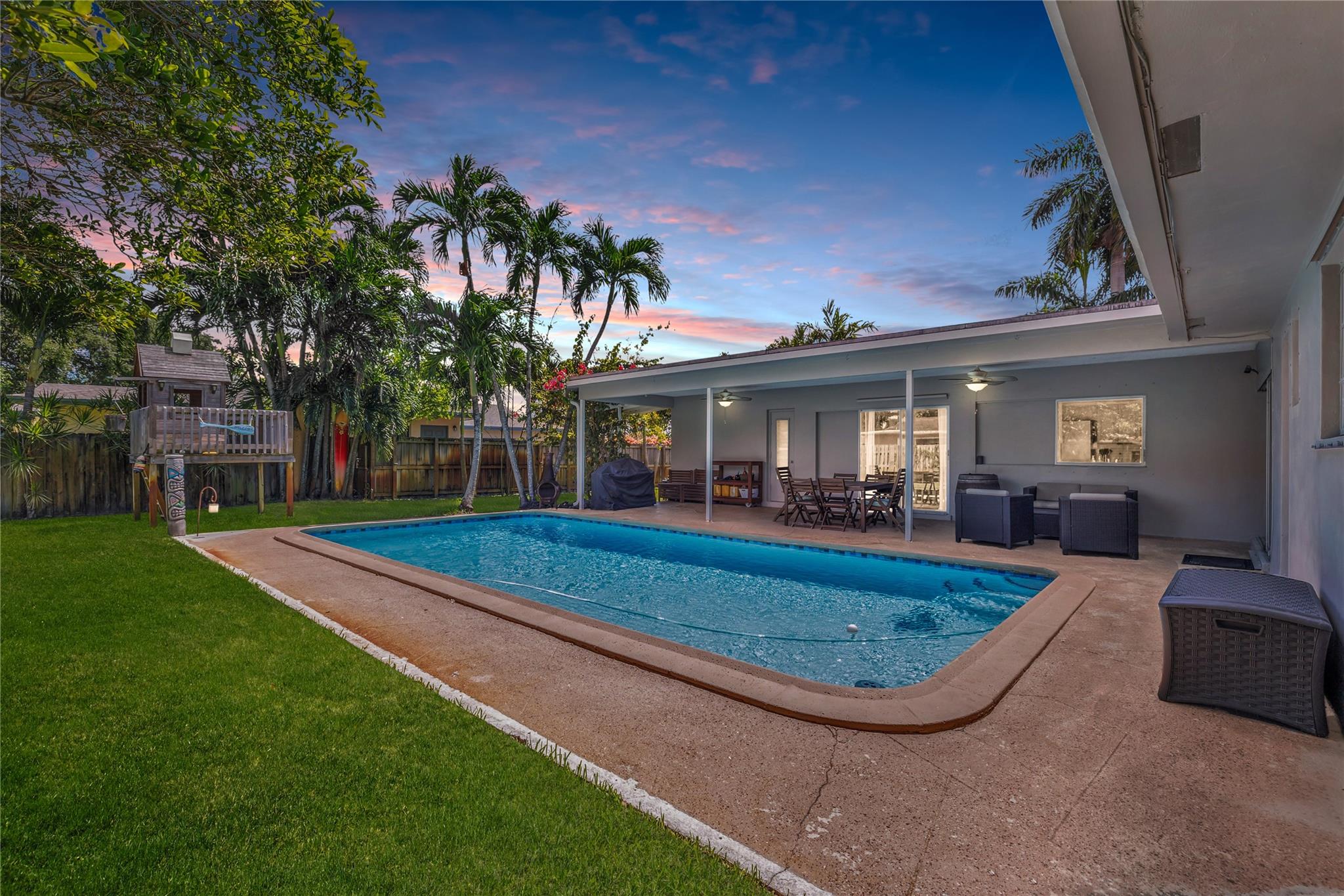 Located in a vibrant town full of opportunities, this beautiful home is just minutes from the Broward Mall and Sawgrass Mills Mall, with easy access to major highways. This sought-after Capri floor plan 4/2 in a true split layout, with the primary bedroom on the right and secondary bedrooms on the left. The kitchen features contrasting cabinets, stainless steel appliances, & a wonderful view, perfect for keeping an eye on the kids while cooking. Adjacent to the kitchen are spacious living, family, & dining rooms, providing ample space for family & guests. The covered patio and large saltwater pool—recently updated with new marcite, tiles, light, pool pump, pipes, and jets—are ideal for entertaining. A wrap-around fence ensures privacy and safety for kids and pets. Stay Friendly!