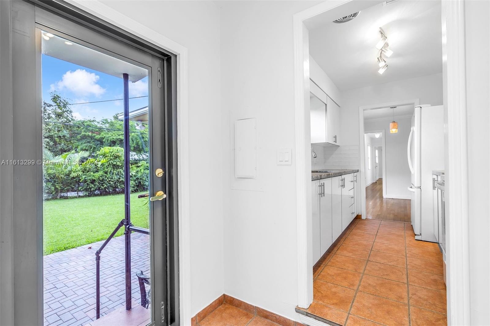 A true 1950's Miami Shores Mid Century Modern home that's been completely updated. Courtyard-front porch entrance brings you into an open concept space with windows on every wall that brightens the living room, dining room combination. Gleaming hardwood flooring throughout. The large Florida room has terrazzo floors and more windows that show off your impressive 10,200 square foot lushly landscaped yard. The modern kitchen has granite counter tops and white tile backsplash with shiny European cabinetry. The shared bathroom has an expanded shower, gorgeous tiles and a double vanity. There is a full bath in the garage, which could easily become a large primary bedroom. All updates have been made; electrical, HVAC, roof, plumbing, impact windows and doors. Walkable to downtown Miami Shores.