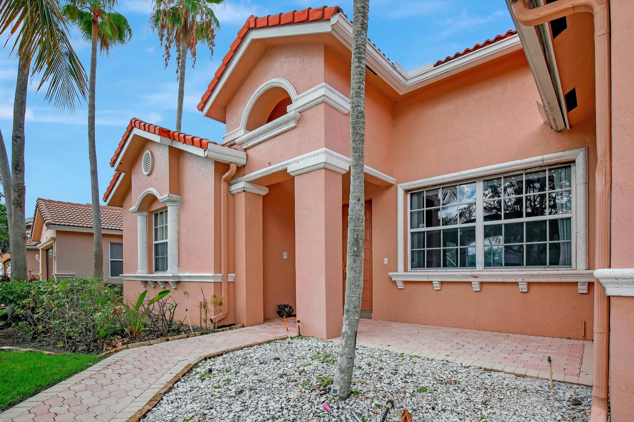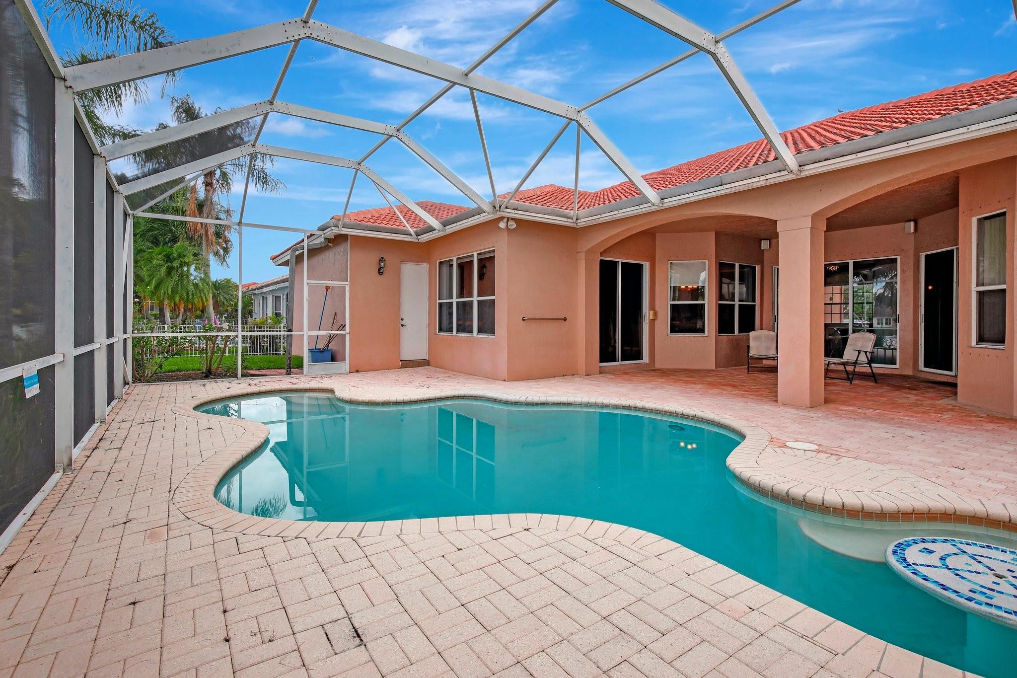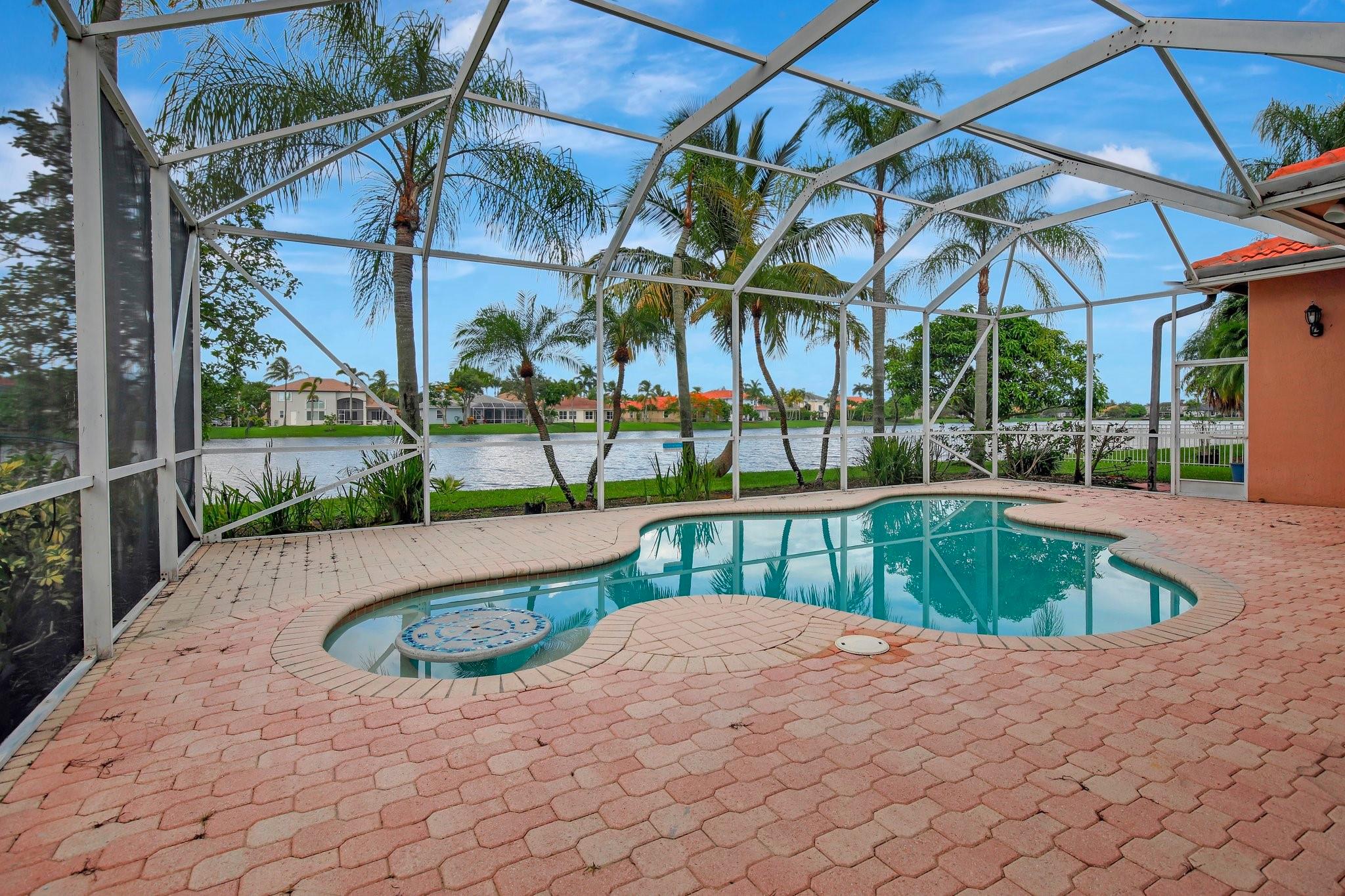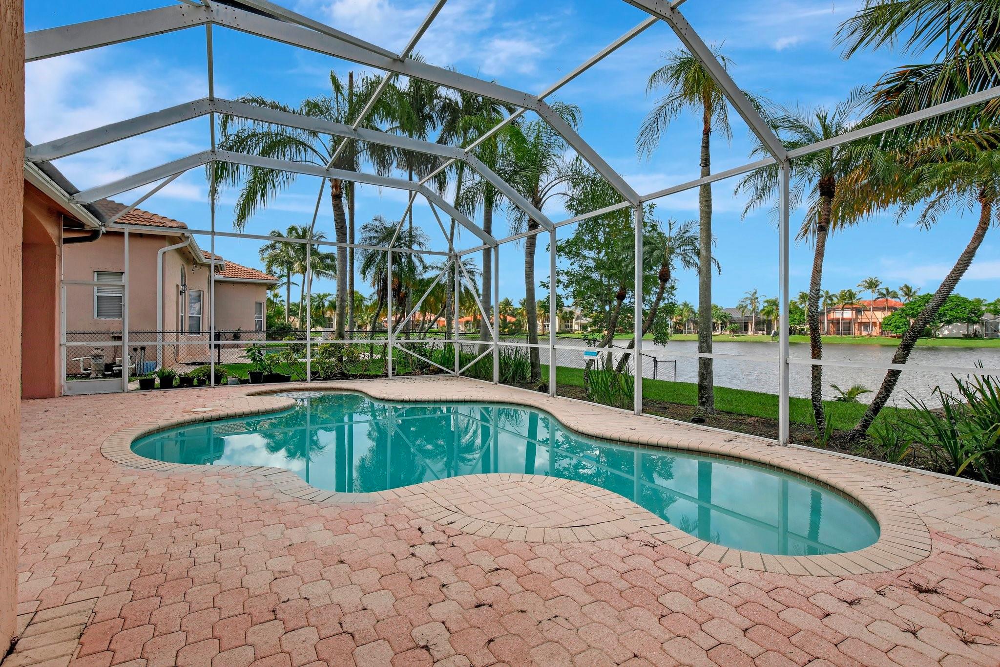 Welcome to this exquisite 4-bedroom, 3-bathroom home with a 3-car garage, nestled in the prestigious Estates of Pembroke Shores, a gated community. This residence features vaulted ceilings and a spacious, sunlit open floor plan with tile flooring throughout. The kitchen is equipped with an island, granite countertops, stainless steel appliances, large cabinets, and a pantry offering ample storage space. The master bedroom includes his and hers closets and offers a picturesque view of the pool and lake. Outside, indulge in privacy and outdoor living on your screened-in. covered terrace, overlooking the pool and the tranquil lake beyond. This home is ready for your personal touch. Conveniently located near major highways, shopping centers, golf courses, schools, and more.