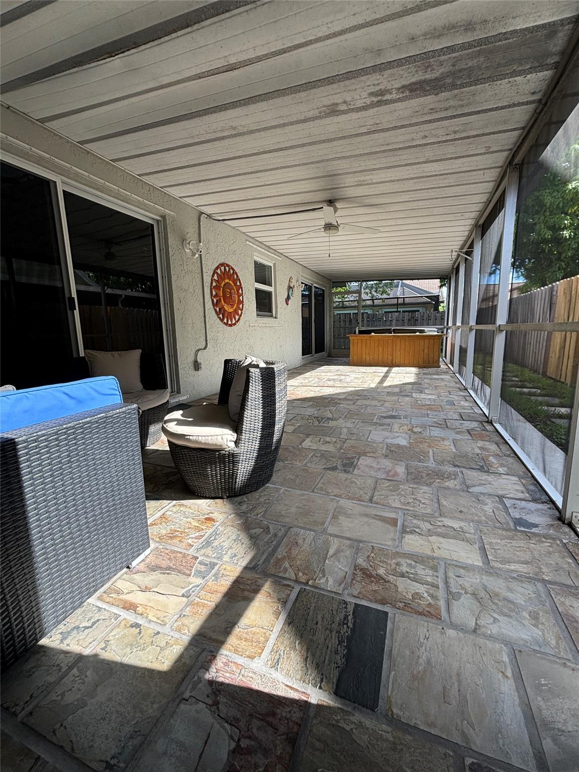 Spacious four/five bedroom home, 3 full baths. Master bedroom, 2nd & 3rd bedrooms located on 1st floor. 2nd floor has an open loft with closets that has great storage space. The loft is a great space for home office or 5th bedroom. Attic storage access located in loft area. Kitchen & bathrooms recently remodeled. New tile flooring throughout. Covered screened-in porch with a hot tub. through the living room & family room through glass sliding doors. Impact windows throughout except for side sliding door. The washer & dryer located in the garage. Two car garage with extra storage space & impact garage door. Driveway has been repaved.