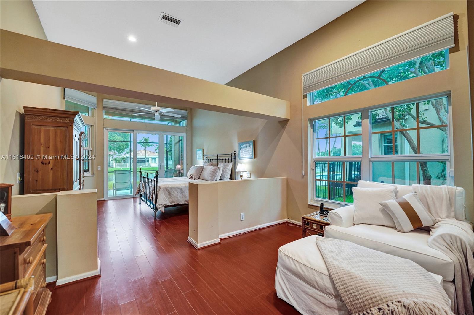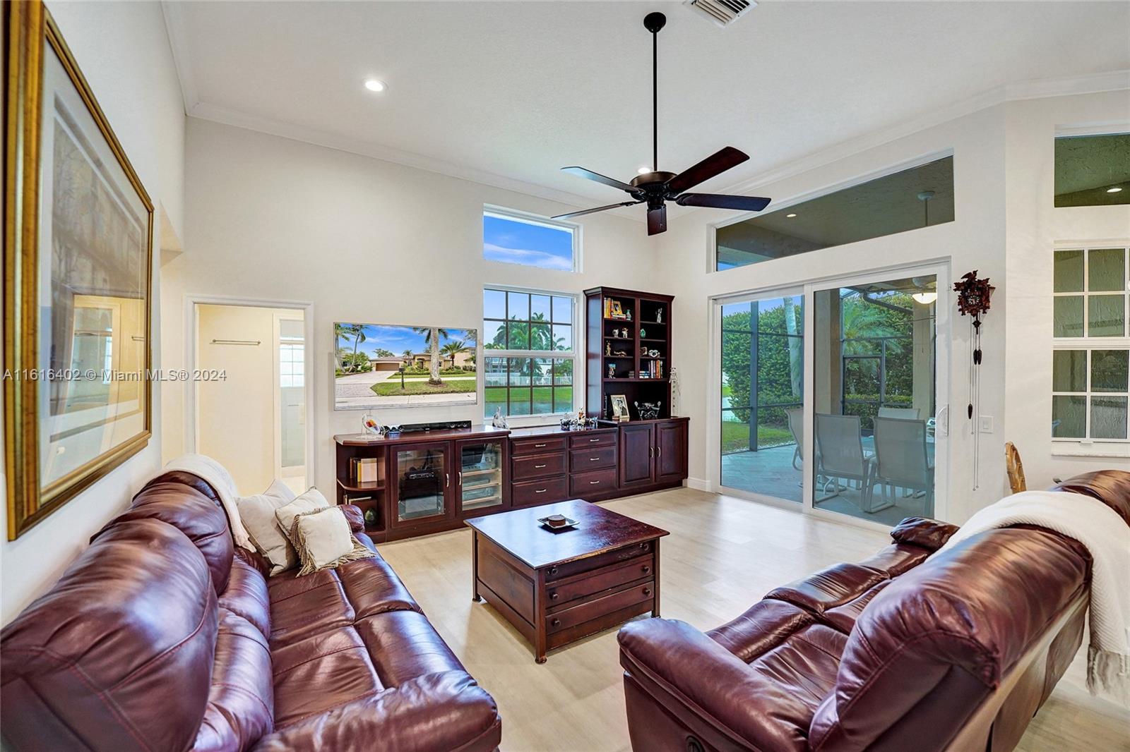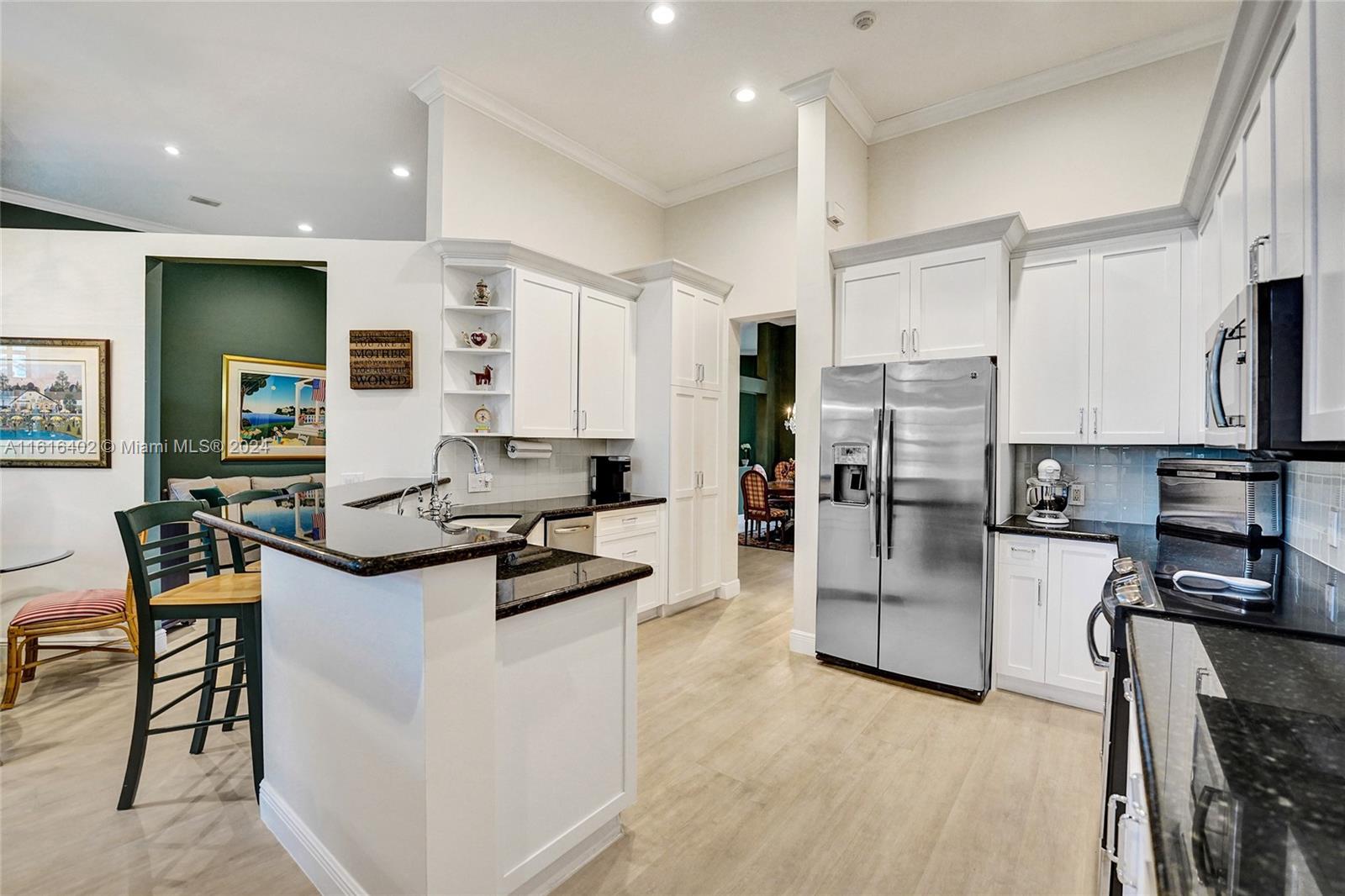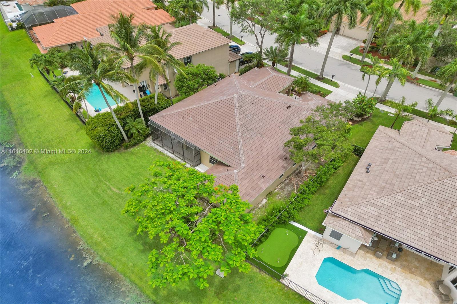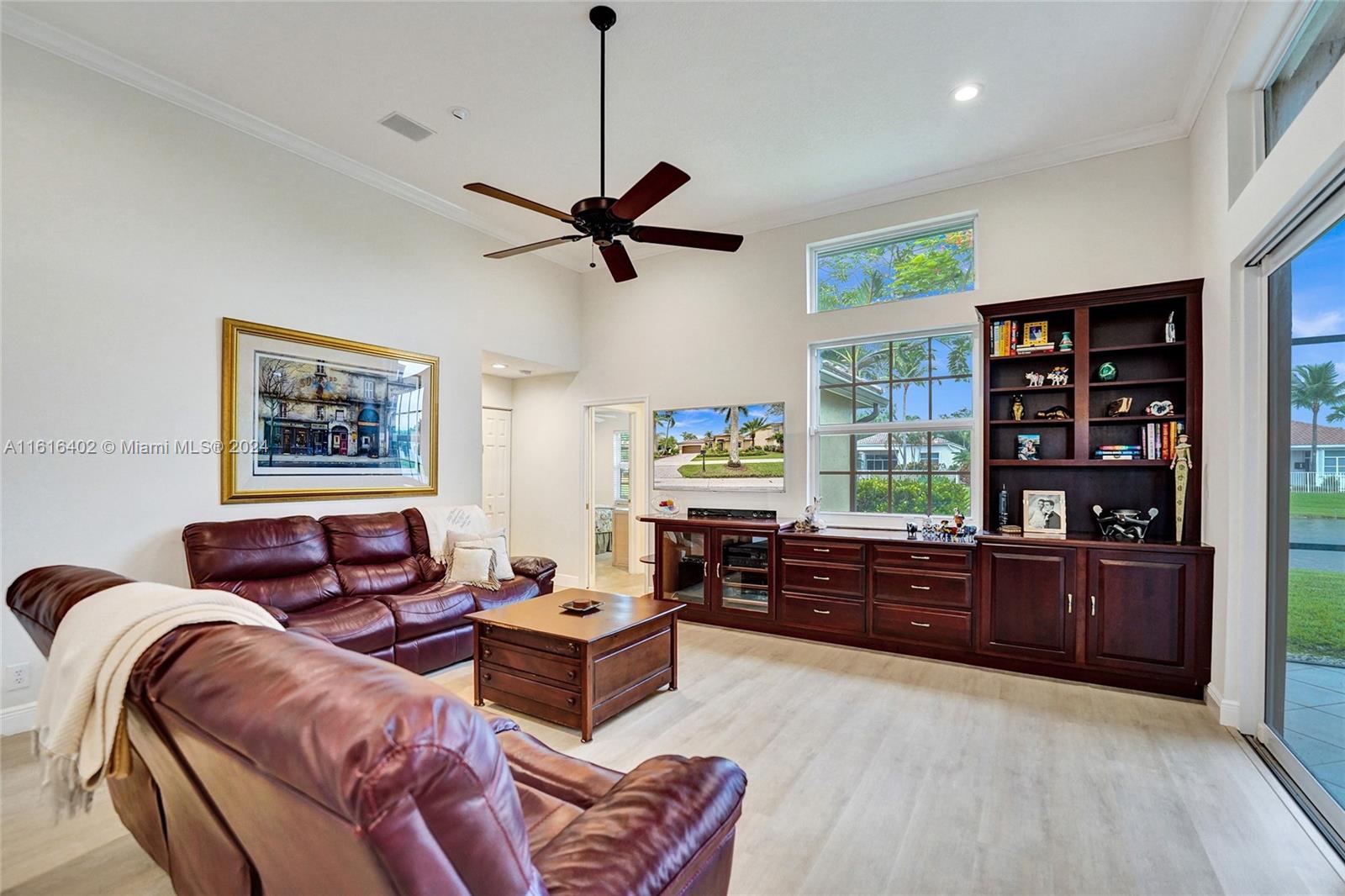 Tucked on a royal palm tree-lined street, this custom one-story home in Weston Hills CC offers modern comfort & elegance. Featuring a brand-new roof (2024) & full-impact doors/windows. Crown molding & luxury vinyl flooring throughout the main living areas. 4 spacious bedrooms, 3.5 bathrooms + a den, family room, & a sitting area in the master bedroom. Kitchen features upgraded stainless steel appliances, trash compactor & 3 ovens including an Advantium microwave that doubles as an oven. Additional features include a custom linen closet in the master bathroom along with a cabana bath, LED high-hats, oversized screened patio, & murphy bed. The garage includes built-in metal wall unit with drawers & cabinets. Gorgeous lake views from your private patio and ample space for a pool.