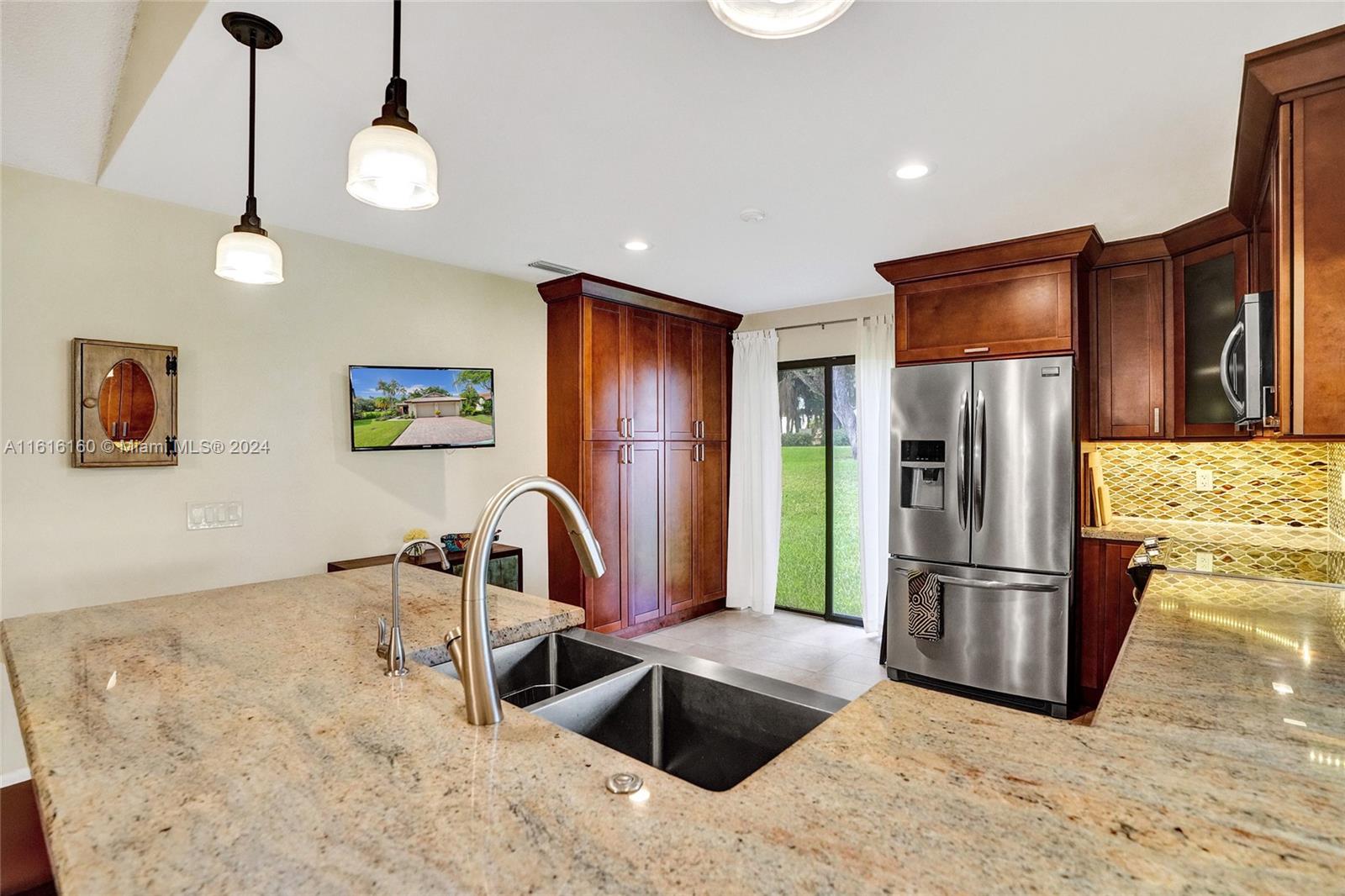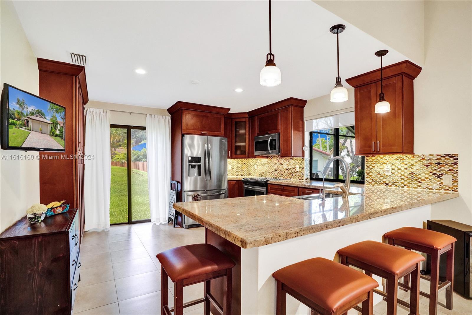 Welcome to this charming 3 bed 2 bath home in the Country Isles community of Weston. Located on a quiet cul-de-sac, this home offers both privacy and tranquility. The remodeled kitchen features wood cabinetry, granite countertops, and stainless steel appliances. The open layout seamlessly connects the living and dining areas, perfect for family gatherings and entertaining. Enjoy peace of mind with full accordion protection and unwind on the large screened patio, which is ideal for relaxing and enjoying the Florida weather. The 2-car garage features a finished floor, built-in storage cabinets on both sides and driveway pavers. This home combines a prime location close to Weston Town Center, schools, and parks. Make this wonderful property your own! Buyer’s Agent Welcomed!