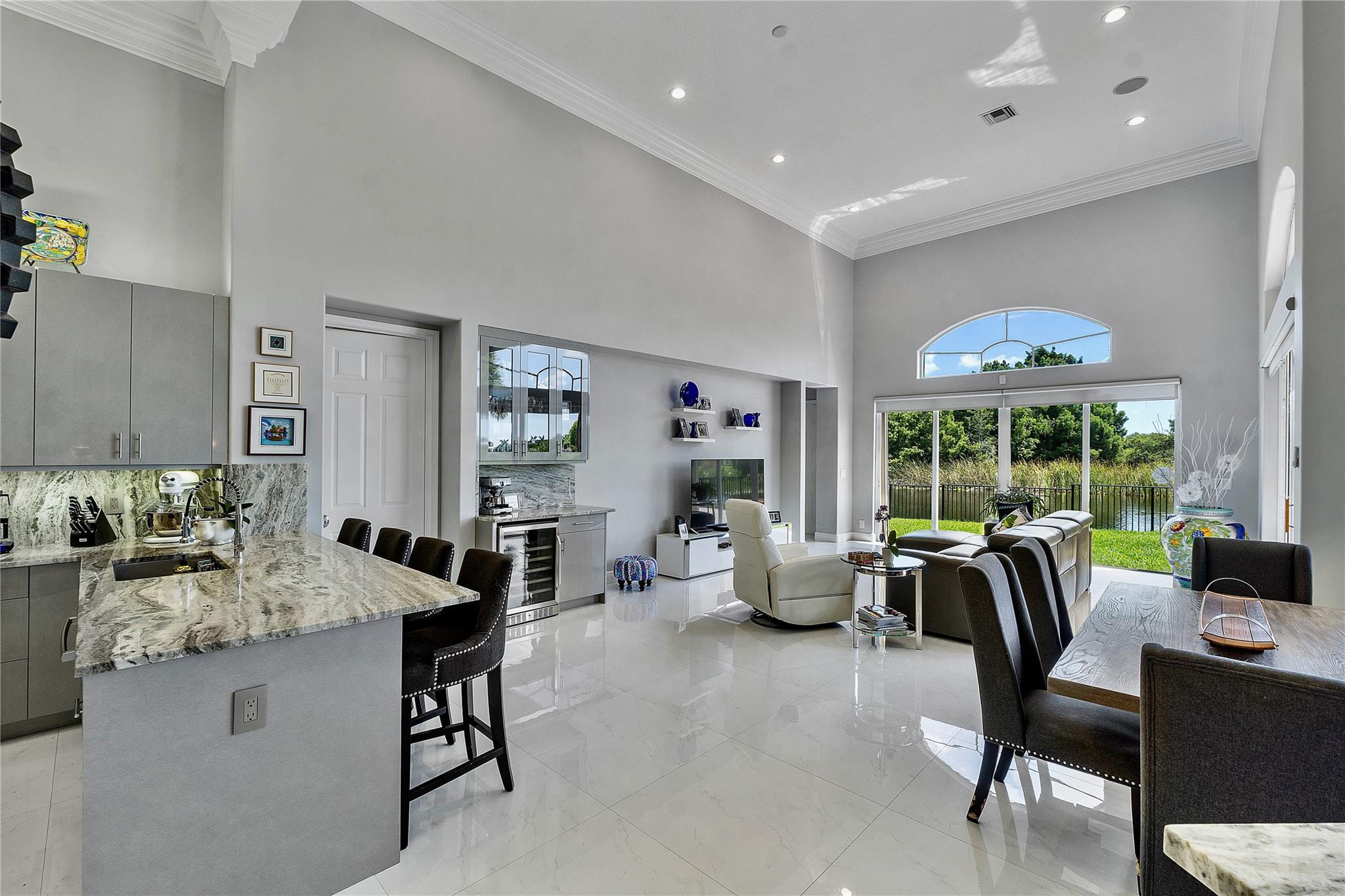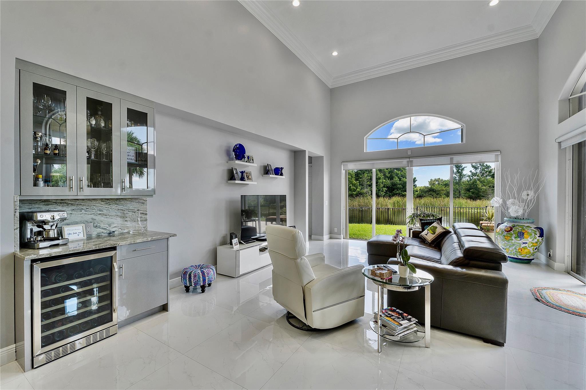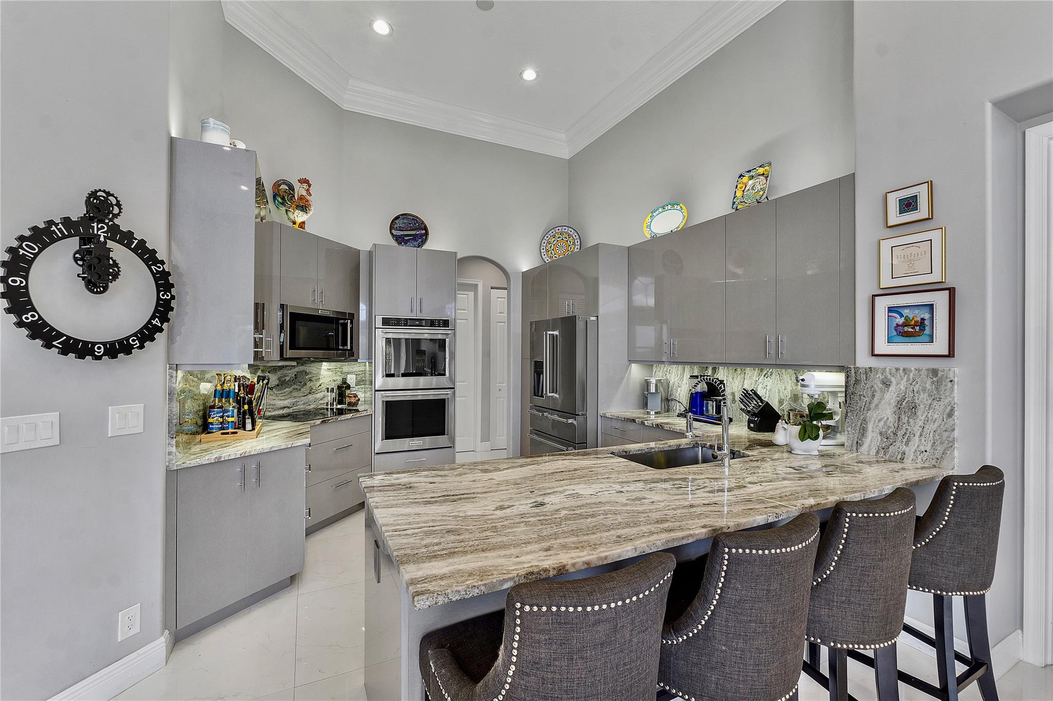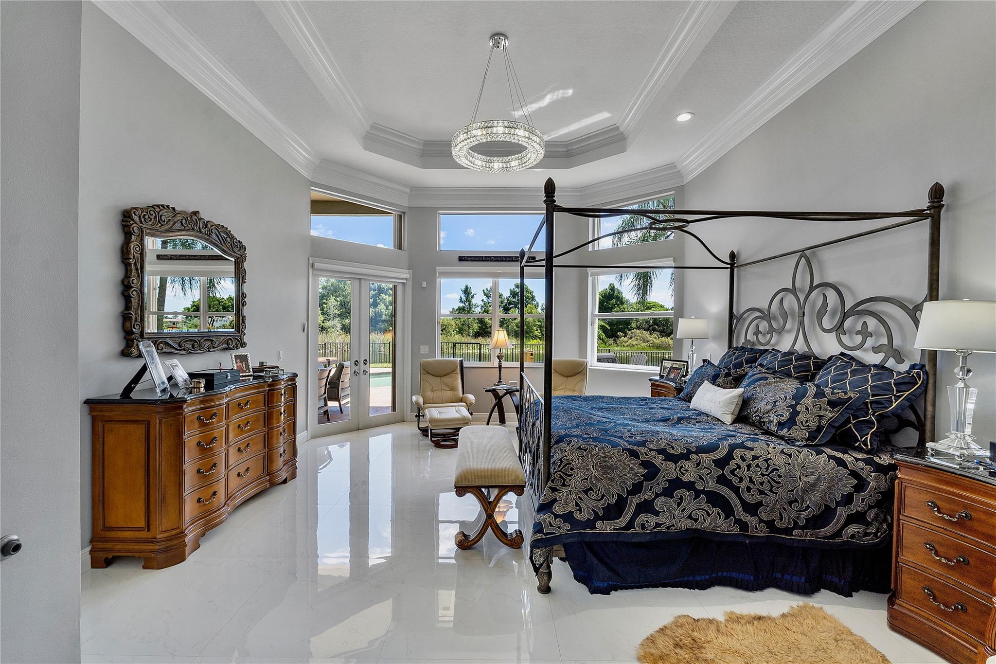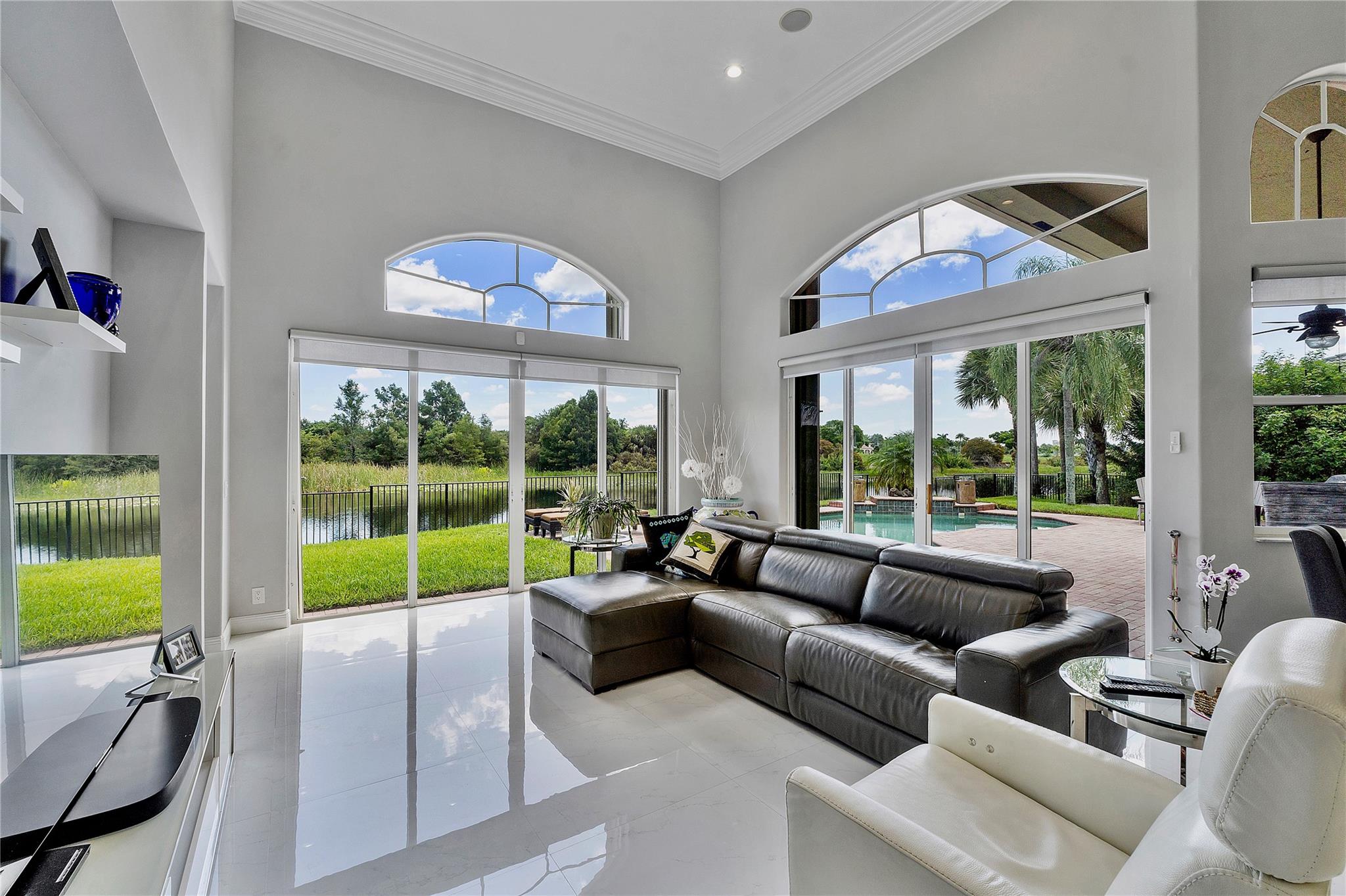 BRAND NEW TILE ROOF 2024. Upgraded elegant home with soaring ceilings and upgraded crown molding. Grand entry with bay windows and stunning views, creating a light and airy feeling. Kitchen features custom built 42” cabinets, granite counters and backsplash. Stainless appliances. Coffee/wine bar with wine refrigerator. Family room with 4 large sliding doors viewing private resort style lanai/pool area. Remote control window shades in family room and master bedroom. 32” porcelain zero grout line tile through out. Master suite with tray ceiling, crystal chandelier, French doors to lanai, windows and transoms giving spectacular views. Custom closets. Master Bath has frameless glass shower, deep soaking tub, chandelier, separate vanities. Formal dining room and living room. Den/media room.
