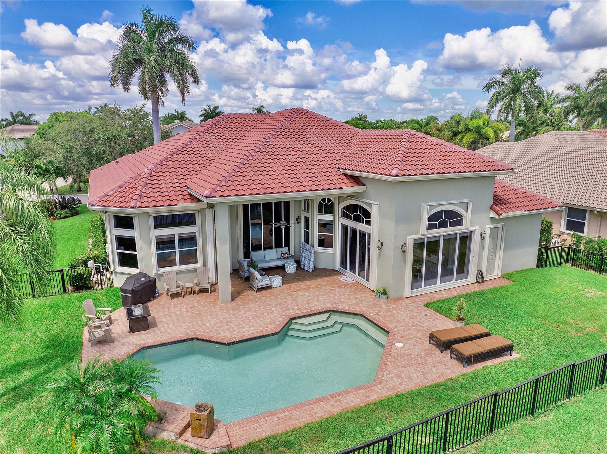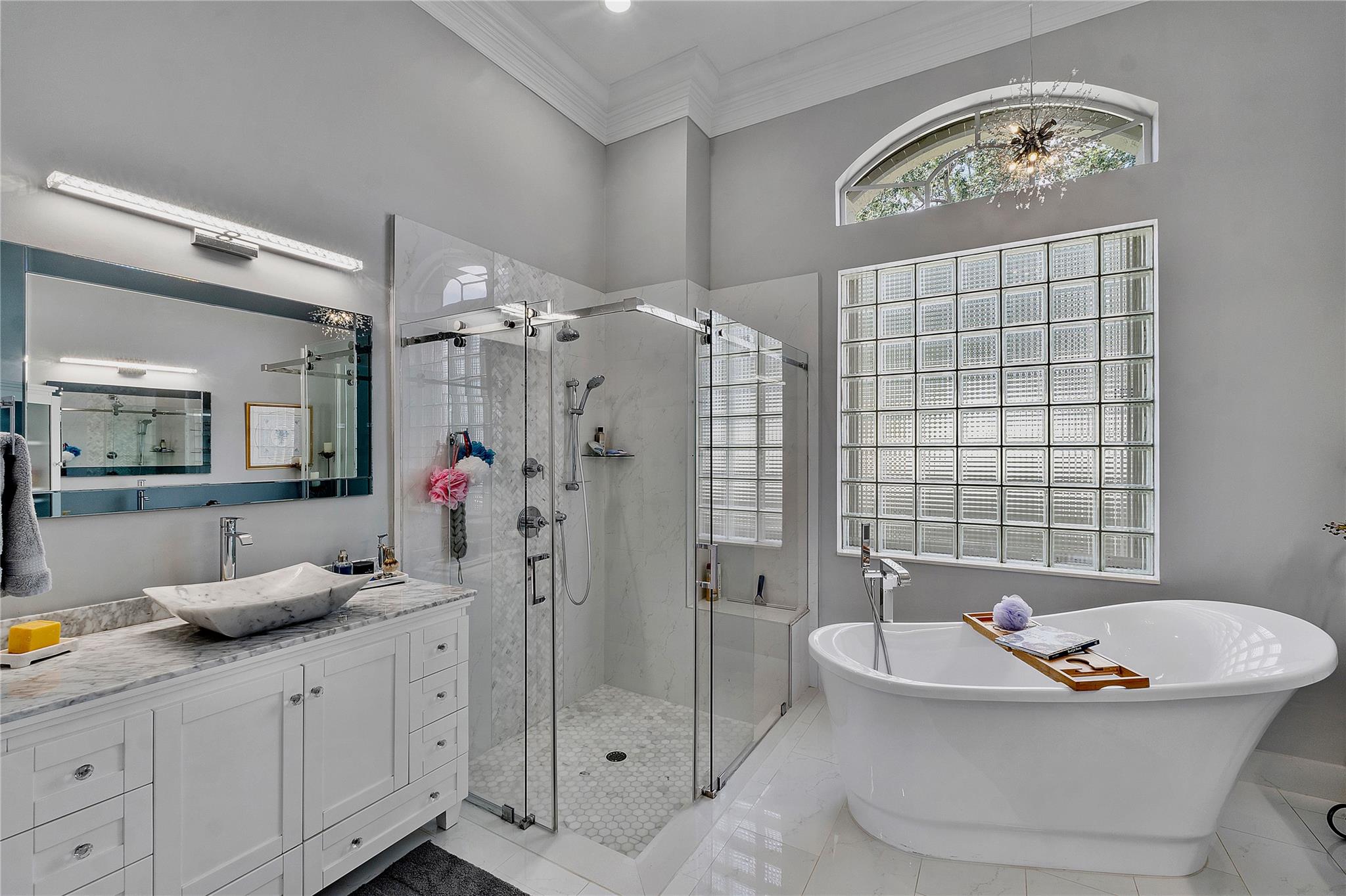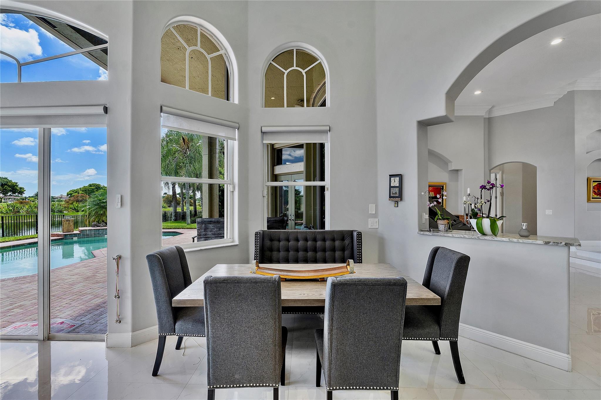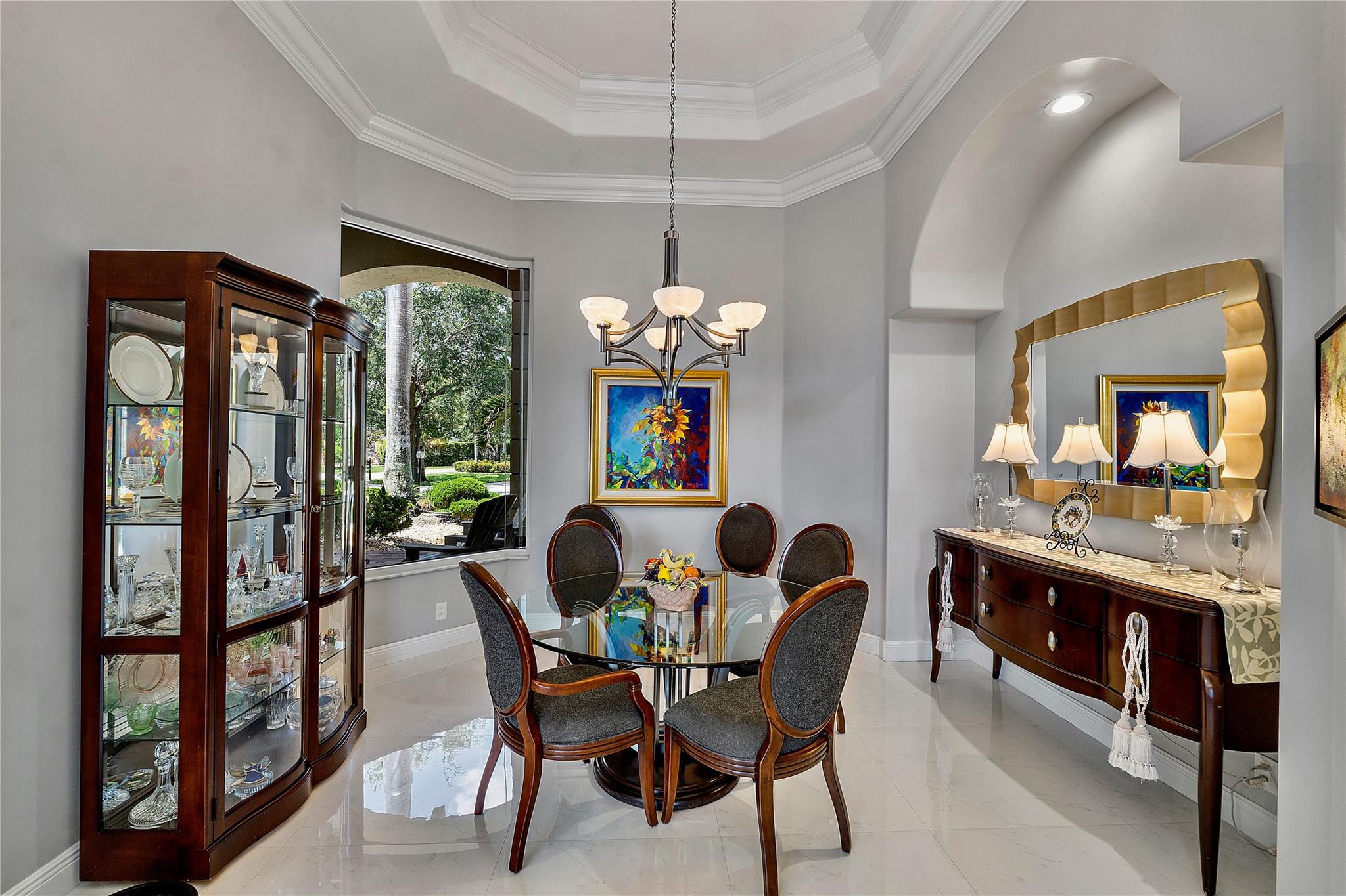 BRAND NEW TILE ROOF 2024. Upgraded elegant home with soaring ceilings and upgraded crown molding. Grand entry with bay windows and stunning views, creating a light and airy feeling. Kitchen features custom built 42” cabinets, granite counters and backsplash. Stainless appliances. Coffee/wine bar with wine refrigerator. Family room with 4 large sliding doors viewing private resort style lanai/pool area. Remote control window shades in family room and master bedroom. 32” porcelain zero grout line tile through out. Master suite with tray ceiling, crystal chandelier, French doors to lanai, windows and transoms giving spectacular views. Custom closets. Master Bath has frameless glass shower, deep soaking tub, chandelier, separate vanities. Formal dining room and living room. Den/media room.