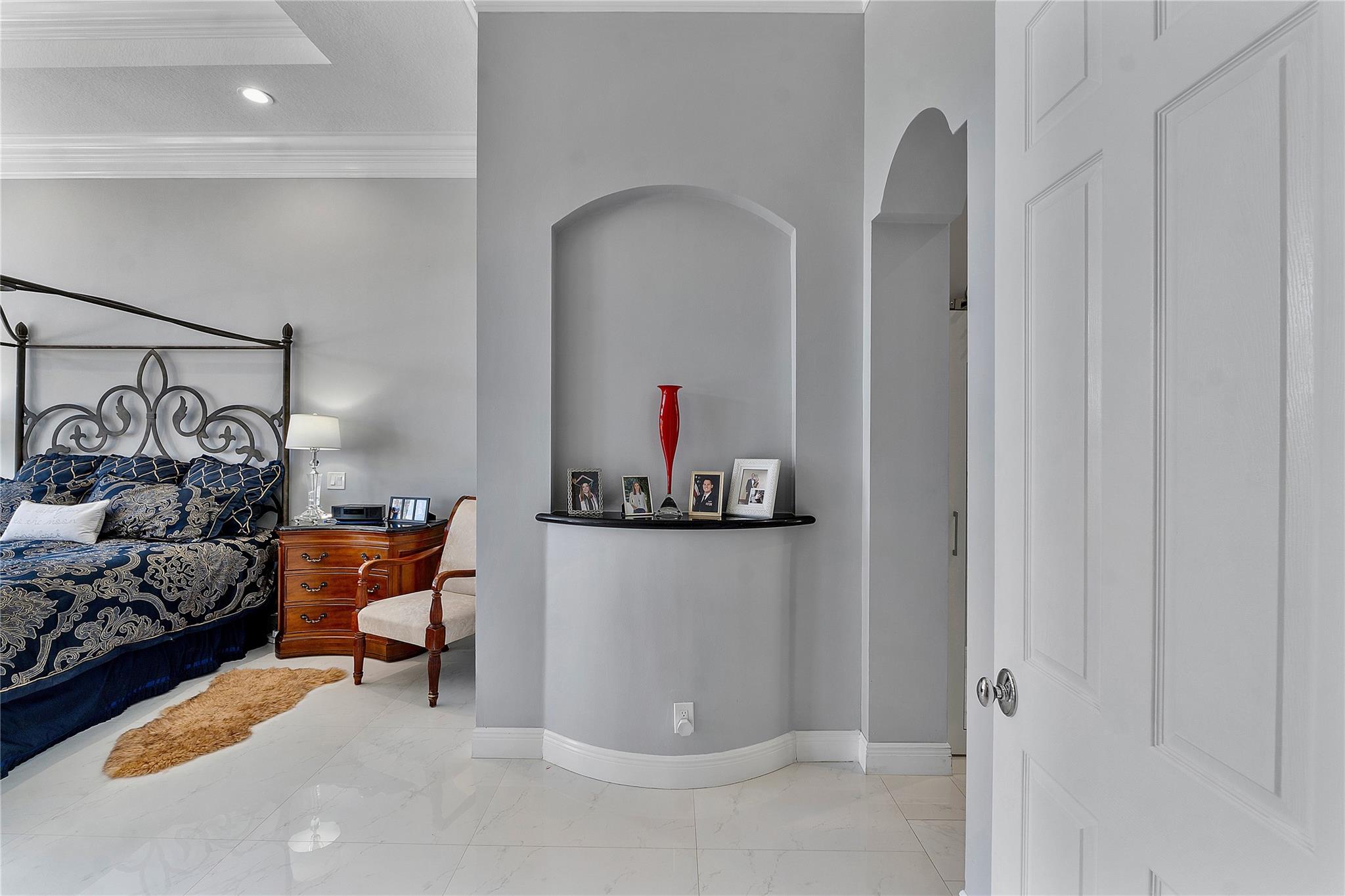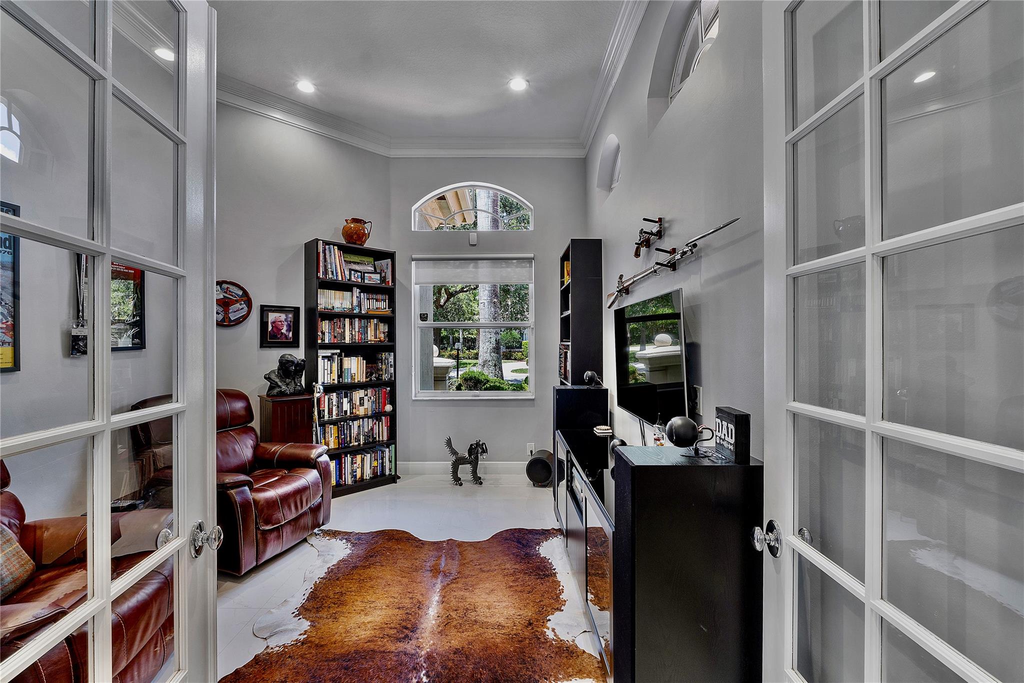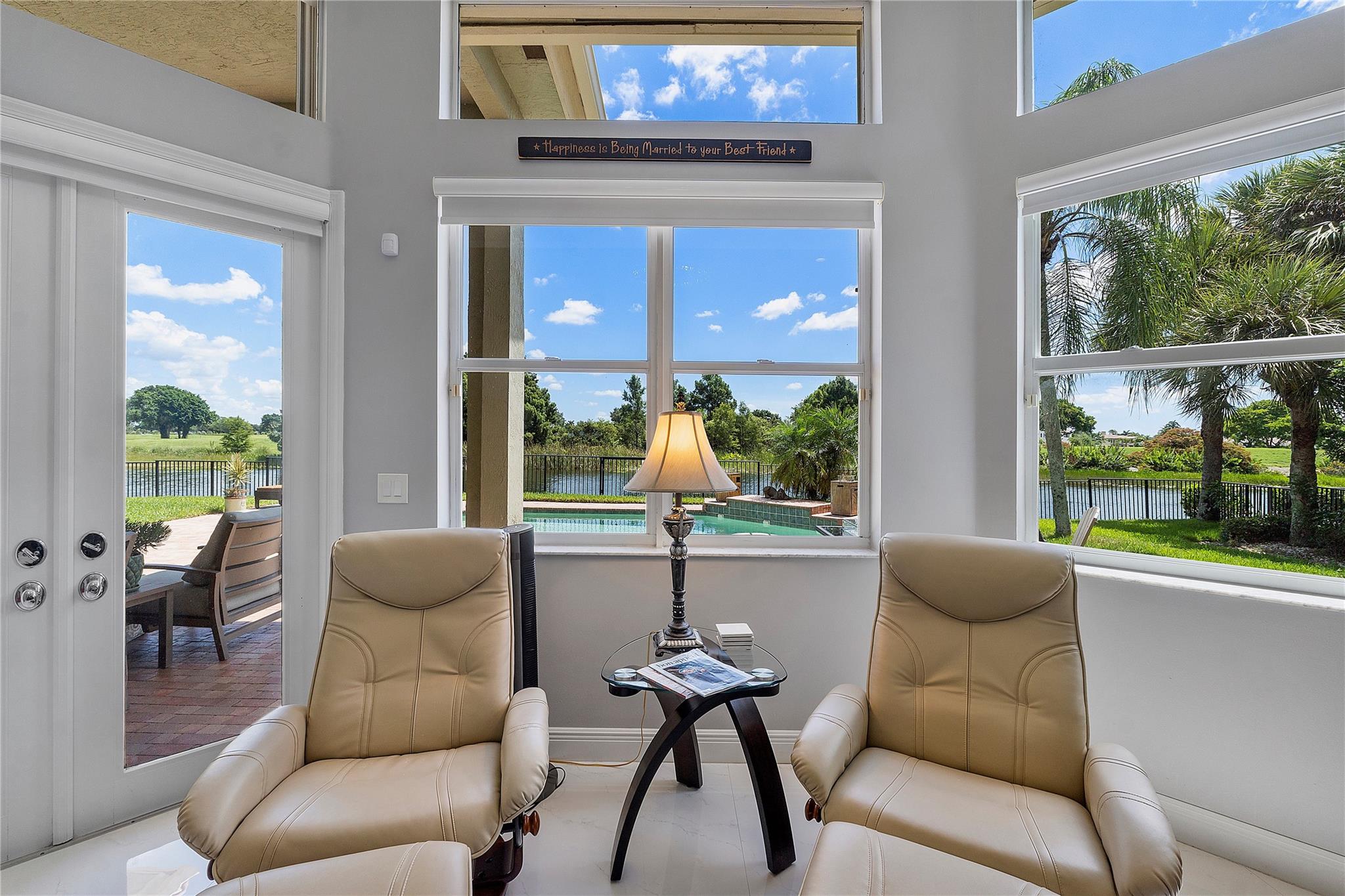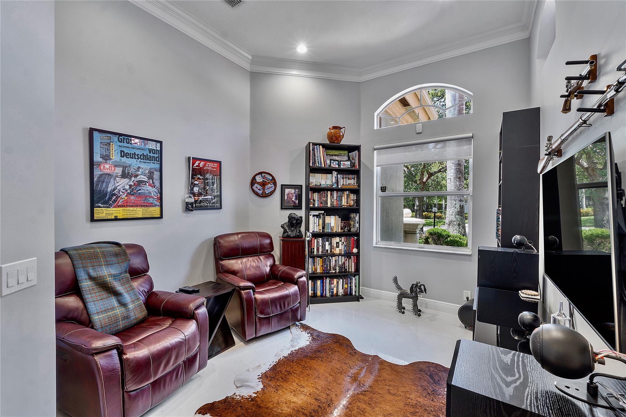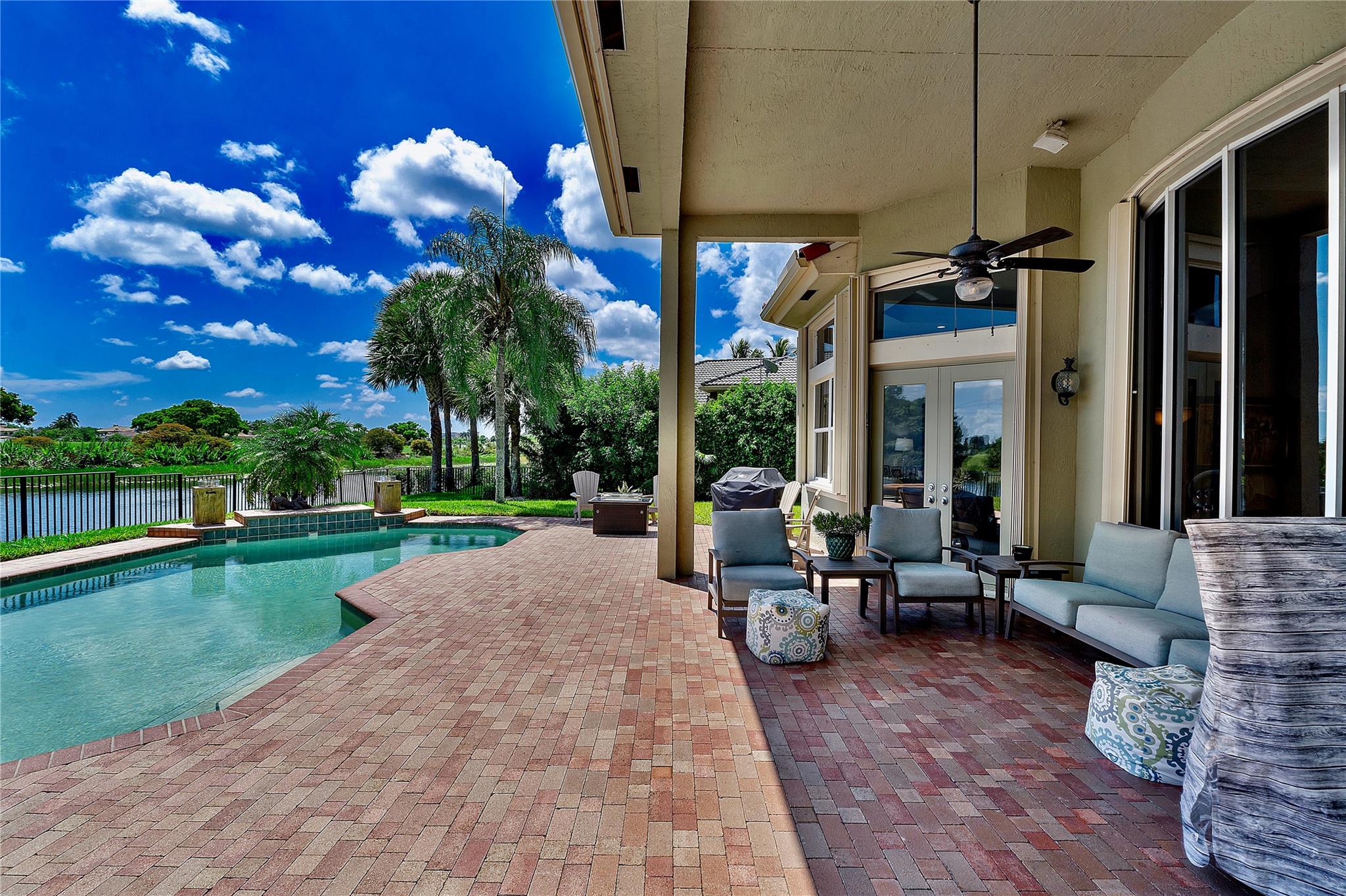 BRAND NEW TILE ROOF 2024. Upgraded elegant home with soaring ceilings and upgraded crown molding. Grand entry with bay windows and stunning views, creating a light and airy feeling. Kitchen features custom built 42” cabinets, granite counters and backsplash. Stainless appliances. Coffee/wine bar with wine refrigerator. Family room with 4 large sliding doors viewing private resort style lanai/pool area. Remote control window shades in family room and master bedroom. 32” porcelain zero grout line tile through out. Master suite with tray ceiling, crystal chandelier, French doors to lanai, windows and transoms giving spectacular views. Custom closets. Master Bath has frameless glass shower, deep soaking tub, chandelier, separate vanities. Formal dining room and living room. Den/media room.