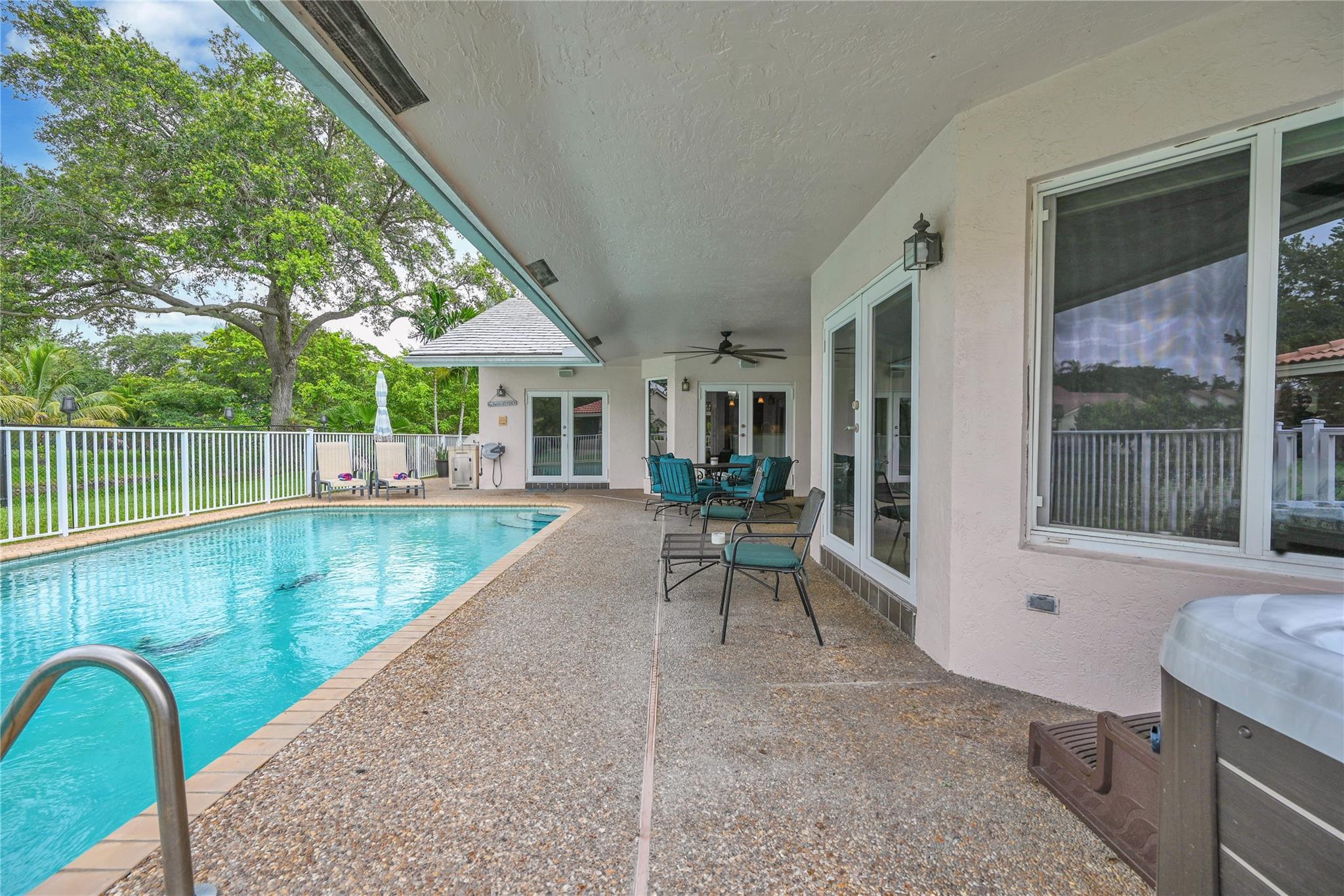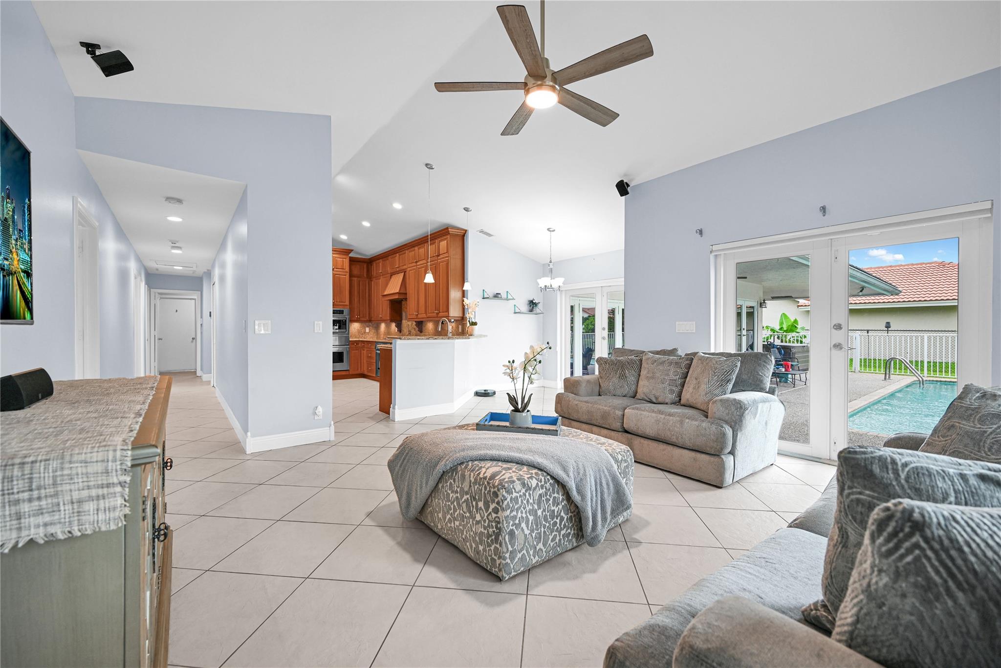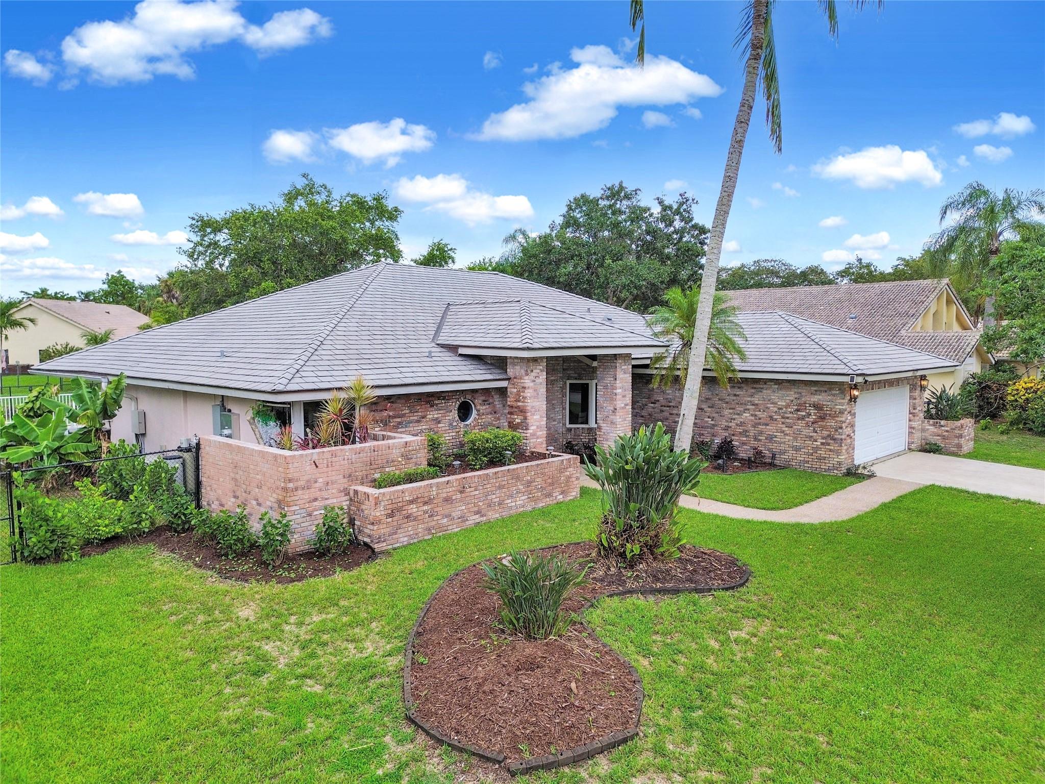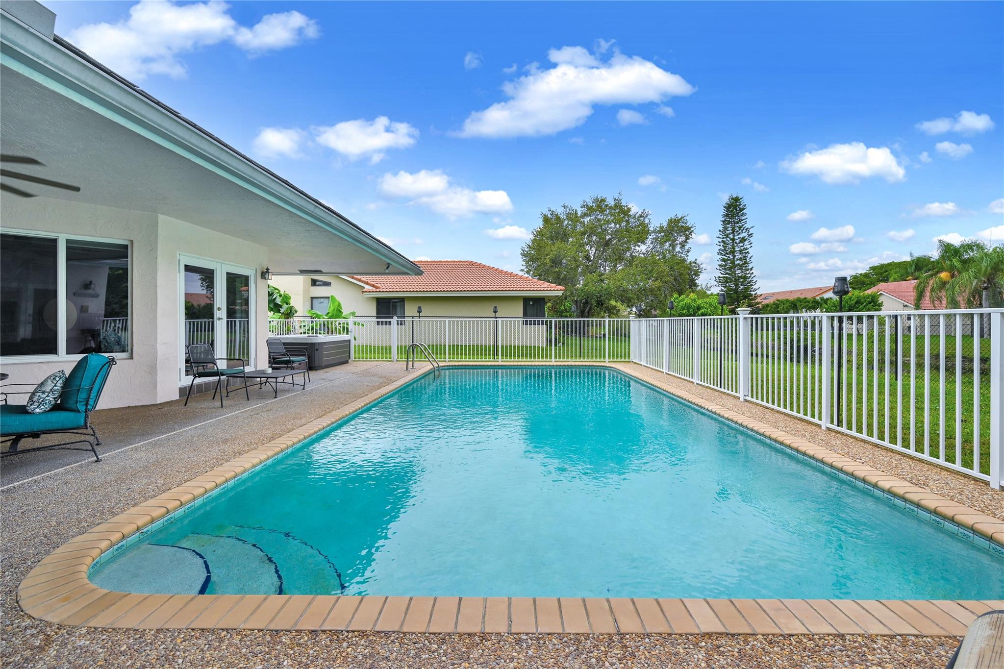 This 4 bedroom pool home in Pine Ridge offers a blend of luxury and practicality. Situated conveniently in Coral Springs, it boasts several attractive features such as hurricane impact windows and doors, ensuring safety and peace of mind during storms. The salt water pool and hot tub provide a relaxing retreat right in your backyard. Inside, the kitchen is equipped with high-end appliances including a Dacor stainless steel fridge, complemented by granite countertops. The vaulted ceilings add an airy, spacious feel to the living areas. The split-level bedroom floor plan ensures privacy. Smart features integrated throughout the home offer convenience and efficiency. With a low HOA, residents enjoy community living without excessive fees.