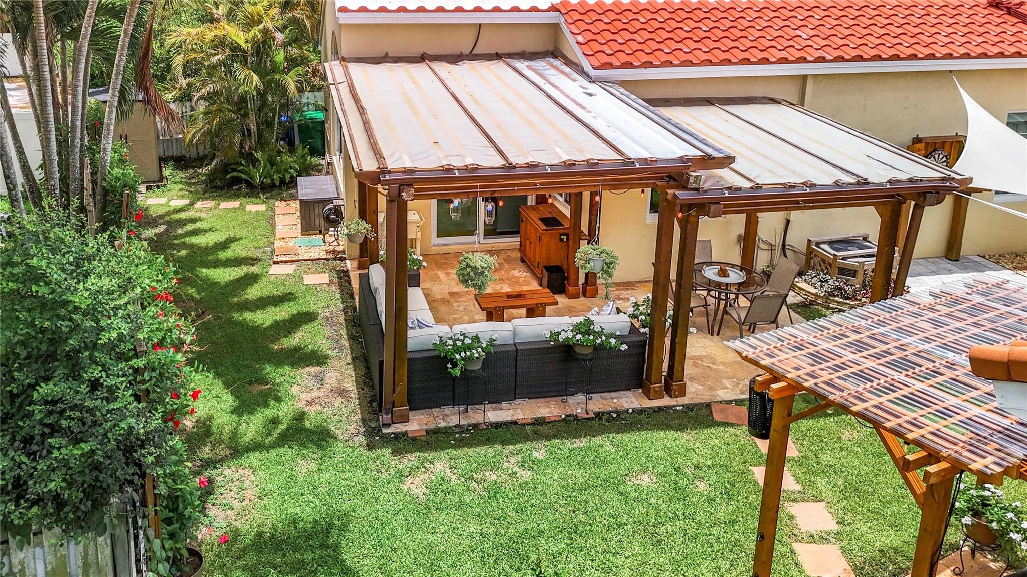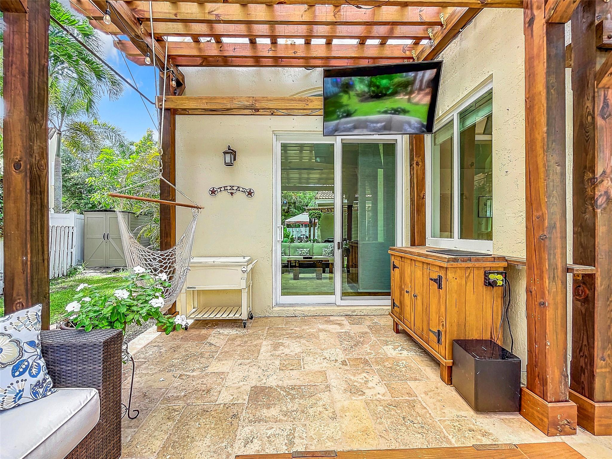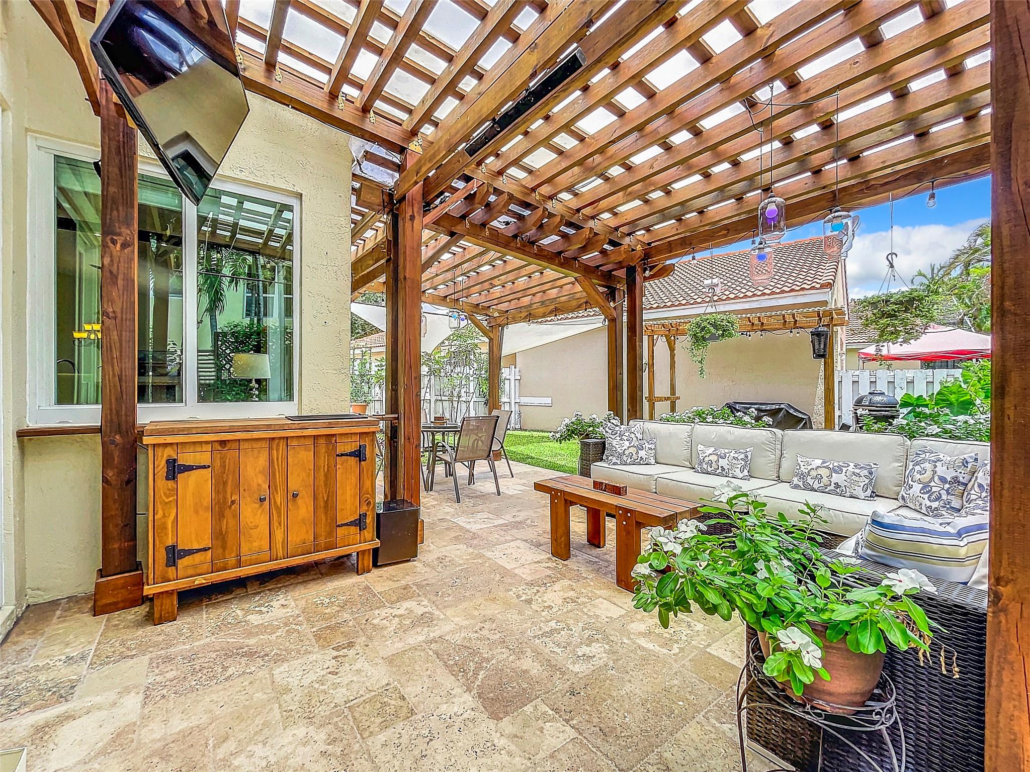 Must see this spectacular one-story home! Plenty of space for entertaining indoors or out! Featuring large Kitchen open to Family room and Dining room with vaulted ceilings, High Impact Windows providing lots of natural light. Split bedroom plan, custom closets and hardwood floors. Primary suite w seated area, dual sinks, and shower. Remodeled backyard covered patio w custom Pergola with furnishings, mounted TV, storage hutch, mood lighting and speakers, Grill & Smoker-Perfect setting for all gatherings! New roof 2024. Newer appliances. Security system. Starter or downsizing, tour this lovely 3B/2B, 2 car garage, fenced, in the gated community located in Davie, Regency sq, next to Southwest Ranches and Weston. Close to Shops, Parks, Cleveland Clinic/Hospital and more. A rated schools.