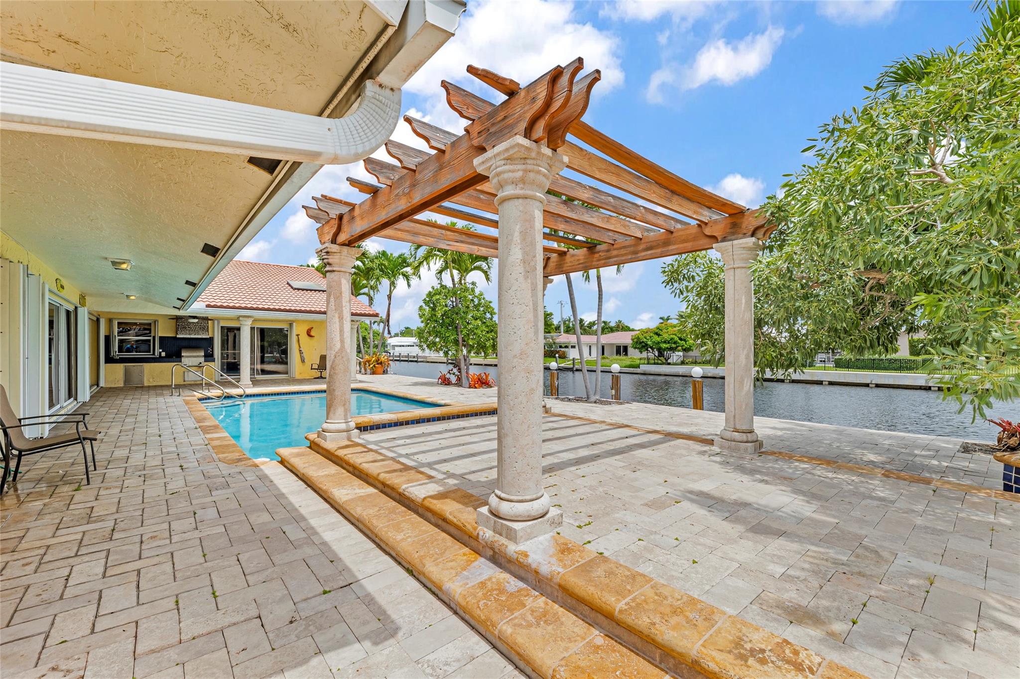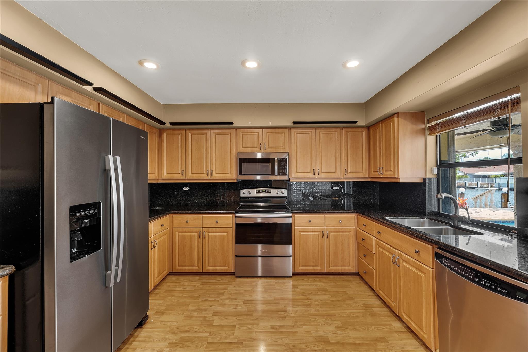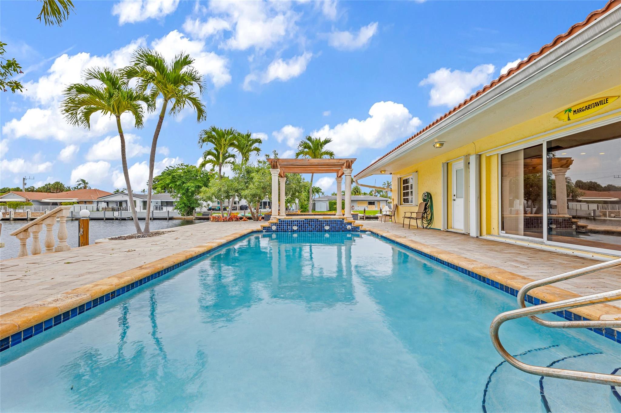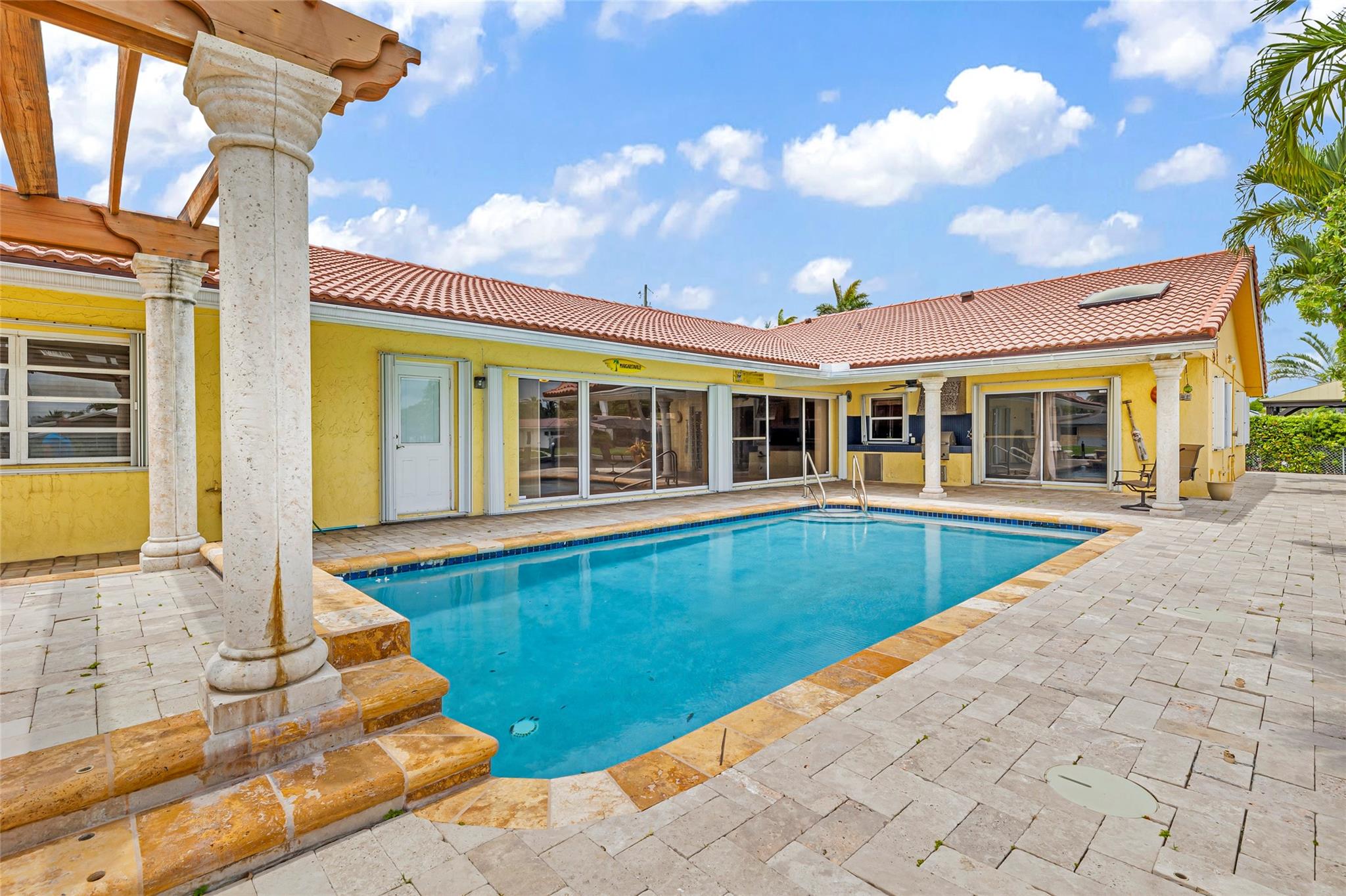 **Ready for Its New Owner!** Discover this stunning residence, perfectly situated on a sprawling point lot with approximately 200 feet of waterfront in the prestigious Lake Estates within the Landings area of Fort Lauderdale. This beautiful home boasts a large pool with a cascading waterfall, a pergola, and a built-in outdoor grill area, perfect for entertaining. Inside, you'll find spacious family rooms, generously sized rooms, tons of closets, heated pool, central vacuum system, 2 year old kitchen appliances and much much more. Located at the end of a quiet cul-de-sac, you're just moments away from the beach, shops, and restaurants. Whether you want to entertain, relax, or enjoy your morning coffee, this home has it all. A must-see inside and out!