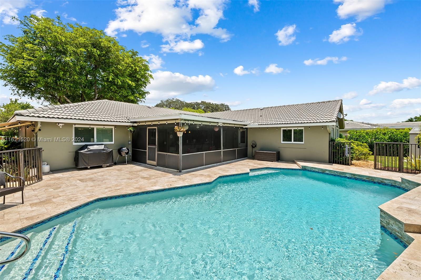 Welcome to 1046 NW 82nd Terrace in the desirable Ramblewood community! This beautifully maintained & rarely available 5 bedroom, 2-bath pool home features a triple-split plan on an oversized corner cul-de-sac lot. Enjoy a manicured oasis with a private, fenced yard, heated saltwater pool, travertine pavers, screened lanai, & landscape lighting for ambiance. Inside, updates include Kitchen Aid appliances, elegant wood floors in living areas, & fresh paint throughout. Bedrooms have new flooring, & baths were redone in 2018/2020. Newer A/C & ductwork (2018), water heater (2016), hurricane impact windows throughout the home, with the expectations of hurricane shutters for the patio sliders. Roof was last replaced 2006. Move-in ready with no HOA—Don’t miss the opportunity to call this one HOME!