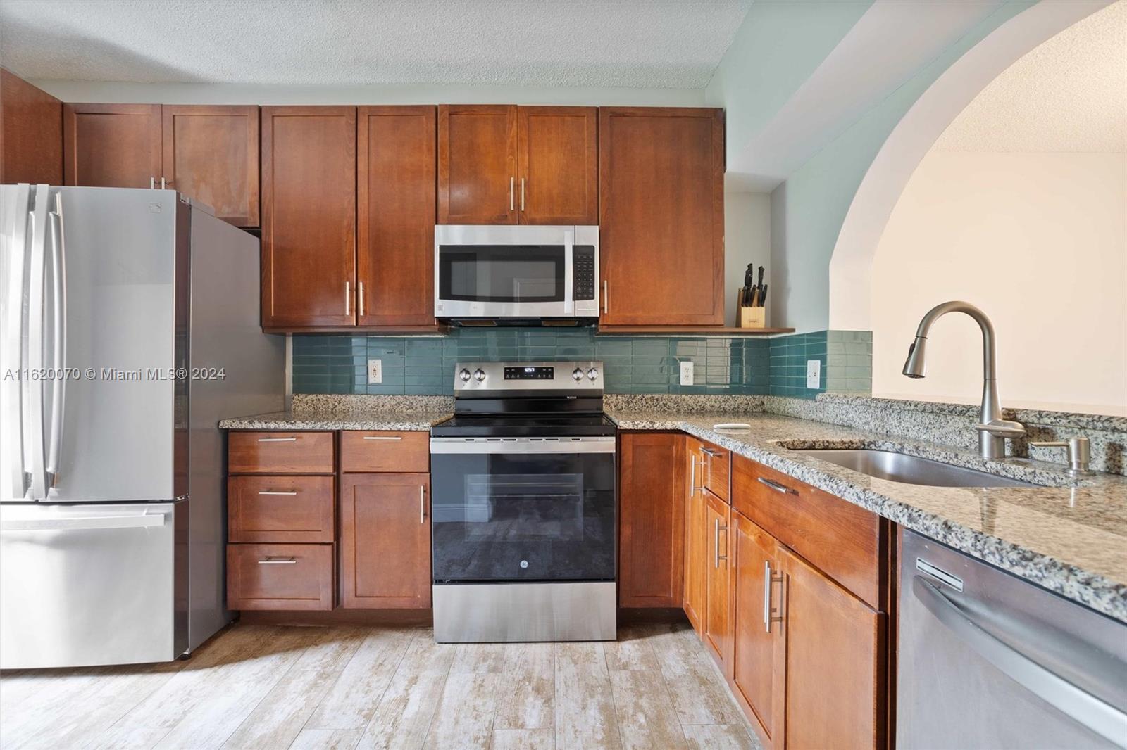 Beautifully updated/remodeled 2-bedroom 2.5 bathroom townhome in desirable, gated Coral Reef Club! Outstanding features include beautiful kitchen w/ granite countertops & expanded pass thru window to dining area; private patio w/ completely fenced yard & motorized awning; accordion shutters on all windows & patio; interior laundry & more. Upgrades include newer wood-look tile floors downstairs; renovated bathrooms; brand new refrigerator & stove; newer washer/dryer; brand new A/C & newer water heater! Highly sought community located in outstanding school district & close to shopping/dining! Amenities include pool, playground, basketball court! HOA fee includes insurance, roof, lawn service & garbage pickup. Great investment opportunity, can be rented right away!