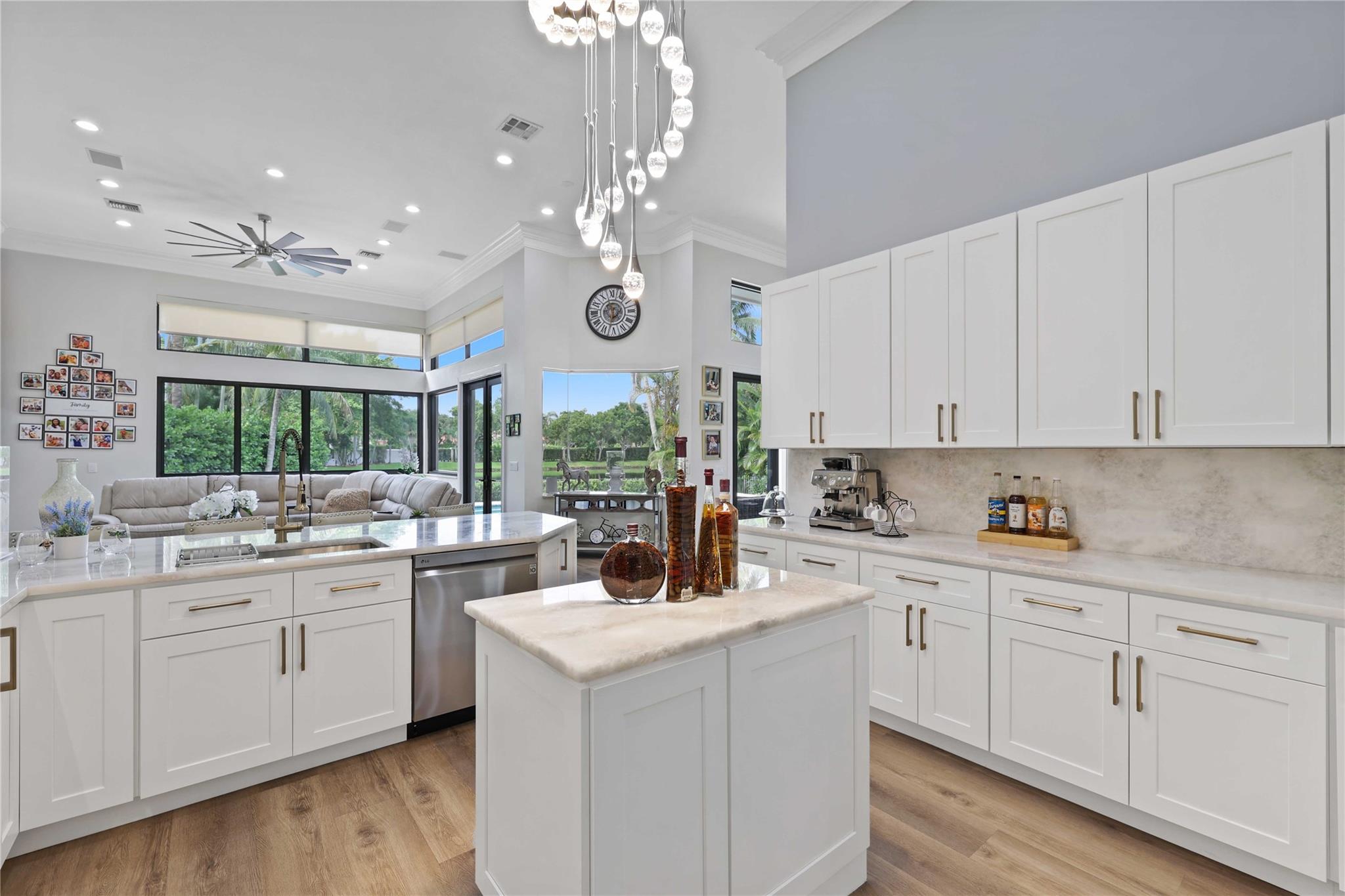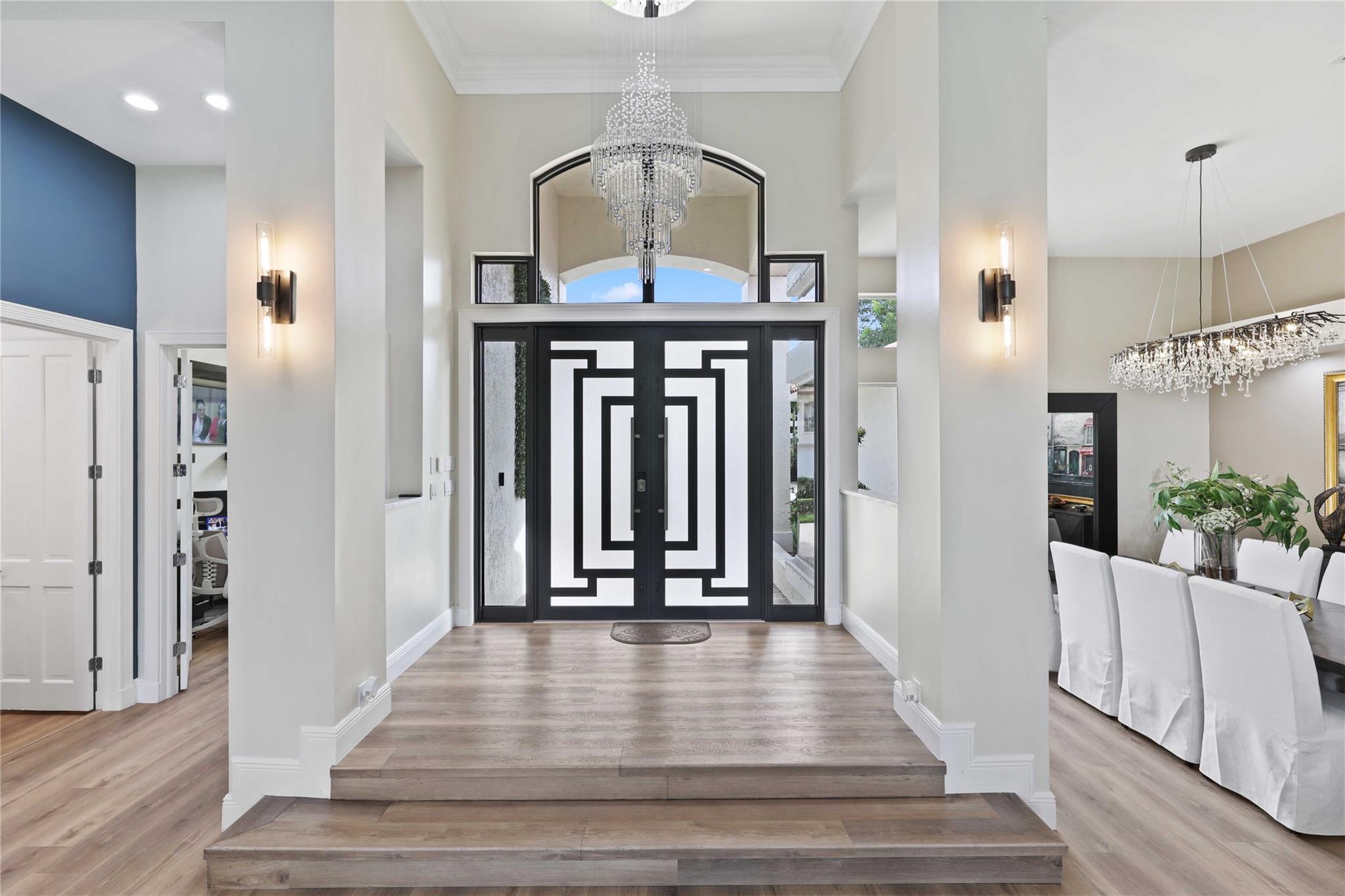 Exquisite Lakefront Estate in Plantation Palms Welcome to this exclusive listing in the prestigious, guard-gated community of Plantation Palms. This rare listing is a fully updated lakefront estate featuring 4 bedrooms, 3.5 baths, and a custom office. The triple split open floor plan boasts volume ceilings and abundant natural light. Enjoy the chef’s kitchen with quartz countertops and ss appliances, with a custom bar, ice maker, and wine fridge. Features include elegant Italian-inspired flooring, LED lighting, smart toilets, impact windows and doors, Media Room and EV charger. The master suite offers his-and-hers walk-in closets with a wet room master bathroom. Outside, discover a private backyard oasis with a saltwater pool, grill area, and stunning private fountain lake views.
