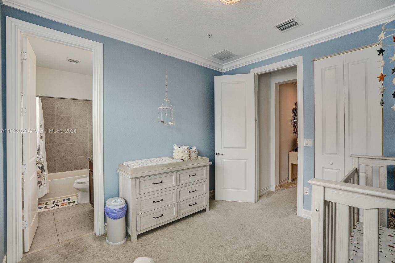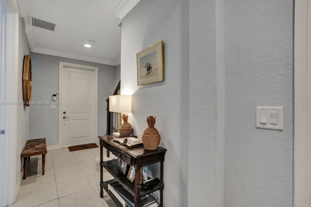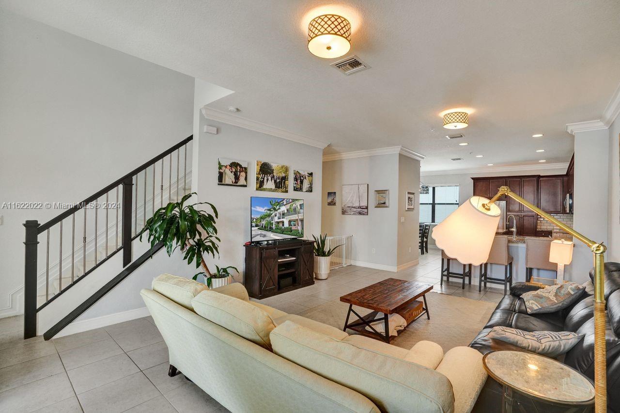 Welcome to this stunning tri-level townhome, in the sought-after community of Raintree. All three bedrooms have their own full bathroom, with a half bathroom in the main living area. The ground level features one bedroom with a walk-in closet. The primary bedroom is on the third level and features a shower, double sink, and a sitting area. The third bedroom has a full bathroom with a tub. Tile and carpet flooring. The kitchen with stainless steel appliances, a cooking island, and a formal dining area. The second and third floor has an outdoor balcony for your own private retreat. Numerous upgrades including custom crown molding throughout the entire home, upgraded staircases and kitchen backsplash. Impact windows. Two-car garage. Amenities include a community pool, clubhouse, and gym.