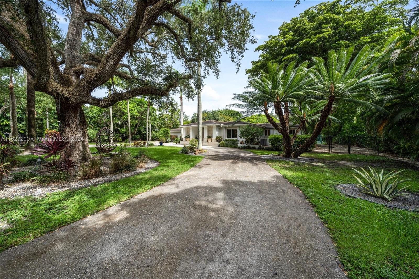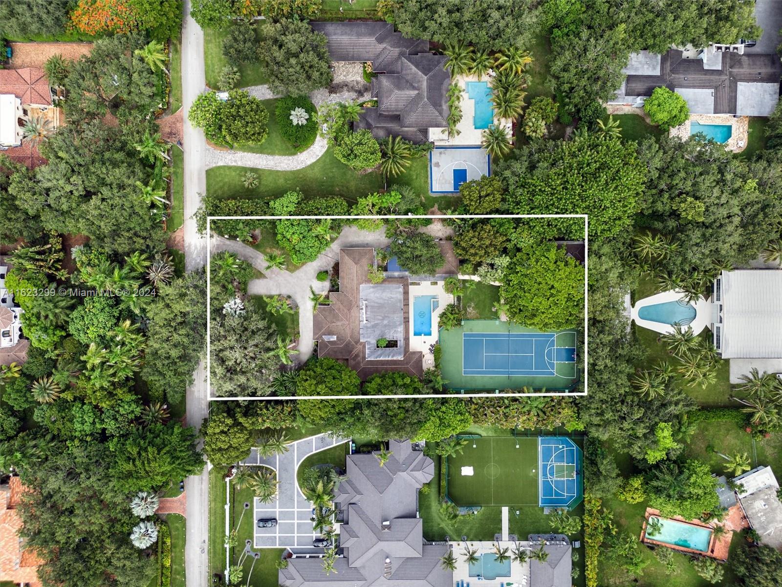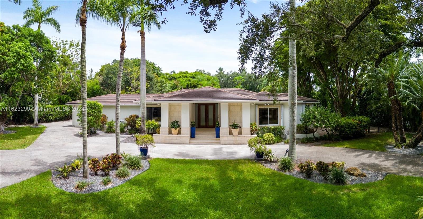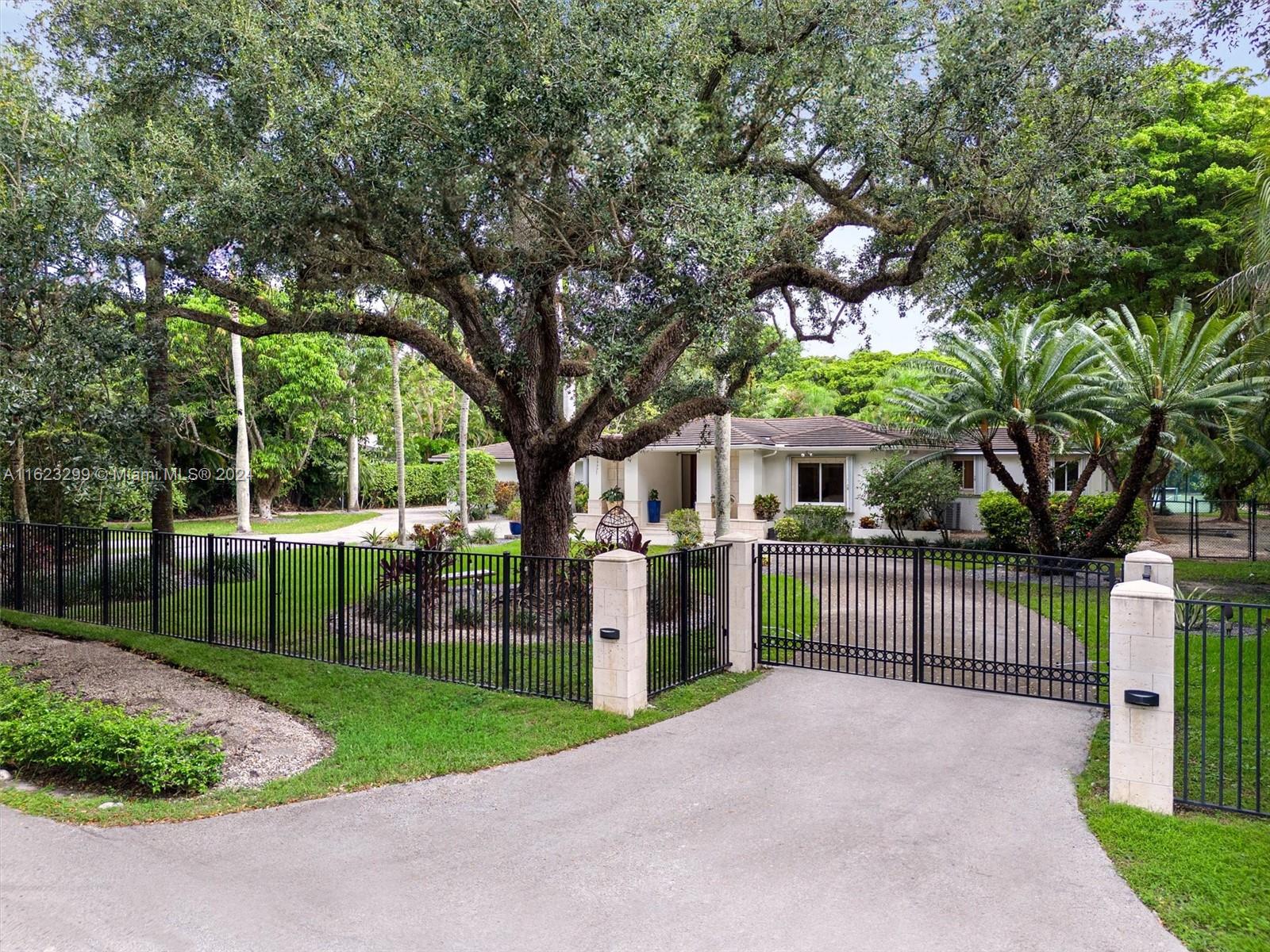 Welcome to your private oasis in North Pinecrest! This stunning one-story gated retreat spans 7,476 total sq. ft. on a lushly landscaped 50,529 sq. ft. lot, blending luxury and tranquility. The spacious 4BR/3BA main house boasts a new gourmet kitchen with Viking appliances, living room, dining room, family room, home office, and media room. Other amenities include a 1BR/1BA guest house & fitness studio w/ half bath. The expansive backyard is an entertainer's paradise, with a sparkling pool, Jacuzzi, and summer kitchen. Enjoy the lighted north/south tennis court, relax in the tiki hut, or stroll the nature trail. Additional features include a newer roof, whole-house generator, hurricane protection, 2-car garage, and 2-car carport. Experience the ultimate in luxury in your private sanctuary.
