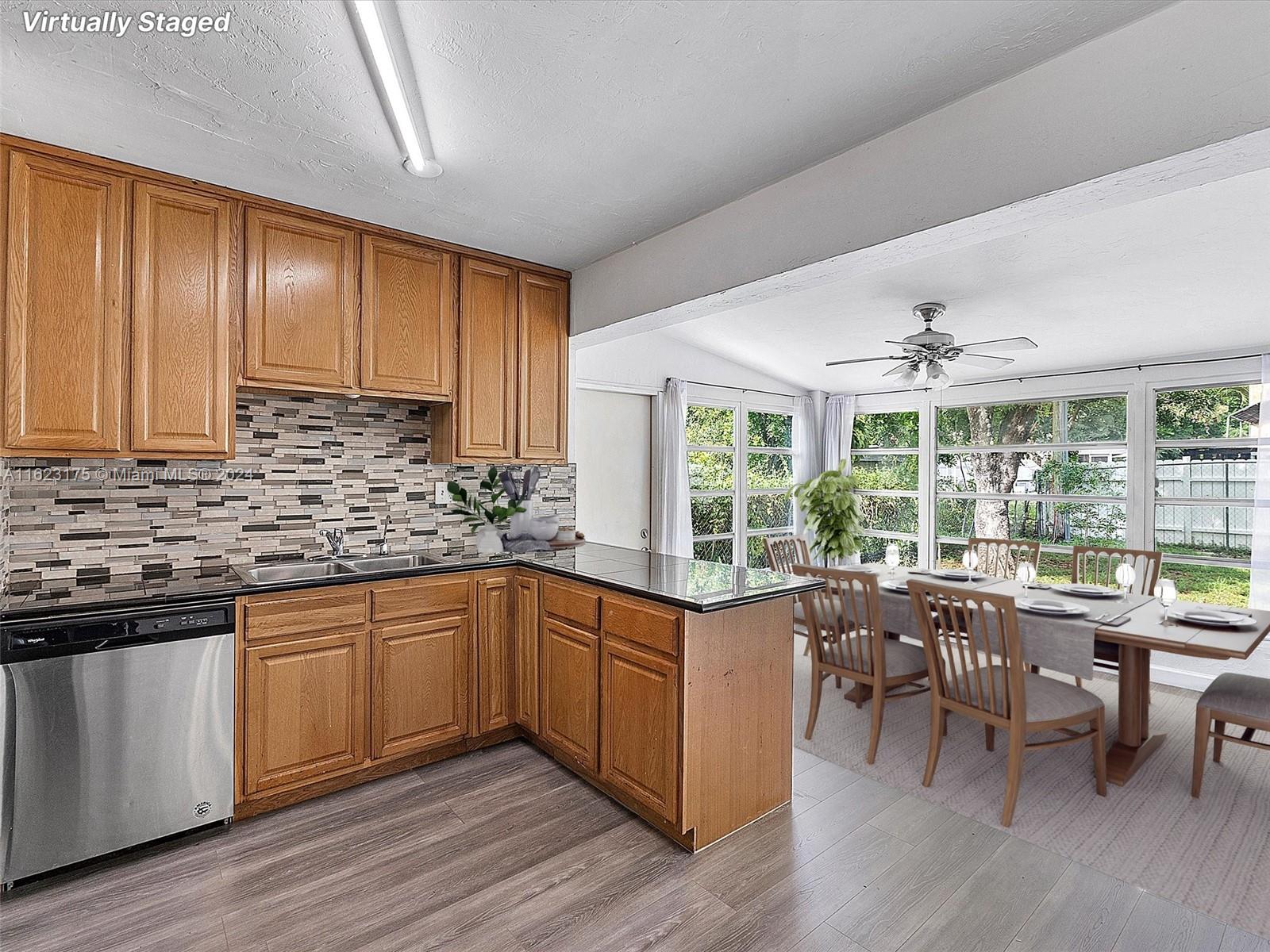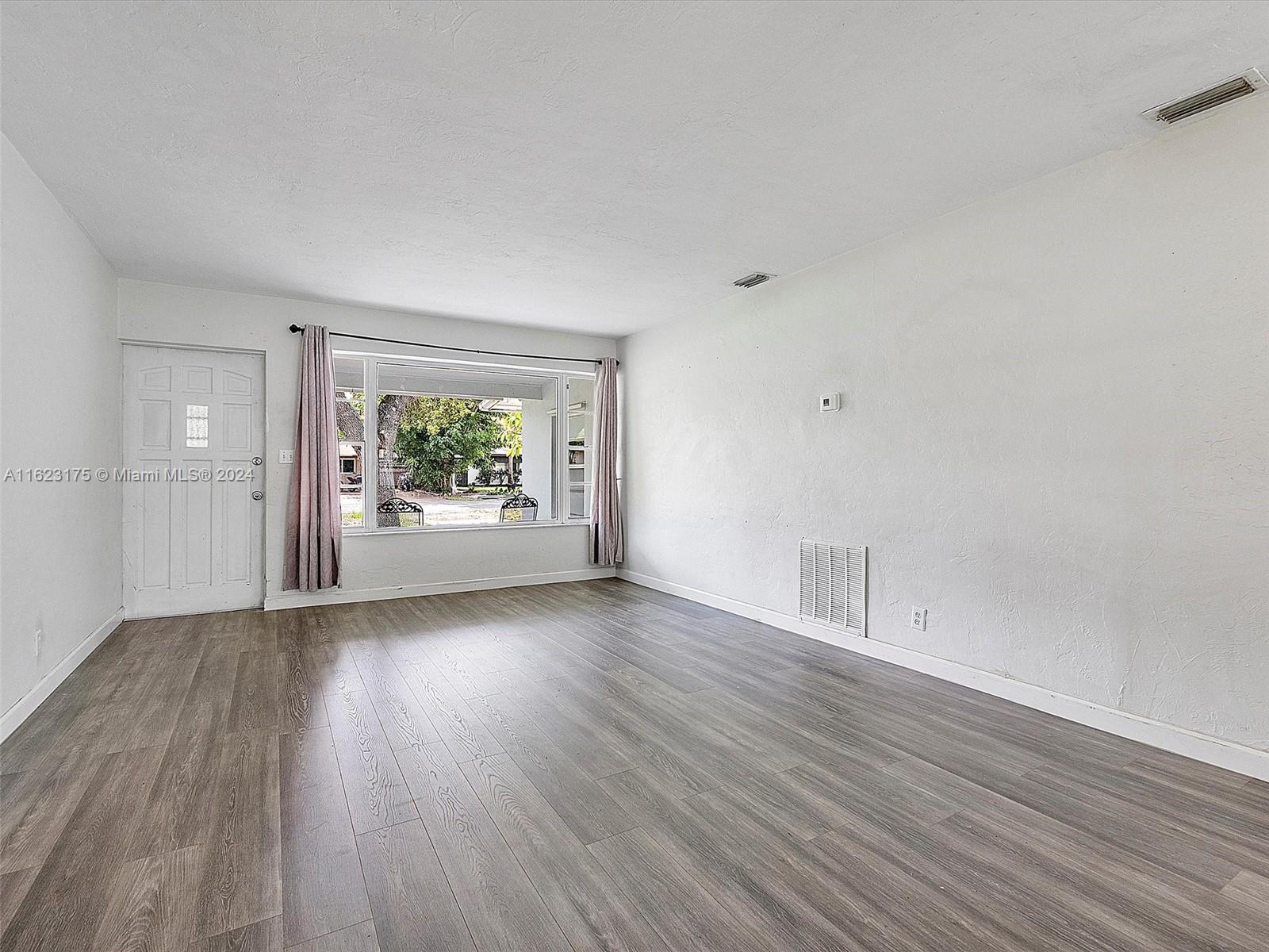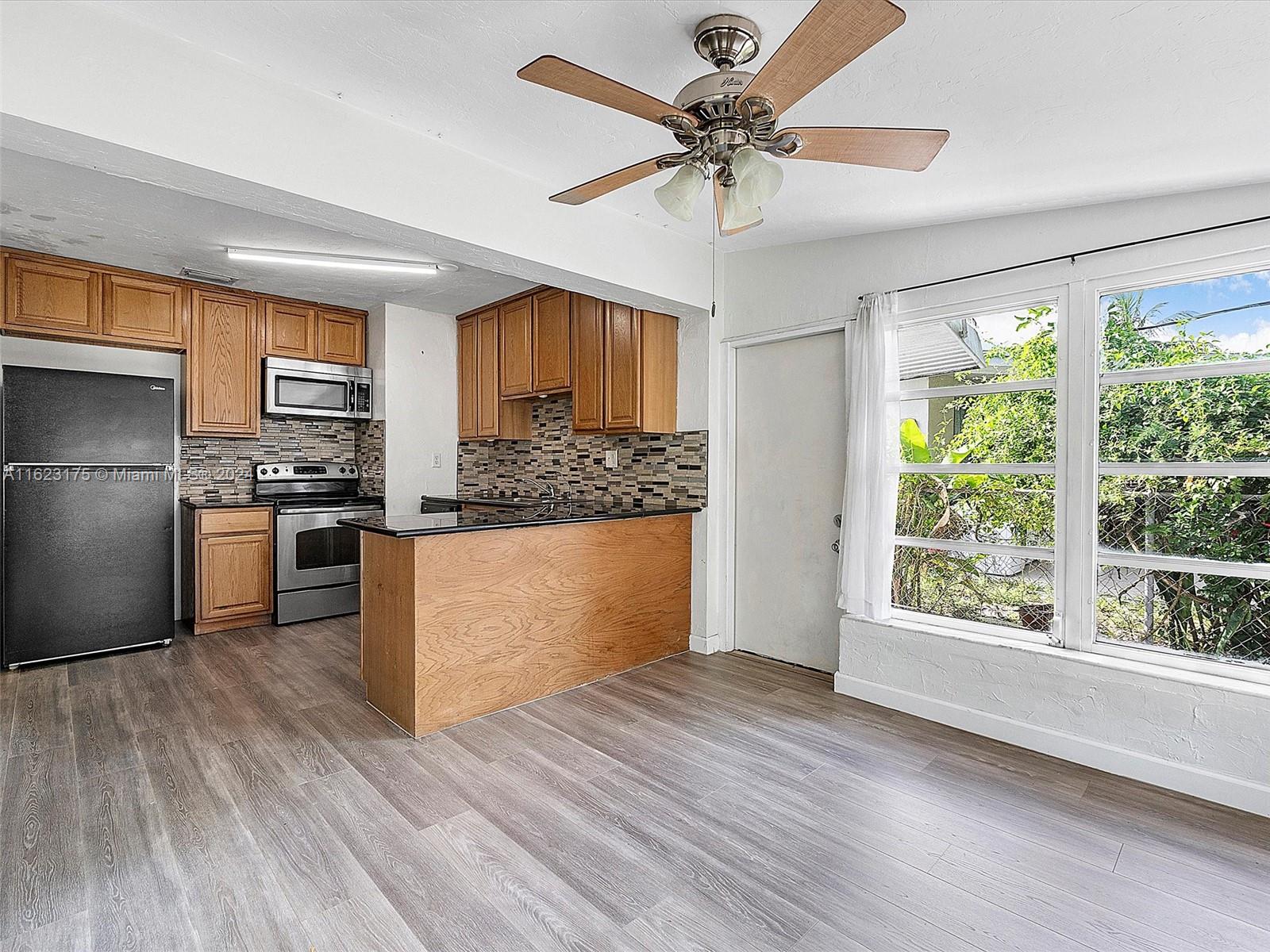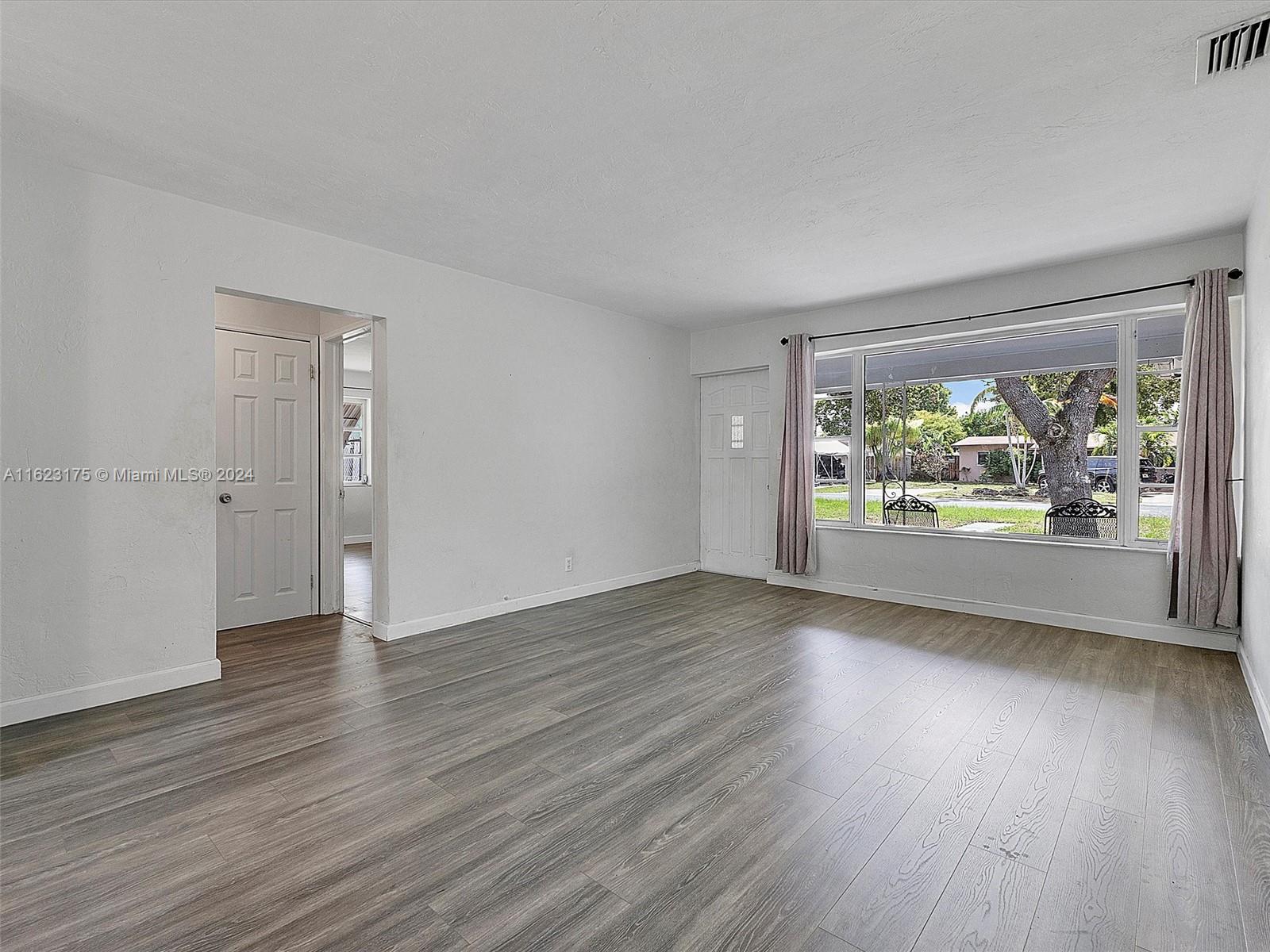 Renovated single family with 2 bedrooms and 1 bathroom and no HOA. The home features a relaxing front covered porch, wood-look laminate flooring throughout, and an updated open kitchen with a tile backsplash, stainless and black appliances, and an open floor plan with large living and dining areas. Convenient Florida Room bright and inviting. Spacious bedrooms and an updated bathroom add to the home's appeal. Additionally, there is a 1-car garage, and large driveway. The oversized fully fenced backyard provides ample space to add a pool. ROOF 2019, A/C 2020, Water Heater 2020. Convenient location with easy access to all beaches, restaurants, parks, shopping, tri-rail, Brightline Express train, Turnpike, and I-95!