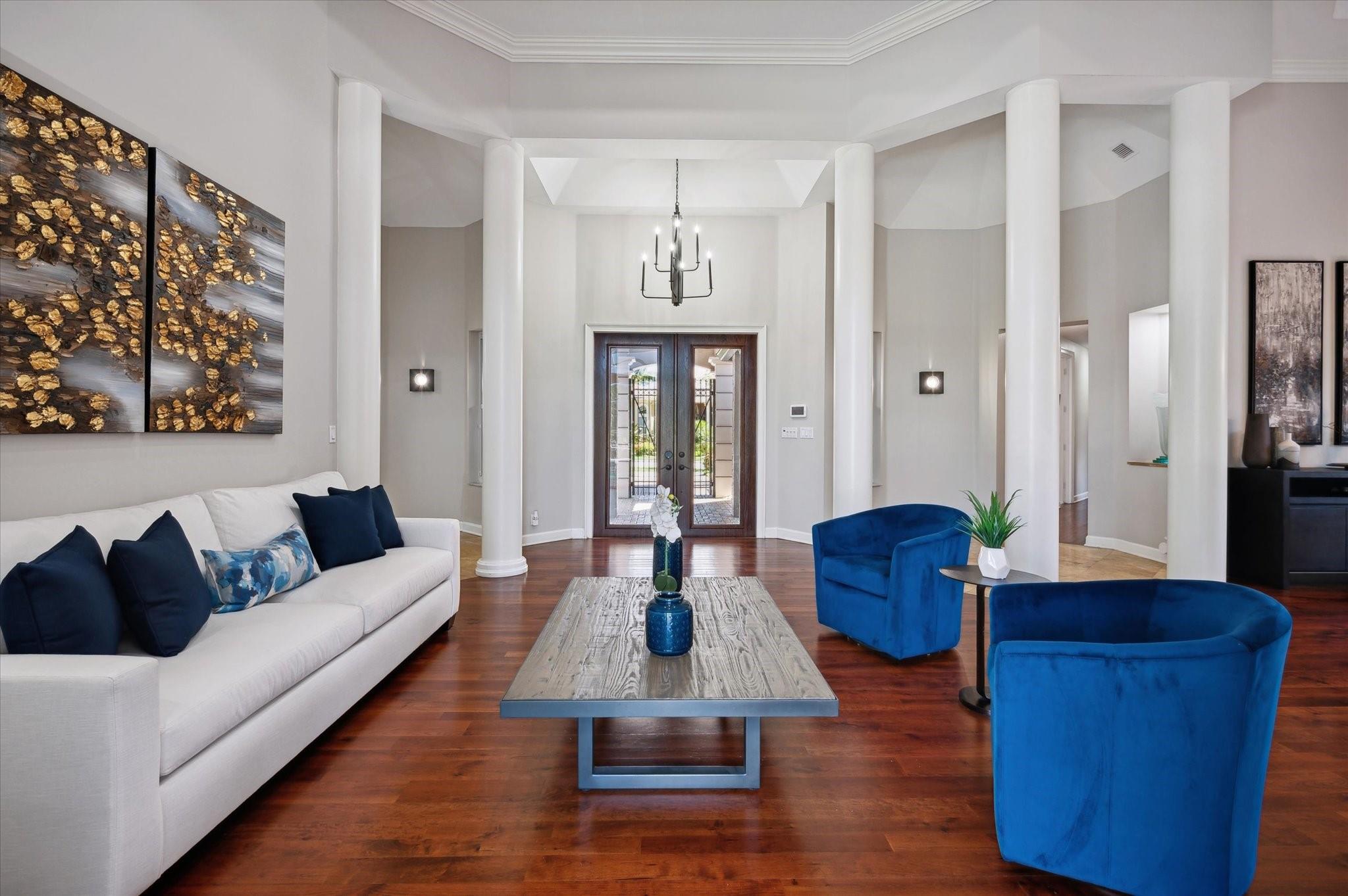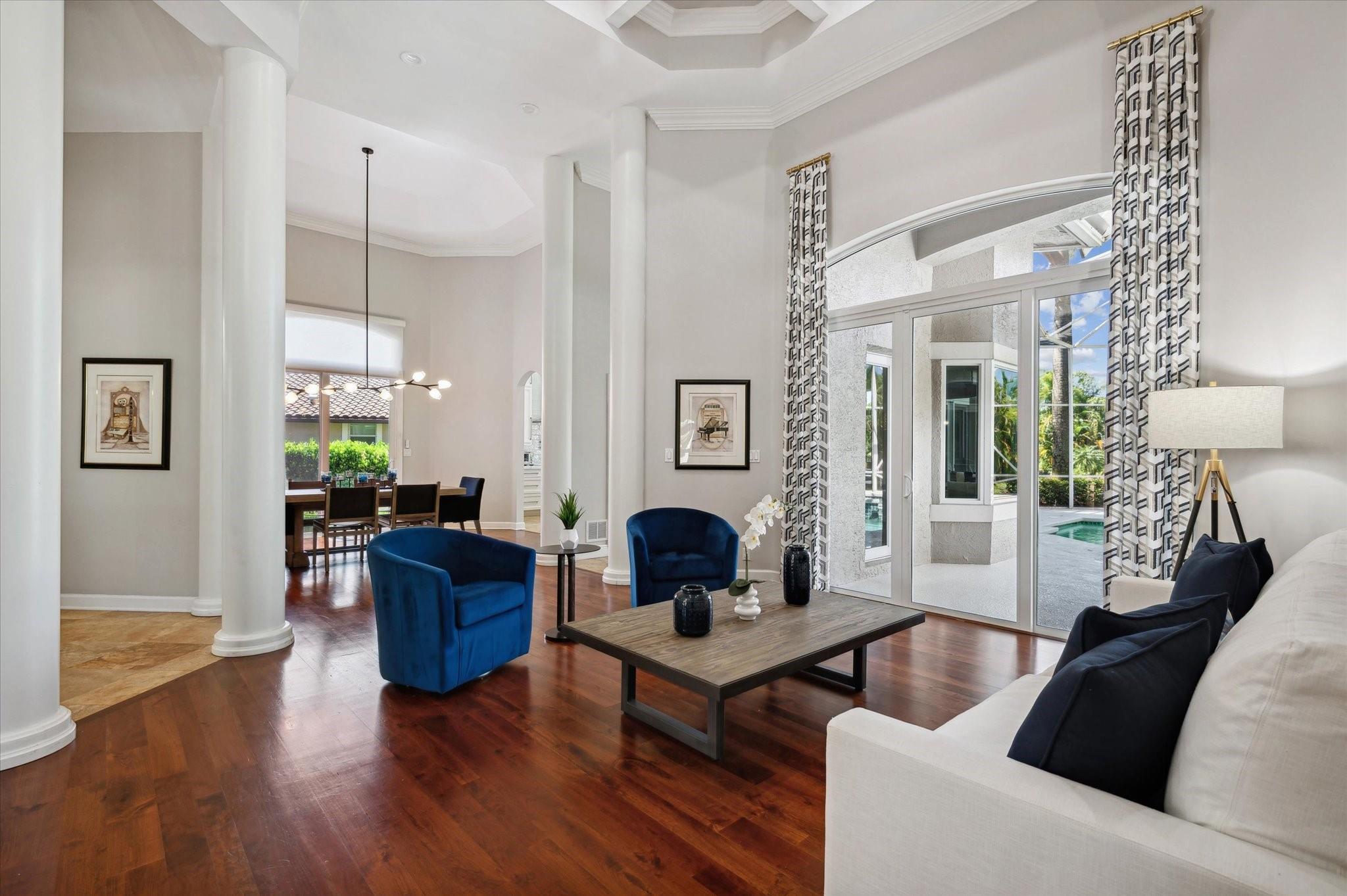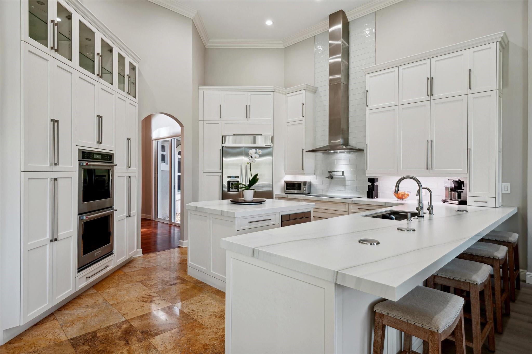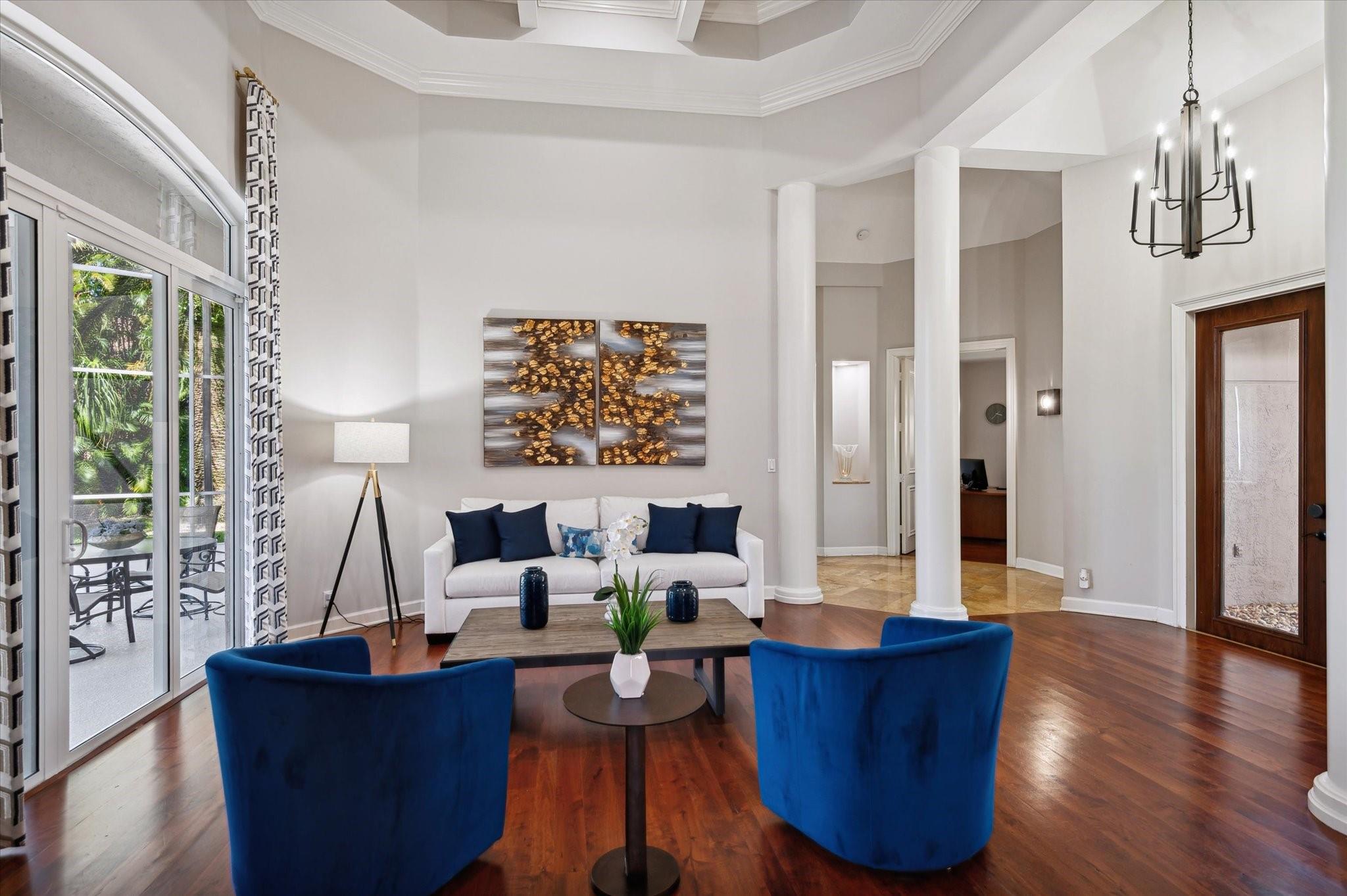 Nestled in the prestigious Falls of Heron Bay, this custom-built home boasts a prime location with nearly half an acre of luxurious living with breathtaking water and island views. The 2020 roof and hurricane impact windows and doors ensure peace of mind. Inside, a new gourmet kitchen dazzles with 10-foot custom wood cabinetry, Sapienstone porcelain countertops, double oven, and induction cooktop. The Primary Suite features coffered ceilings, serene water views, and a newly remodeled bathroom with a soaking tub, quartzite counters, glass-enclosed shower, and water closet. Outdoors, enjoy the screened-in custom pool and spa. The community features two clubhouses with resort style pools, tennis, basketball courts and more! This is a must see home it will go fast!