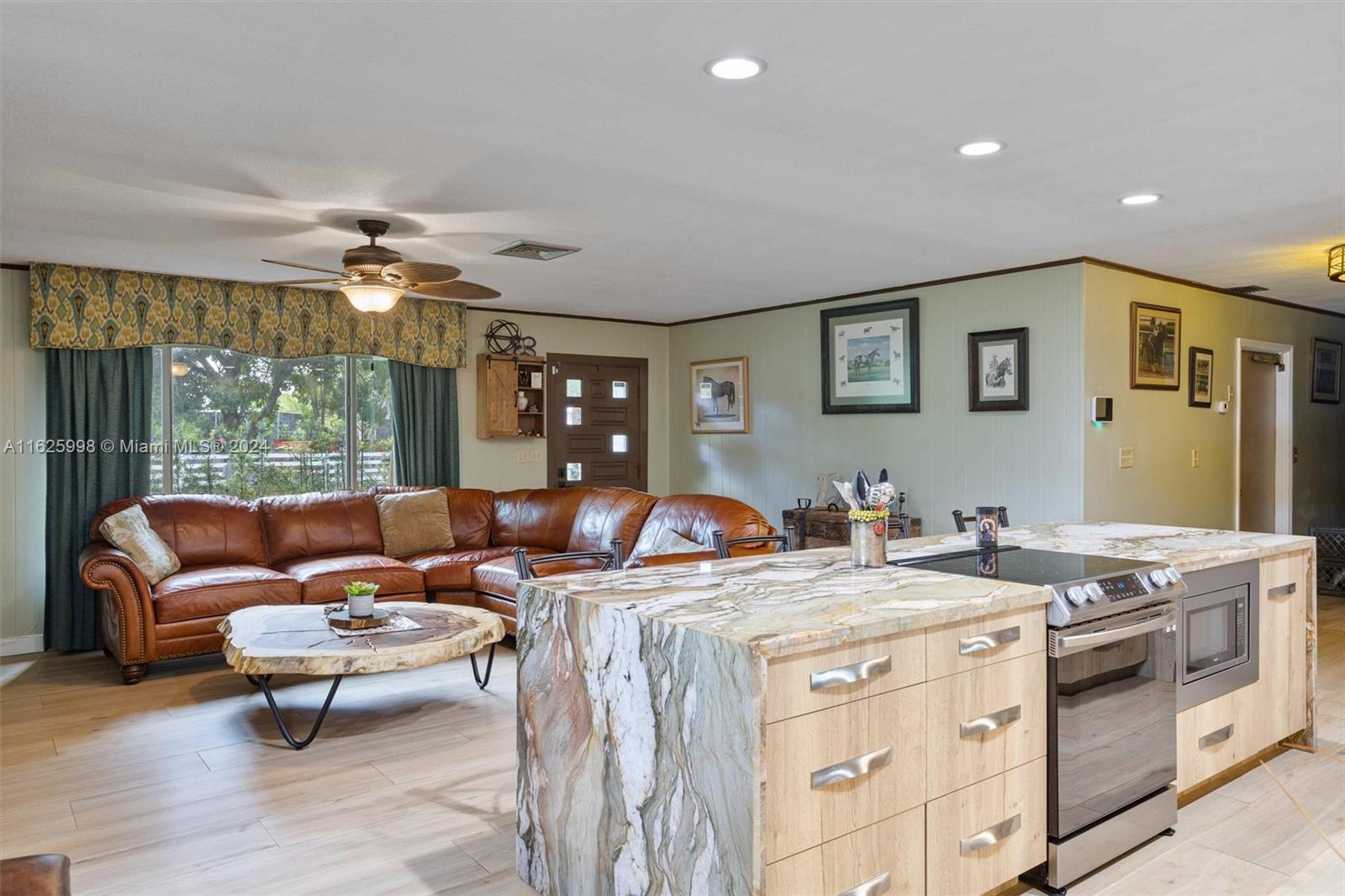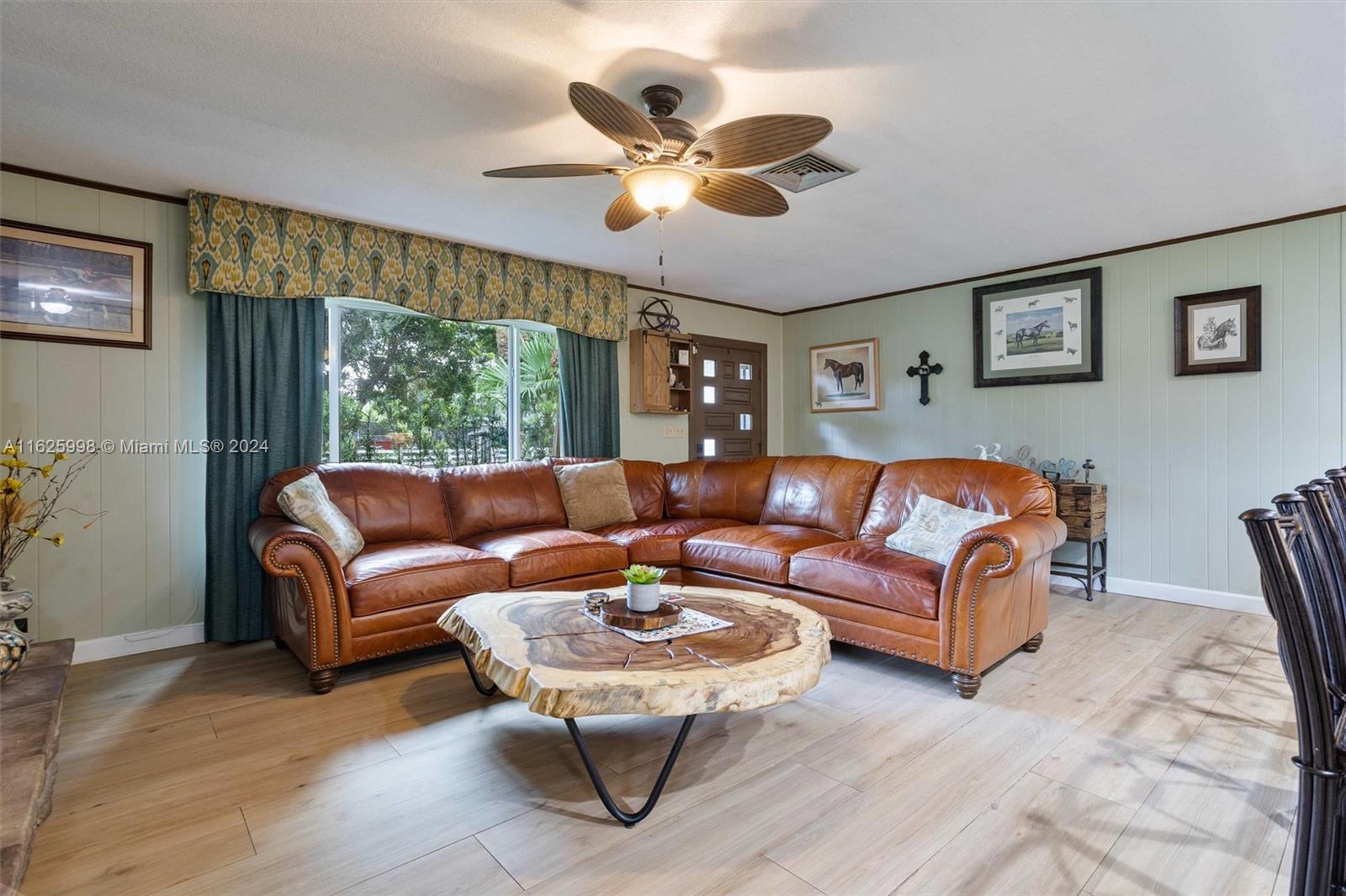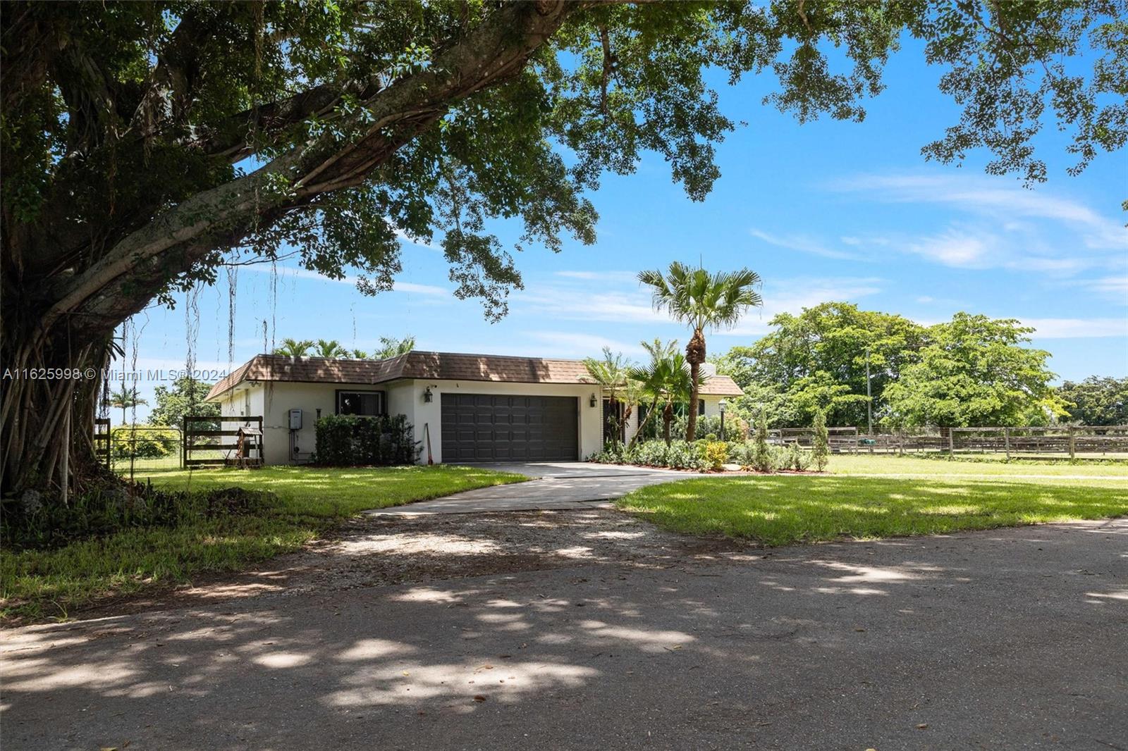 2.51 acre lot in desirable Southwest Ranches! This 3 bedroom 3 bath home boasts an newly updated island kitchen with ample storage & an office. Impact windows & accordion shutters throughout provide natural light & security. A stunning electric fireplace greets you in the living room. The primary bedroom is oversized & the French doors open to the pool. Secondary bedrooms are large with ample storage. Includes a 4 stall barn with a tack room, built to withstand up to a Cat 3 Hurricane. Also a 1 stall barn with a feed room & paddock. 3 more paddocks give you lots of room to ride & turn out your horses. This high & dry lot is located near "A" rated schools, shops & restaurants. Whole house generator and new roof in 2022. Wake up to your horse in your back yard! Paradise awaits!