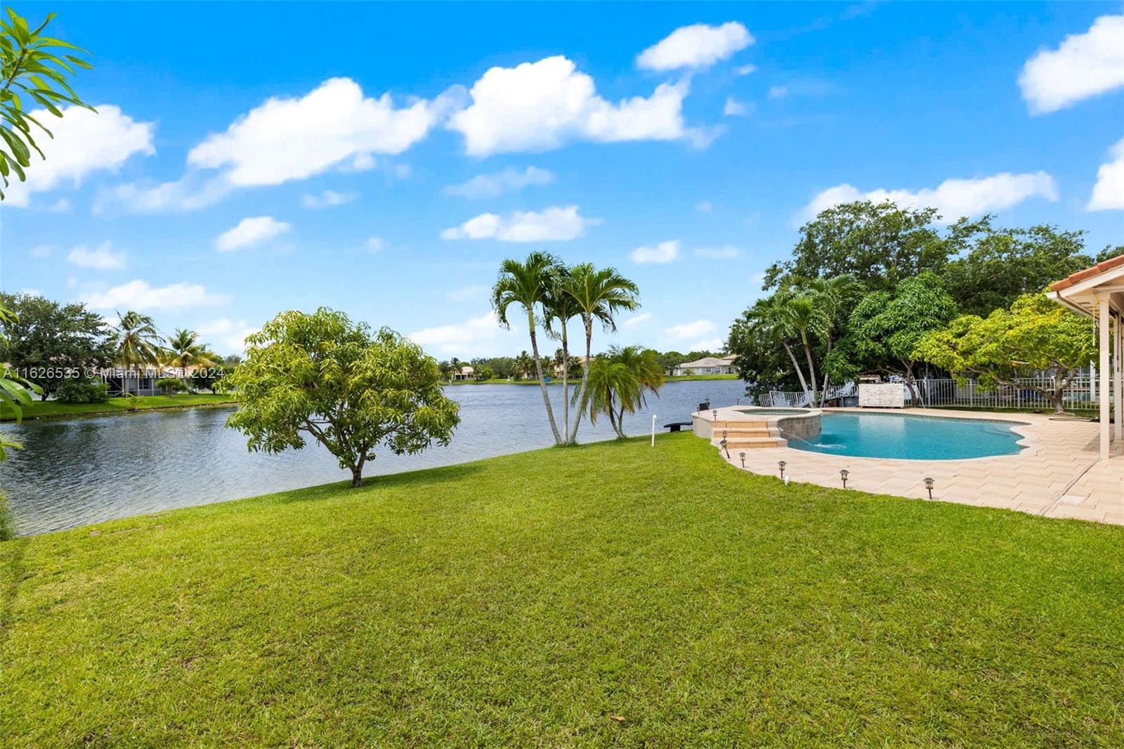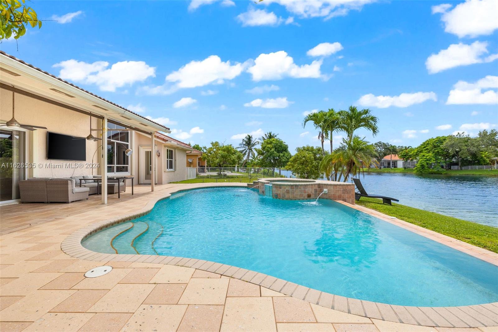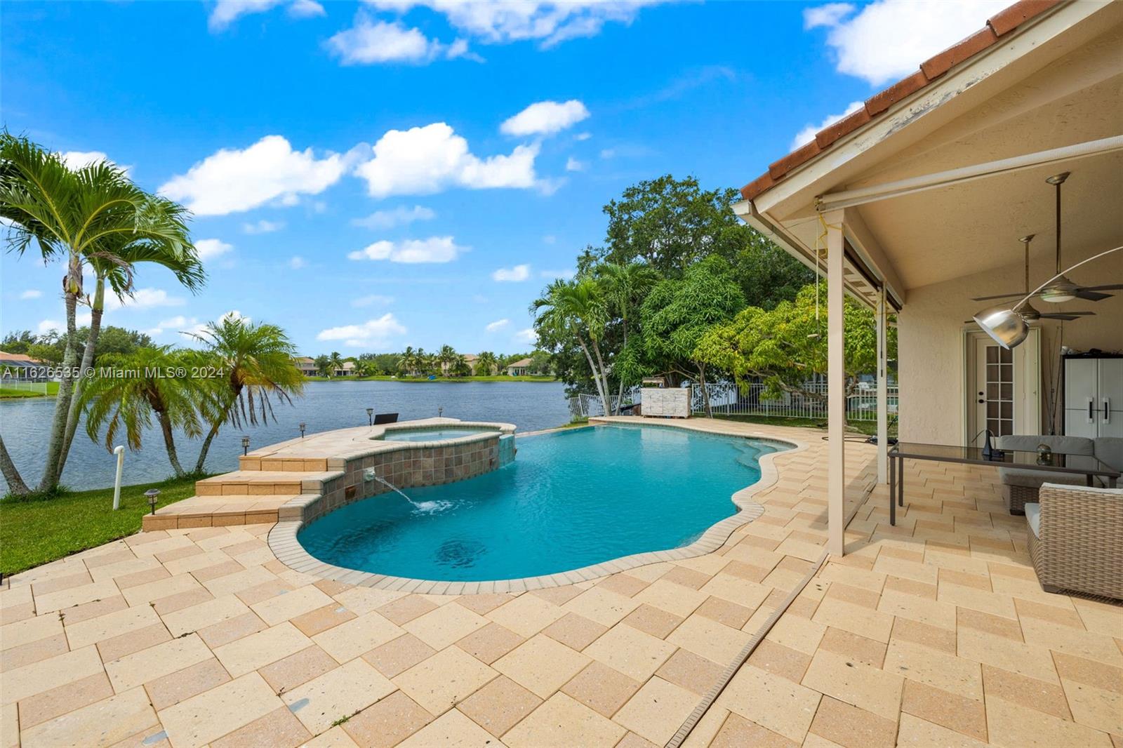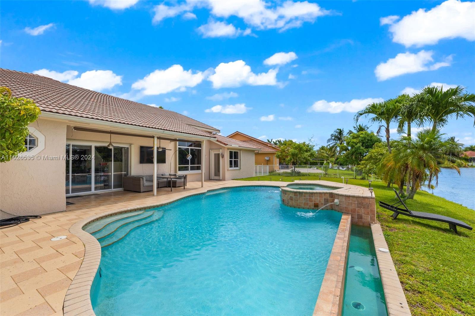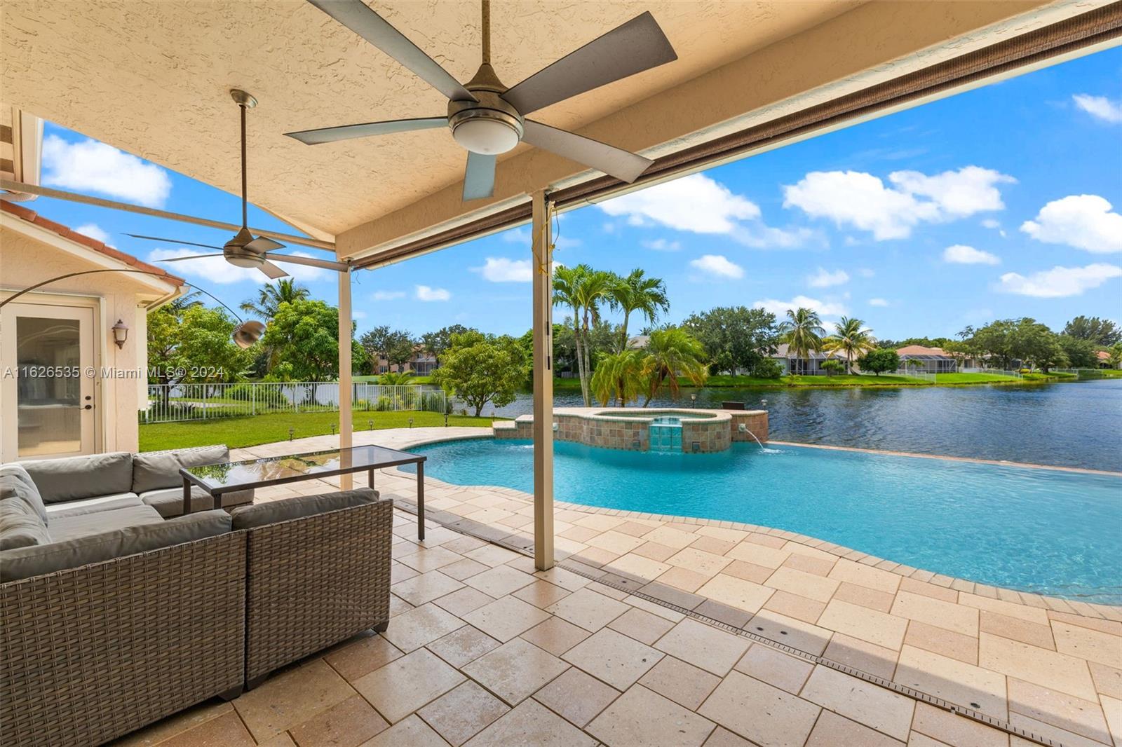 LAKEFRONT WIDE VIEWS WITH ENDLESS INFINITY EDGE SALT WATER HEATED POOL & SPA In Sought After PEMBROKE FALLS. Oversized Master bedroom on first floor, California Closets, Executive Office, Pantry, Jetted Jacuzzi, Massage Showerheads in every bathroom, Steam room w/mood lighting, Spacious Chef's Kitchen with Quartzite countertop, Cherry Cabinetry, Toto Washlet Toilet Systems, Rod Iron Banister, Built-in Bar with backlit Onyx, 7' Crystal Chandelier. New washer, dryer, dishwasher. ACs 2021/2010. Resort Style clubhouse and amenities: Olympic size pool, gym, tennis courts, club house and much more. HOA includes internet/cable, ADT security, amenities.