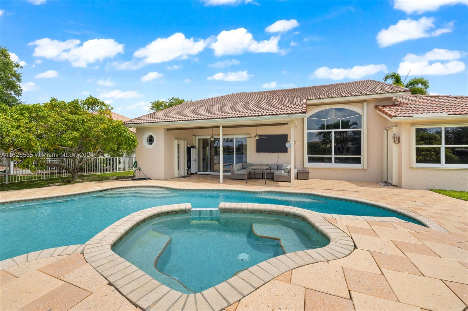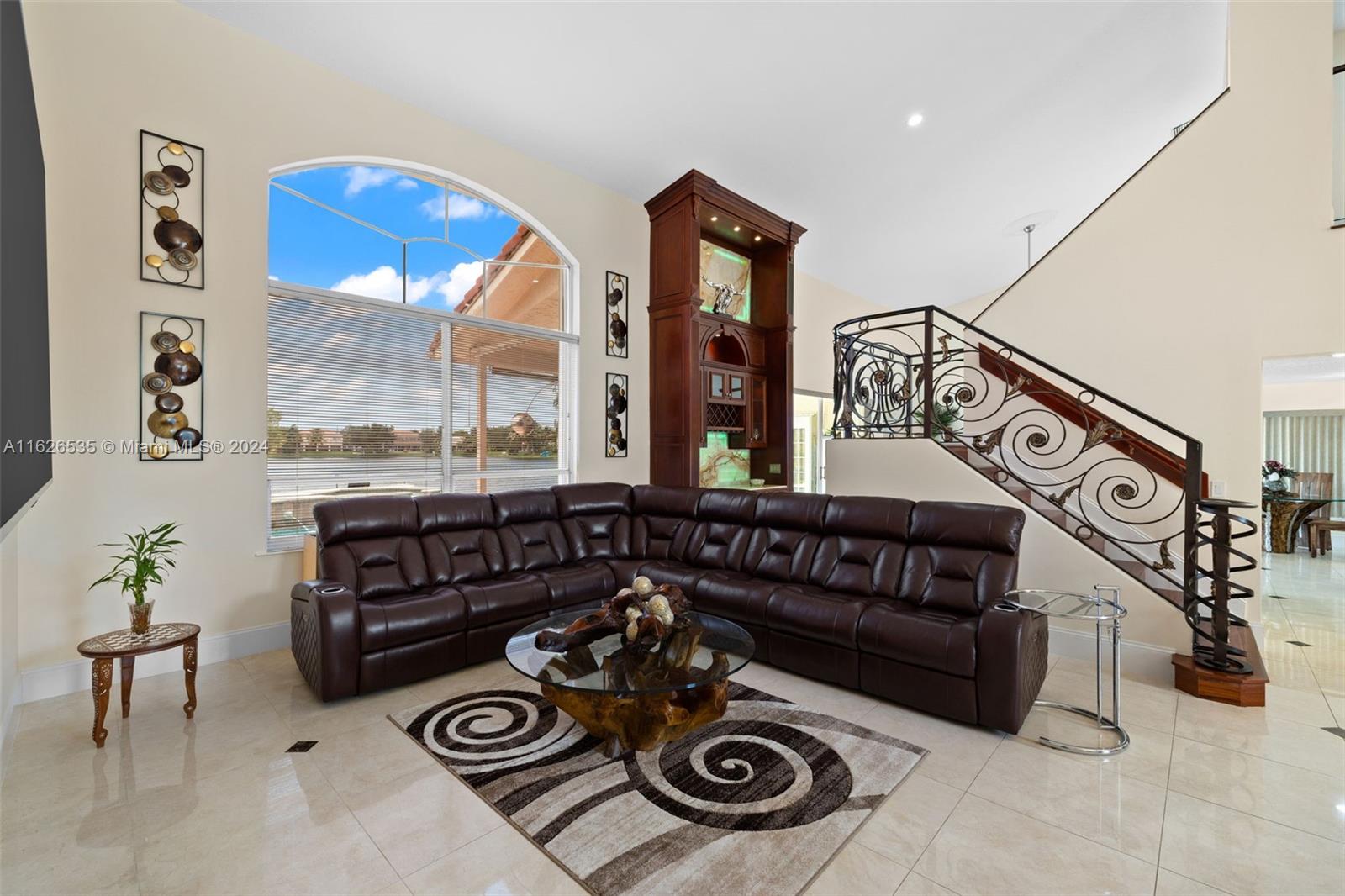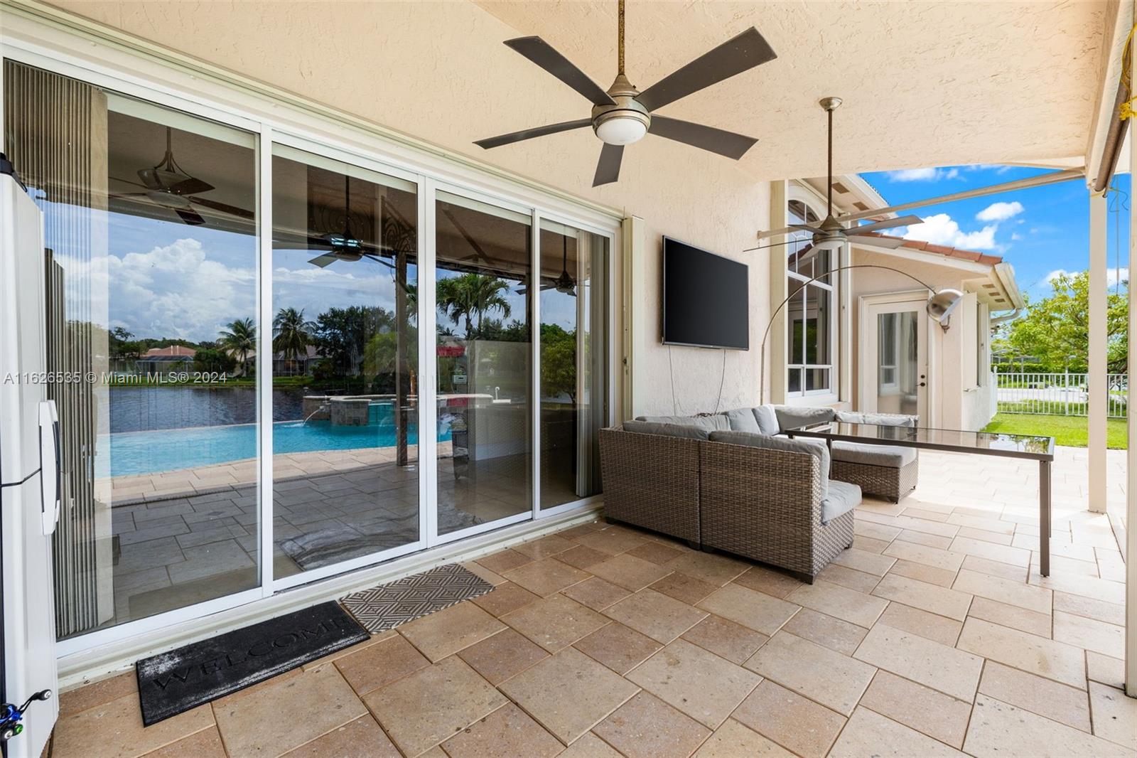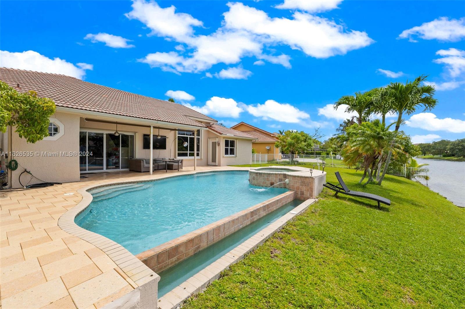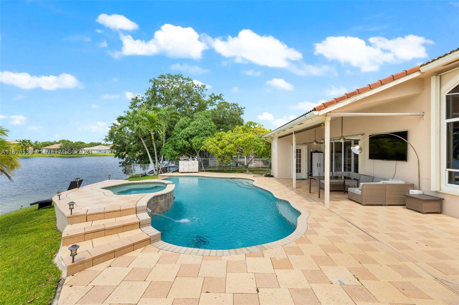 LAKEFRONT WIDE VIEWS WITH ENDLESS INFINITY EDGE SALT WATER HEATED POOL & SPA In Sought After PEMBROKE FALLS. Oversized Master bedroom on first floor, California Closets, Executive Office, Pantry, Jetted Jacuzzi, Massage Showerheads in every bathroom, Steam room w/mood lighting, Spacious Chef's Kitchen with Quartzite countertop, Cherry Cabinetry, Toto Washlet Toilet Systems, Rod Iron Banister, Built-in Bar with backlit Onyx, 7' Crystal Chandelier. New washer, dryer, dishwasher. ACs 2021/2010. Resort Style clubhouse and amenities: Olympic size pool, gym, tennis courts, club house and much more. HOA includes internet/cable, ADT security, amenities.