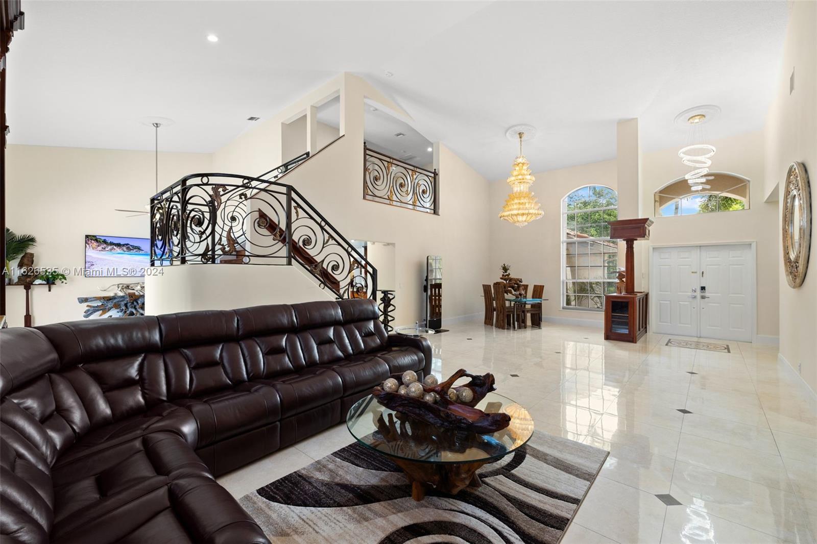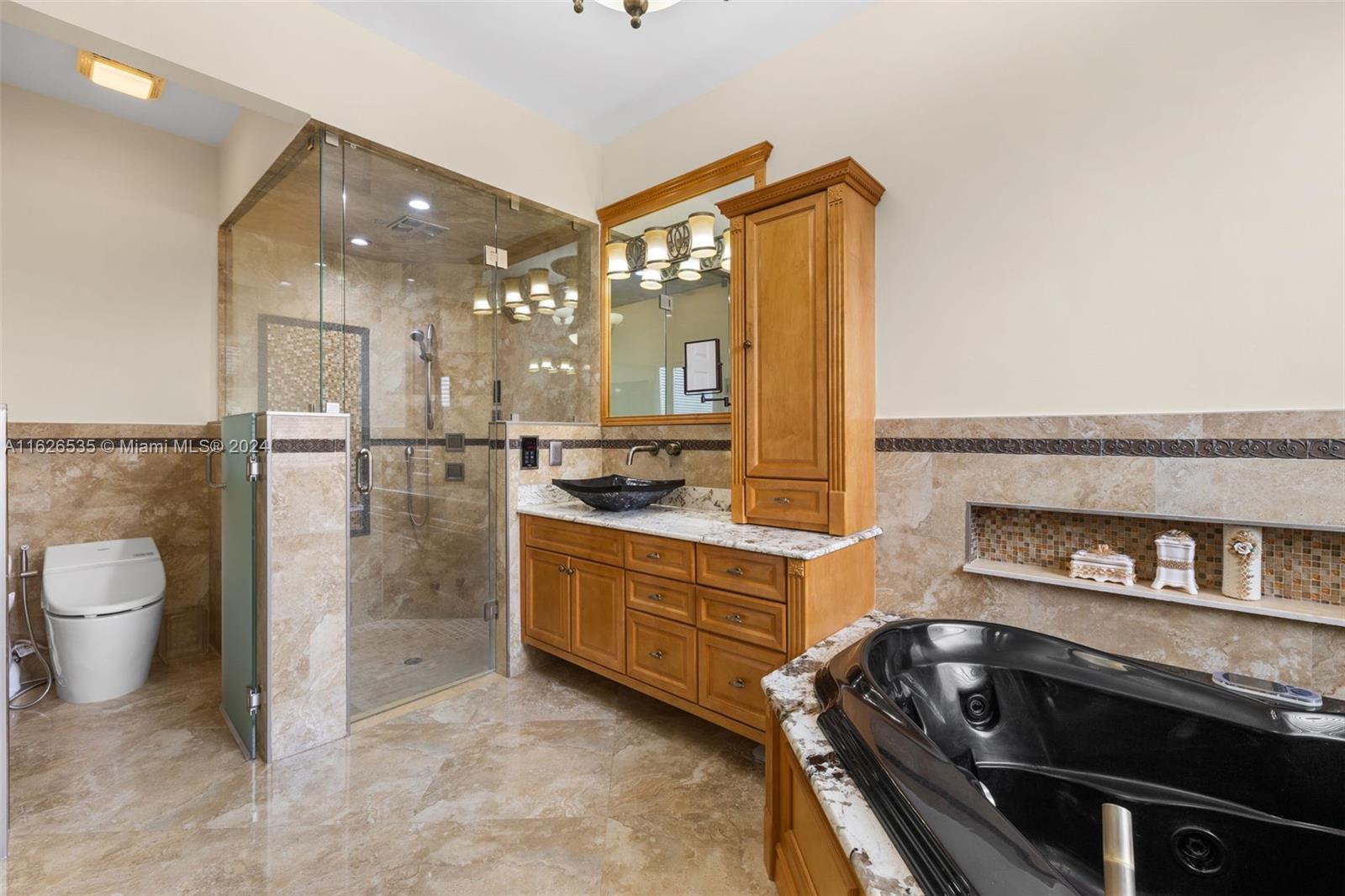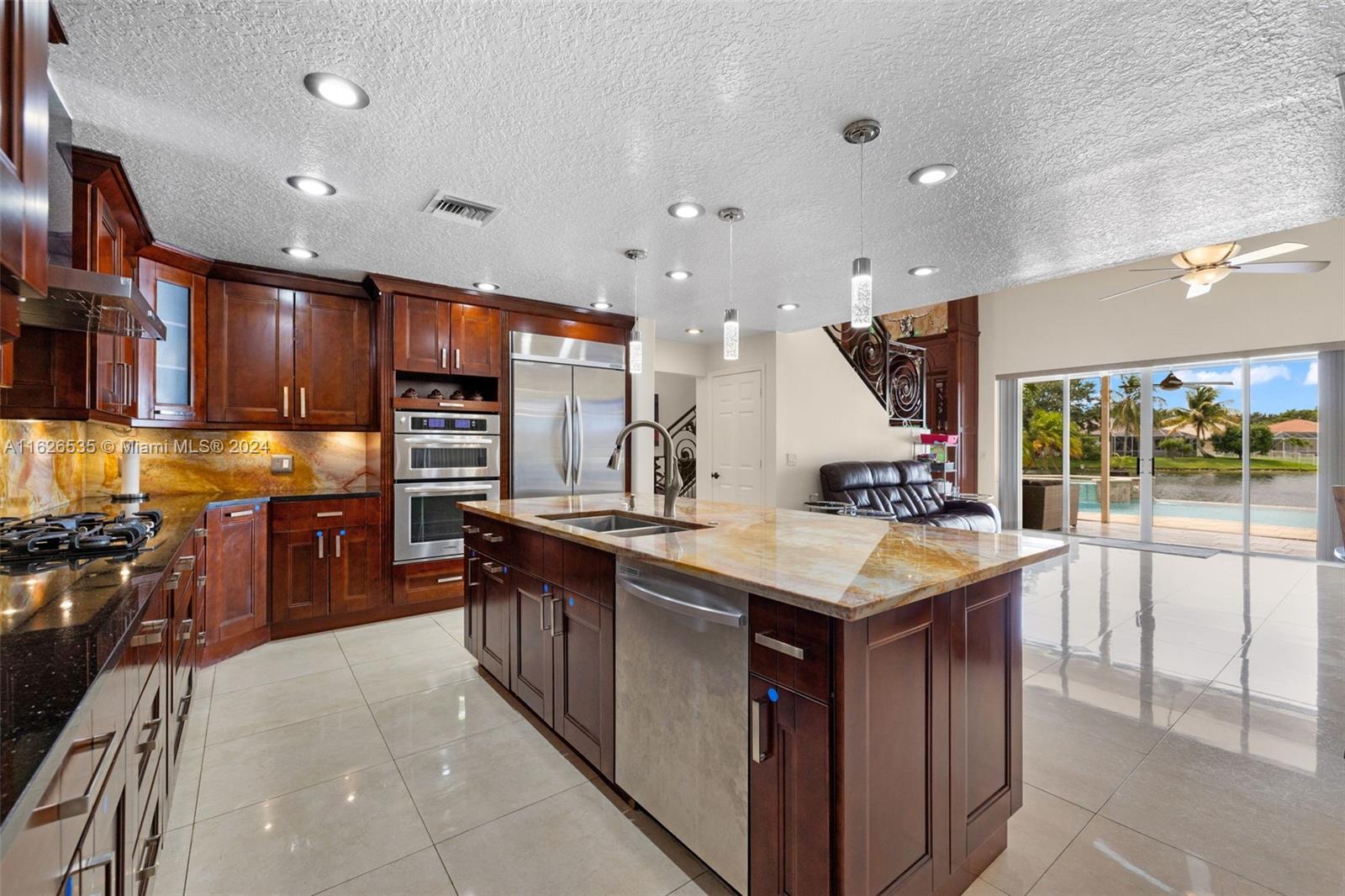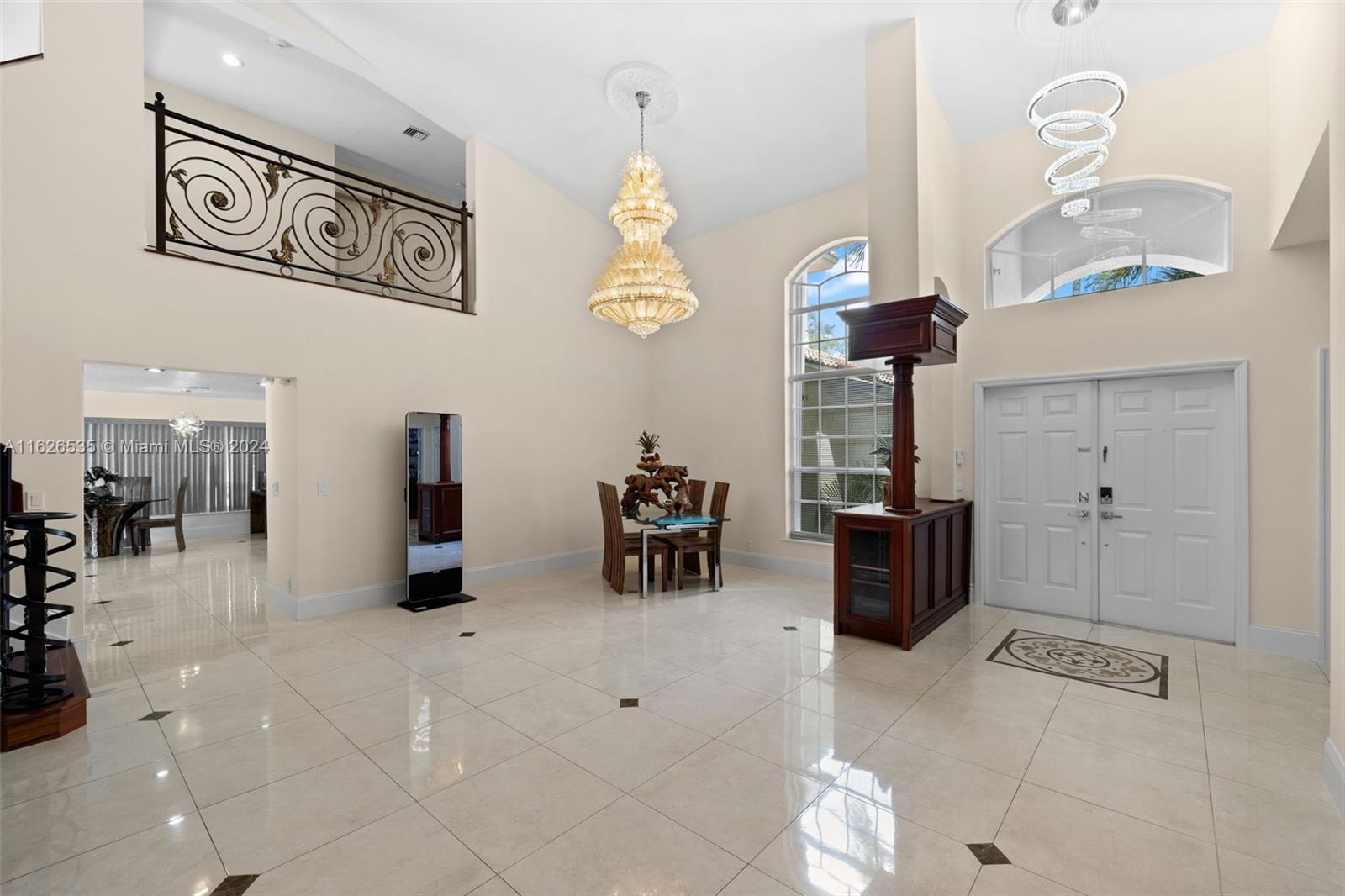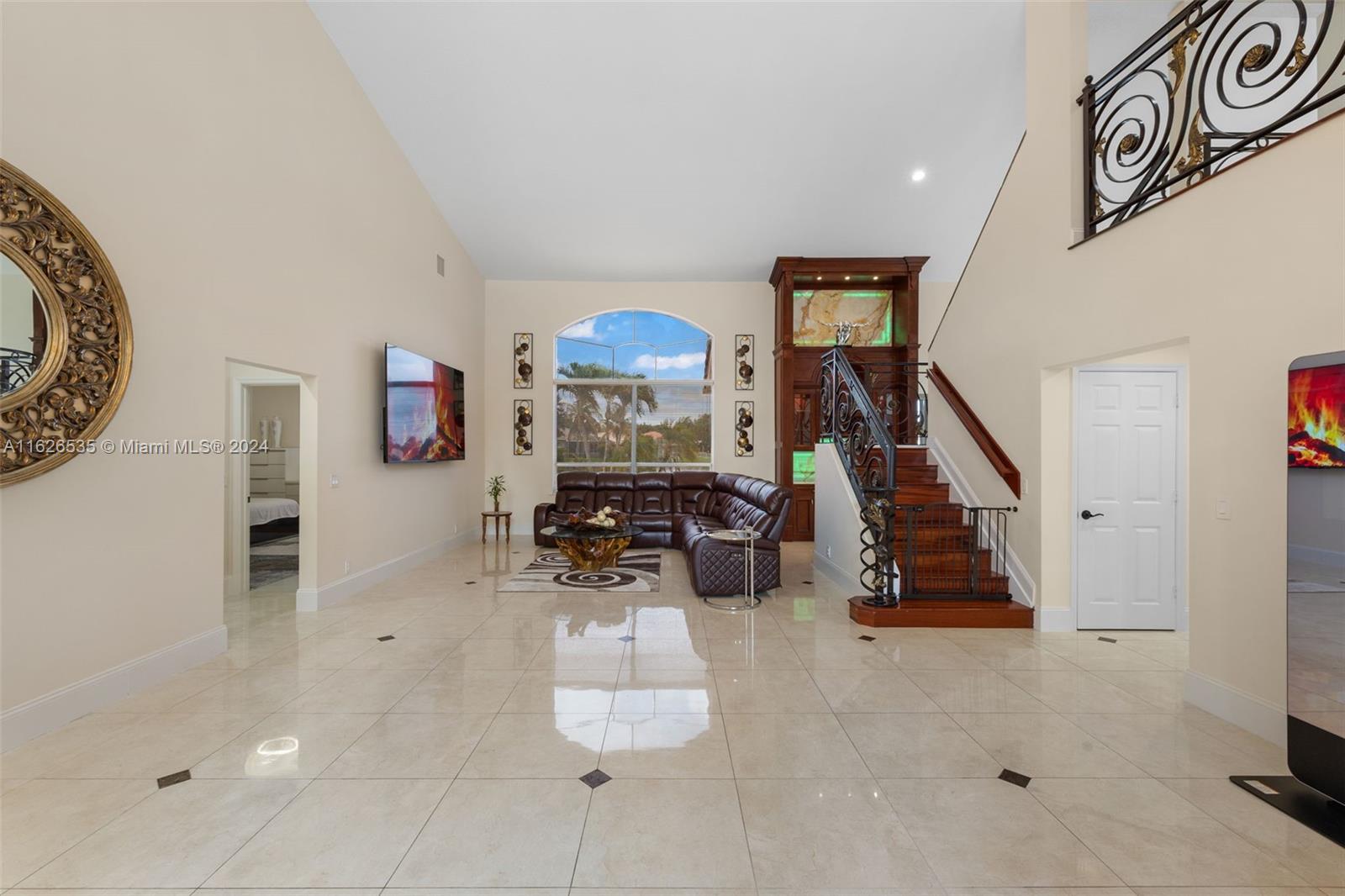 LAKEFRONT WIDE VIEWS WITH ENDLESS INFINITY EDGE SALT WATER HEATED POOL & SPA In Sought After PEMBROKE FALLS. Oversized Master bedroom on first floor, California Closets, Executive Office, Pantry, Jetted Jacuzzi, Massage Showerheads in every bathroom, Steam room w/mood lighting, Spacious Chef's Kitchen with Quartzite countertop, Cherry Cabinetry, Toto Washlet Toilet Systems, Rod Iron Banister, Built-in Bar with backlit Onyx, 7' Crystal Chandelier. New washer, dryer, dishwasher. ACs 2021/2010. Resort Style clubhouse and amenities: Olympic size pool, gym, tennis courts, club house and much more. HOA includes internet/cable, ADT security, amenities.