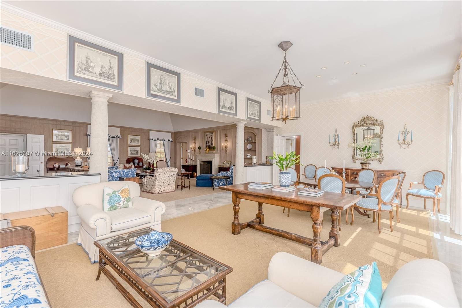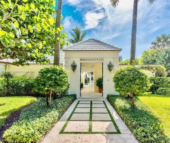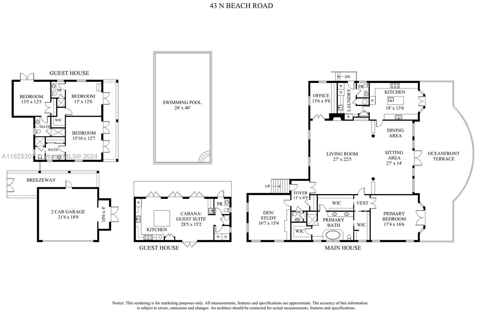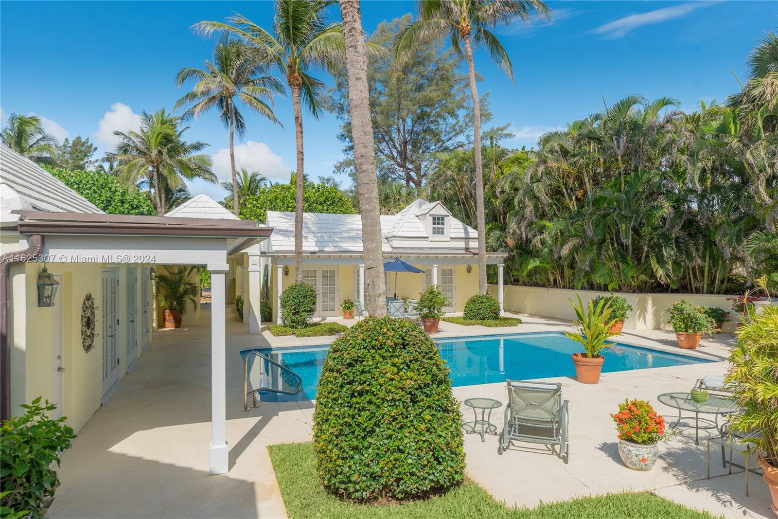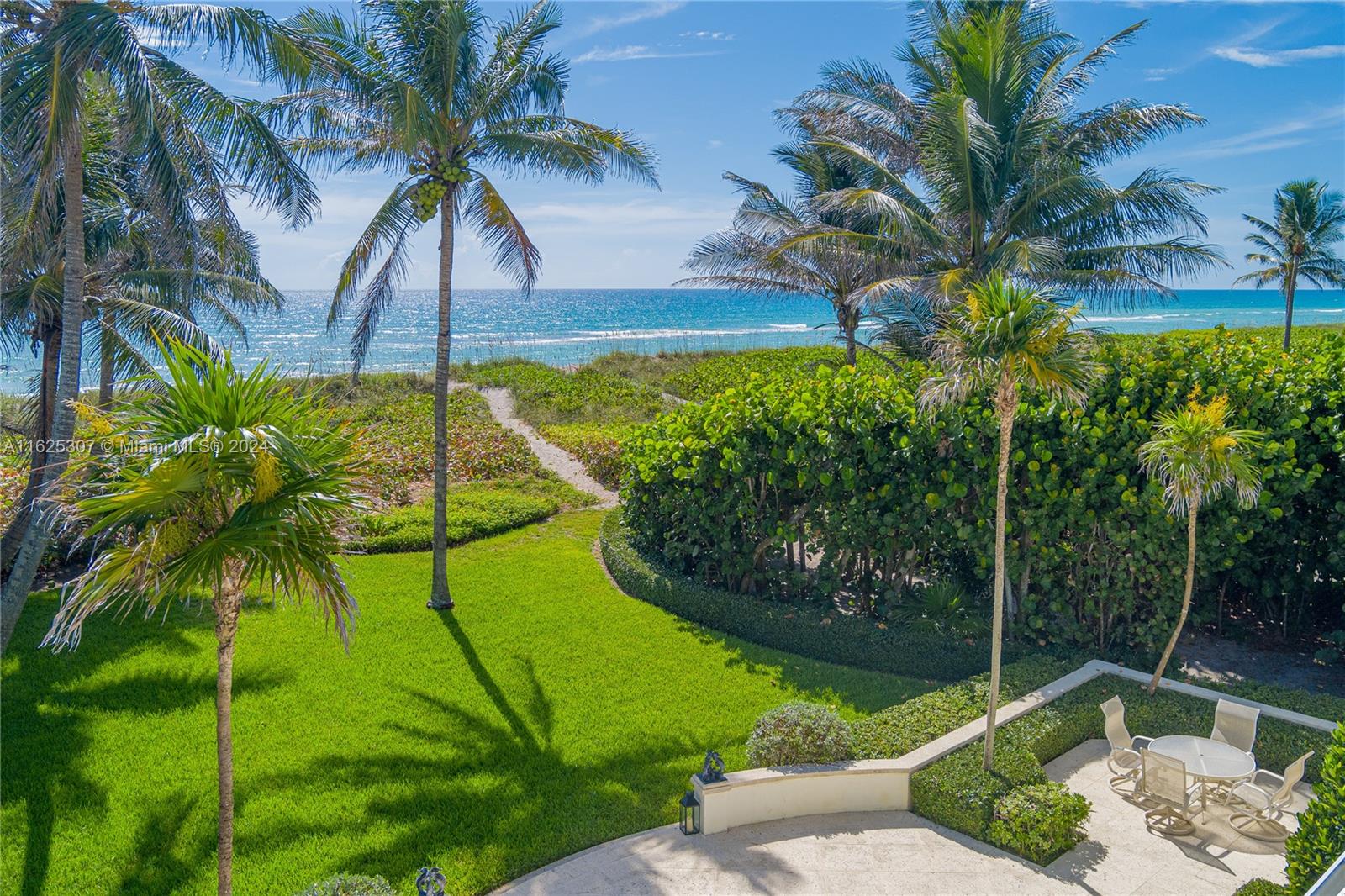 This impressive estate is located on North Beach Road on Jupiter Island, right on the ocean, with private beach access. The property is a beautiful Bermudian-style courtyard home with four separate buildings surrounding a tranquil pool and courtyard, offering a luxurious lifestyle. The main house boasts a grand primary suite with three walk-in closets, a spacious primary bathroom, a large living and dining room, a kitchen with a butler's pantry, a laundry room, a library, and an office. The guest house features three large bedrooms, three bathrooms, and ample closet space. The cabana includes a spacious open living room and kitchen, a laundry room, and a half bathroom.