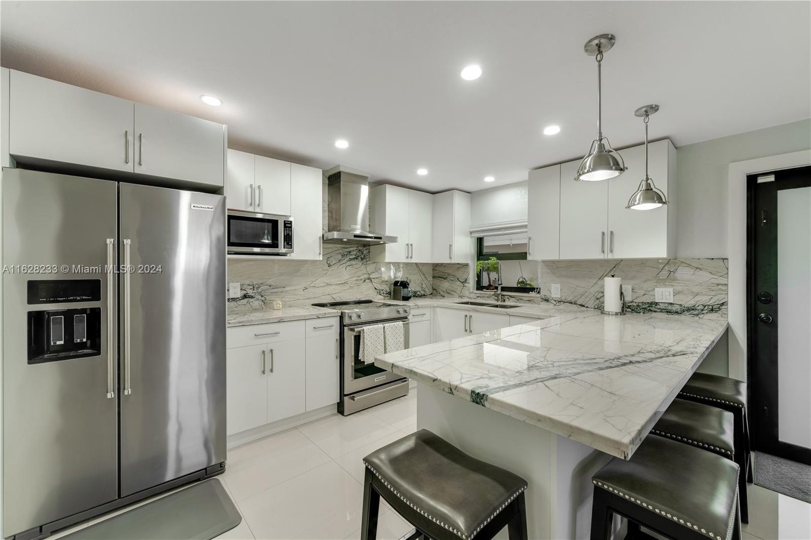 Stunning 4-bedroom, 2-bathroom home featuring a remarkable remodeled kitchen w/quartz countertops, backsplashes, and large peninsula. The spotless floors and freshly remodeled bathrooms add a touch of modern elegance. Split-level bedrooms provide privacy, w/bathrooms conveniently located on each side of the home. Enjoy cooking with KitchenAid appliances and wood cabinets, and appreciate the natural light streaming through impact doors and windows. The outdoor area is perfect for entertaining, with a covered patio that includes an outdoor counter, sink, and icemaker, plus a 4-person saltwater spa. Additionally included a 10x11 concrete covered permanent shed, gated side parking for boat/trailer, & a circular driveway w/ample space for 5 vehicles. Located close to highways & airports.