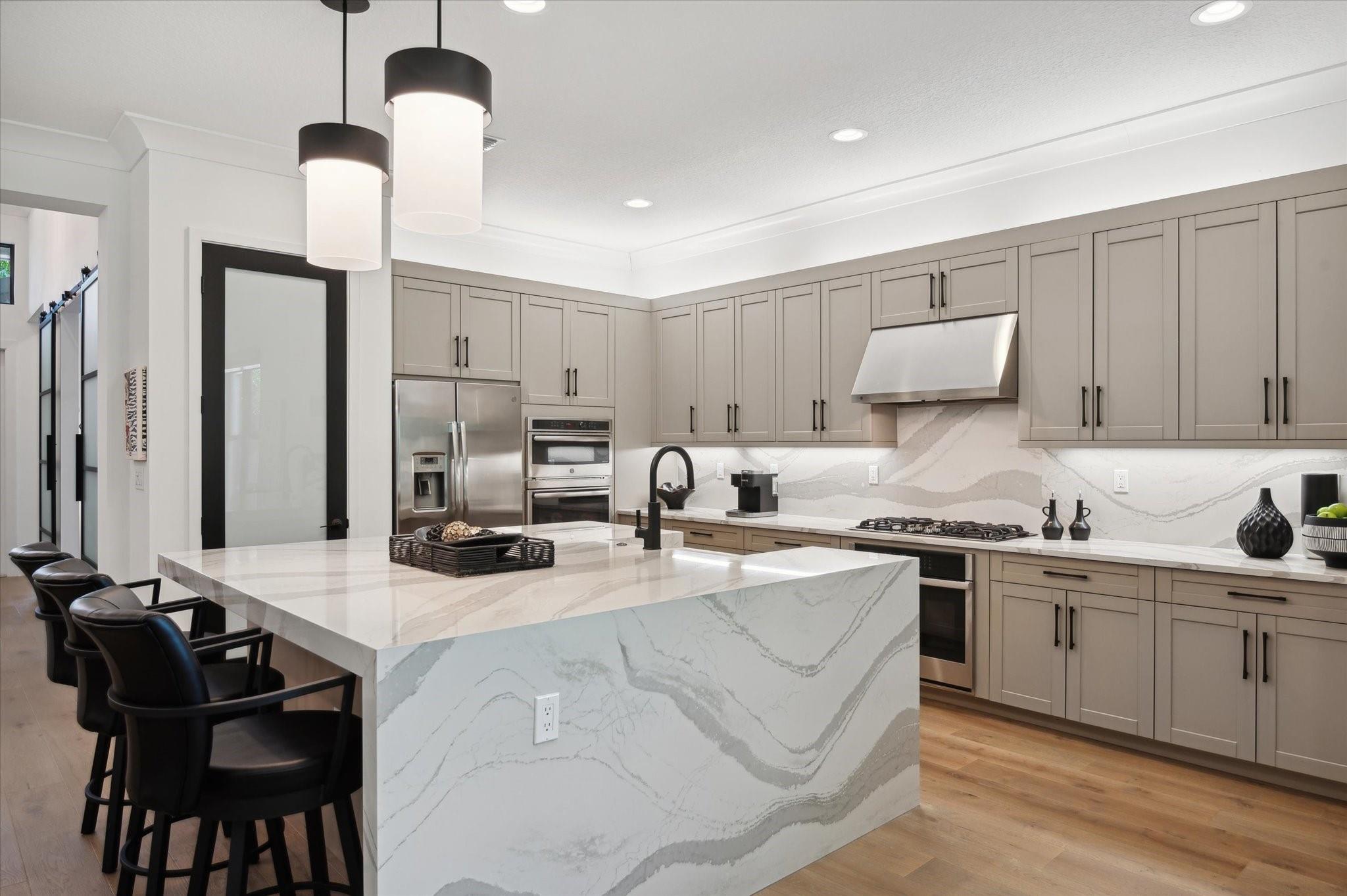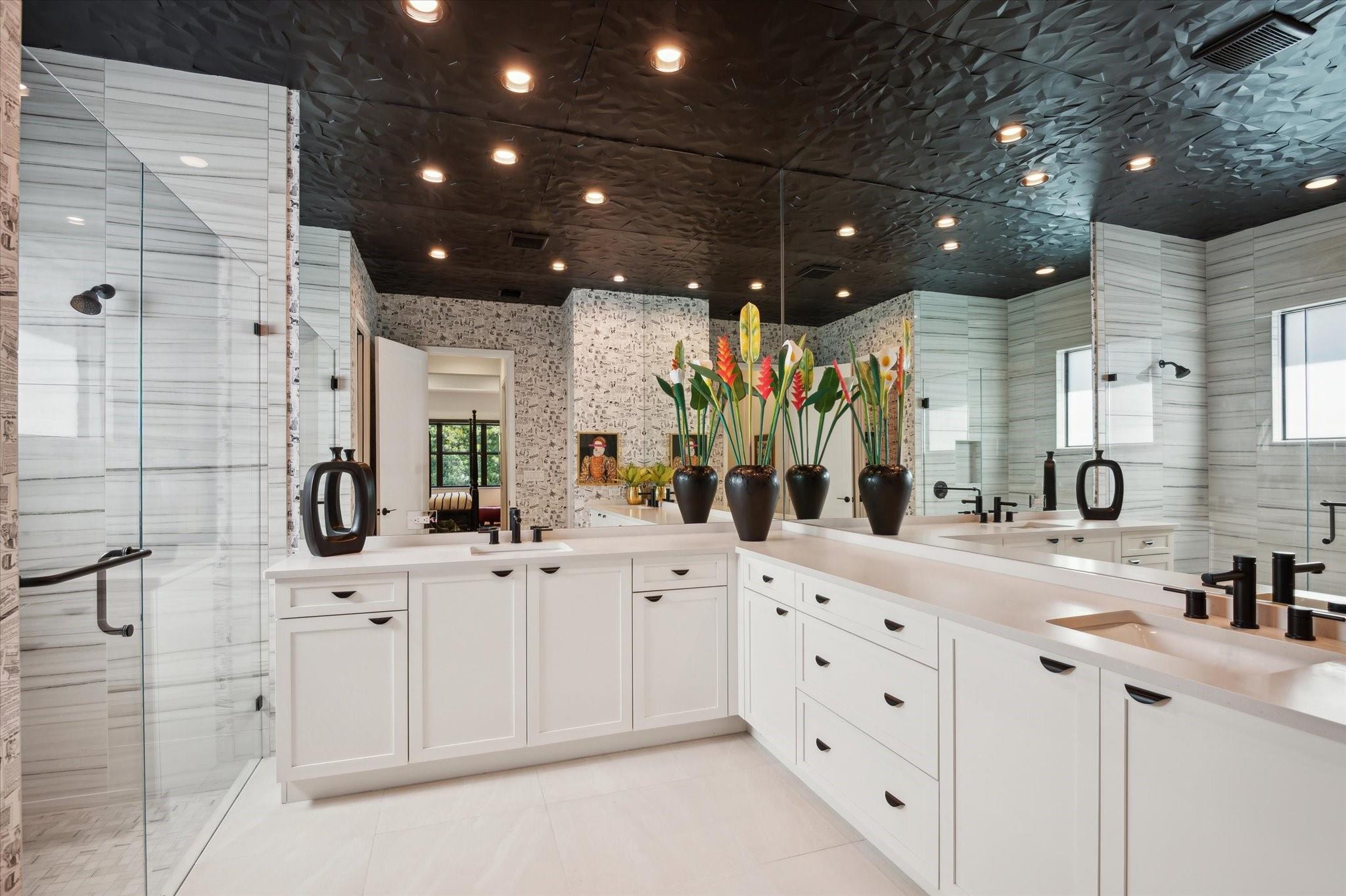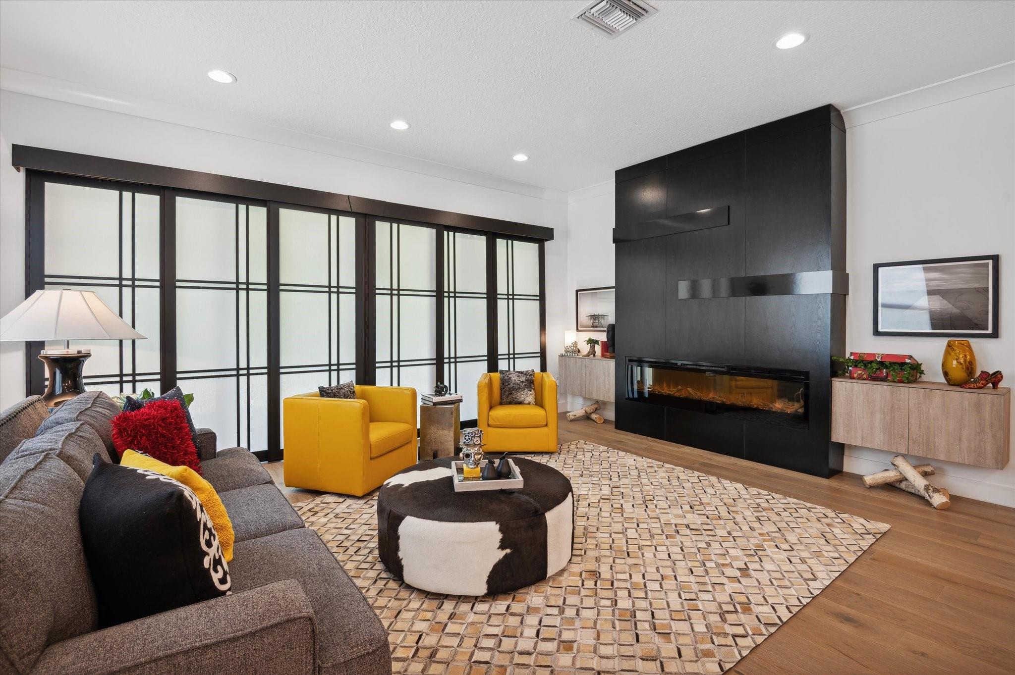 Step into luxury with this meticulously customized Maui model home, featuring three bedrooms, three bathrooms, and large enclosed den with custom sliding doors. This barely lived in home features high-end finishes such as wood floors, designer lighting, custom window treatments, Impact glass and an impressive custom electric fireplace. The gourmet open kitchen boasts barely used top-of-the-line appliances, extra thick Quartz countertops, oversized island with quartz waterfall edge & farmhouse sink. The private and spacious primary suite offers an incredible master bathroom with a seamless glass-enclosed shower, floor-to-ceiling porcelain tile, oversized vanity, and striking designer ceiling panels. Beautifully landscaped lot with private backyard, covered patio, and room for a pool.