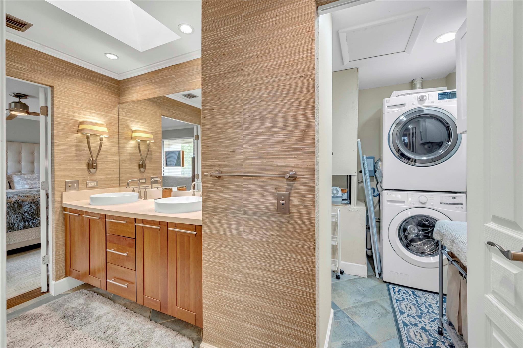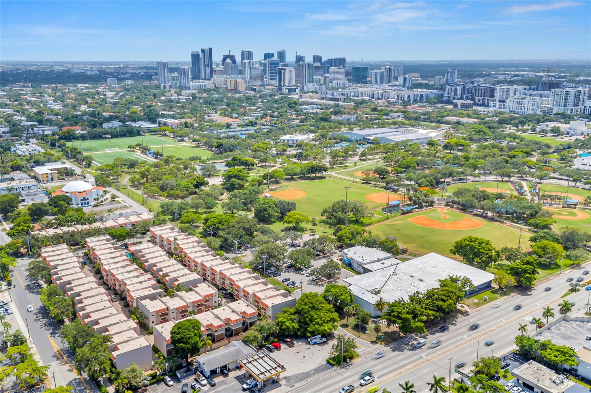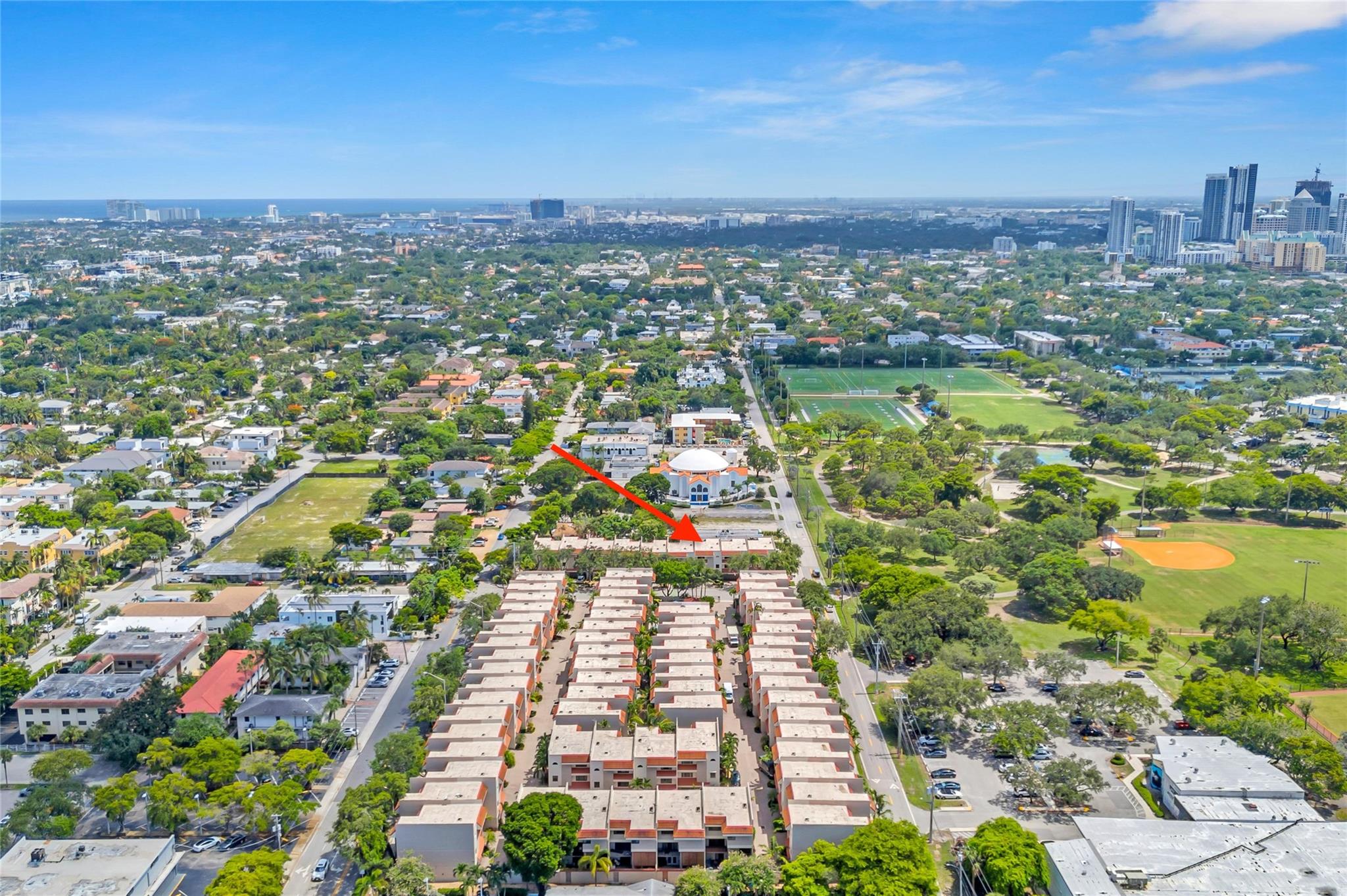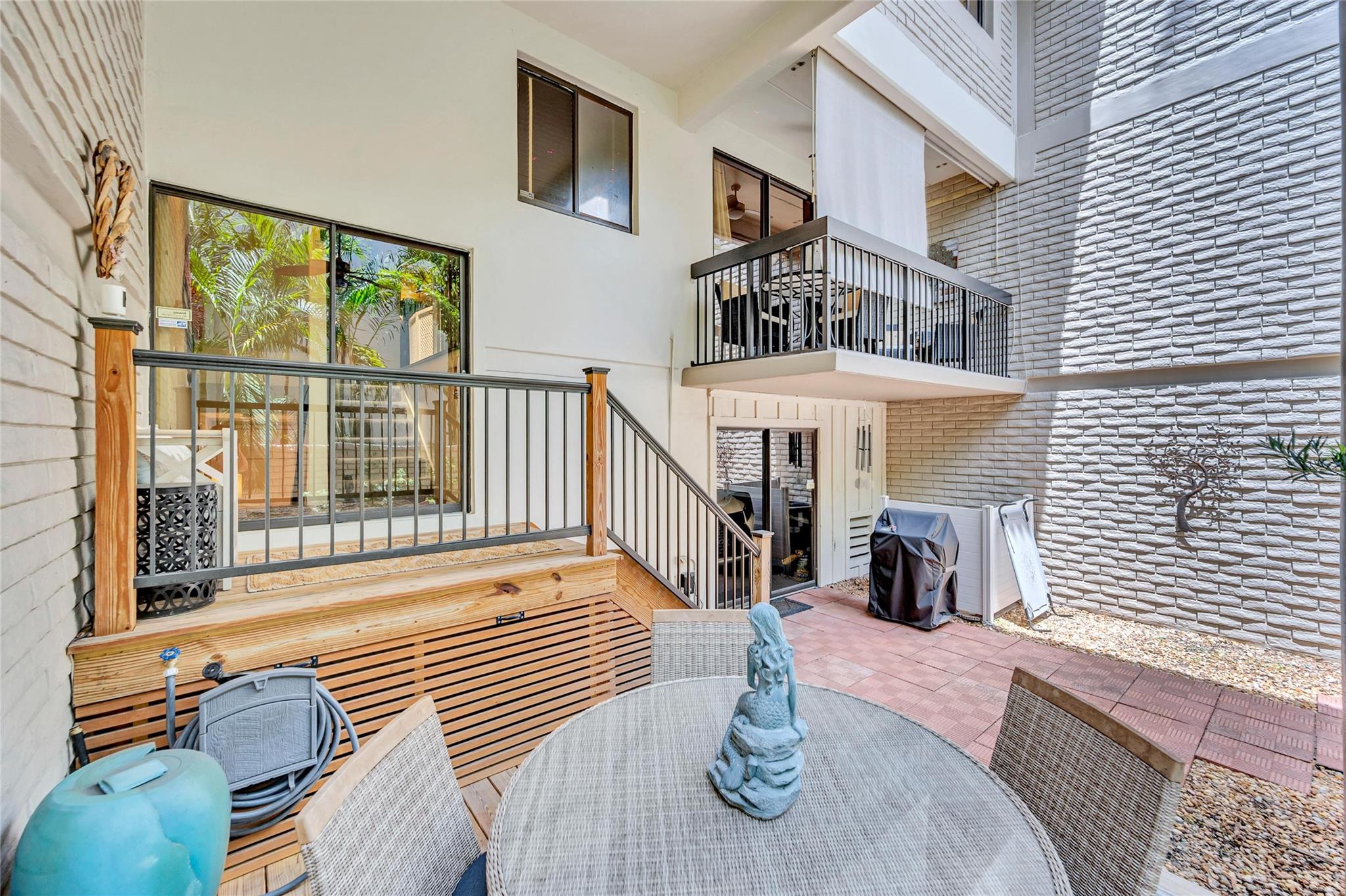This fabulous, light-filled townhouse offers three bedrooms, its own driveway, and a two-car garage. Designer finishes adorn the spacious living-dining room and modern open kitchen, with a large window, pantry, and breakfast bar. Also, a renovated powder room and an open stairwell with skylights. Wide sliders open to a balcony overlooking a newer terraced deck and private walled courtyard. The first-floor foyer provides access to the wide garage and under-stair closet. The top floor features a spacious primary suite with a large shower and closet, plus a full-size laundry. A guest room, full guest bath, and potential 3rd bedroom, currently used as a den, are also on this level. The roof is recently new, and the home is next to Holiday Park, a library, and the Panthers' Iceplex.
