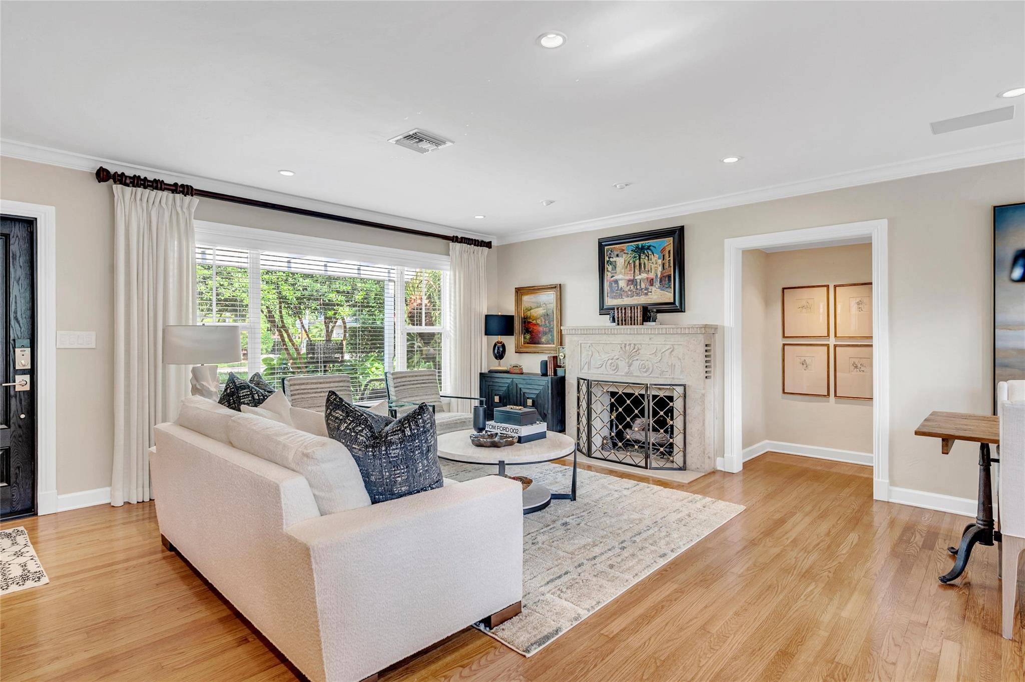 This Victoria Park home exudes refined elegance, with lush landscaping accentuating its expansive lot. A seamless blend of classic charm and modern sophistication, it features custom millwork and restored wood floors. Sunlight pours through large windows, creating a warm and inviting atmosphere. Tailored for contemporary living, the home boasts smart technology and a state-of-the-art kitchen with a gas cooktop, stainless steel appliances, granite countertops, and a separate laundry room with ample storage. The outdoor space, perfect for entertaining, includes a custom pool with Moss rock surround, a multilevel deck, custom lighting, and a summer kitchen for the most discerning guests. Several parks and excellent markets are nearby. The ocean is about a mile east.