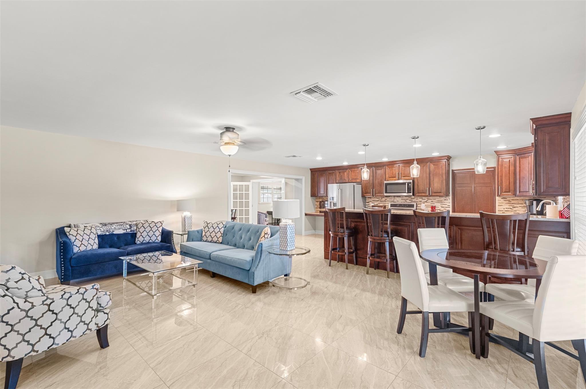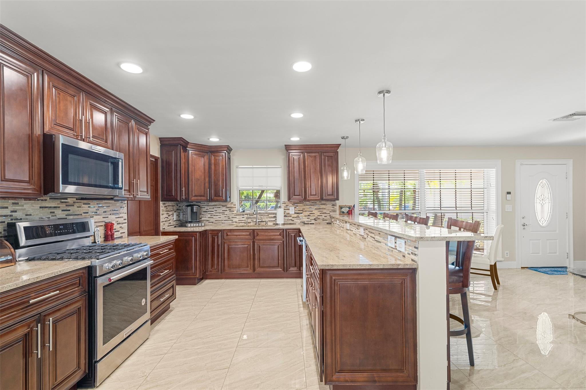 Be prepared to fall in love with this beautifully remodeled home less than 2 miles from the beach. Since 2017 this home has New Tile Floors, New Master Baths, New Guest Room Ensuite Bath with Large Walk-in Closet, New Kitchen with Granite Counters, Slow Close Drawers and Cabinets, Gorgeous Dining Room with a Wood Burning Fireplace and Impact Sliding Doors to Large Outdoor Fenced Area. Additionally this property has a Brand New Roof (2023), New California Closets in the Master Bedroom & Pantry 2022, New Air-conditioning (2020), New Kitchen Aid Appliances (2020). Don’t forget the Hardwood floors, Accordion Hurricane Shutters, Impact Sliders, Electrical Retractable Awning, Surround Sound Wiring and plenty of room for a Jacuzzi and Play Area for the Kids.